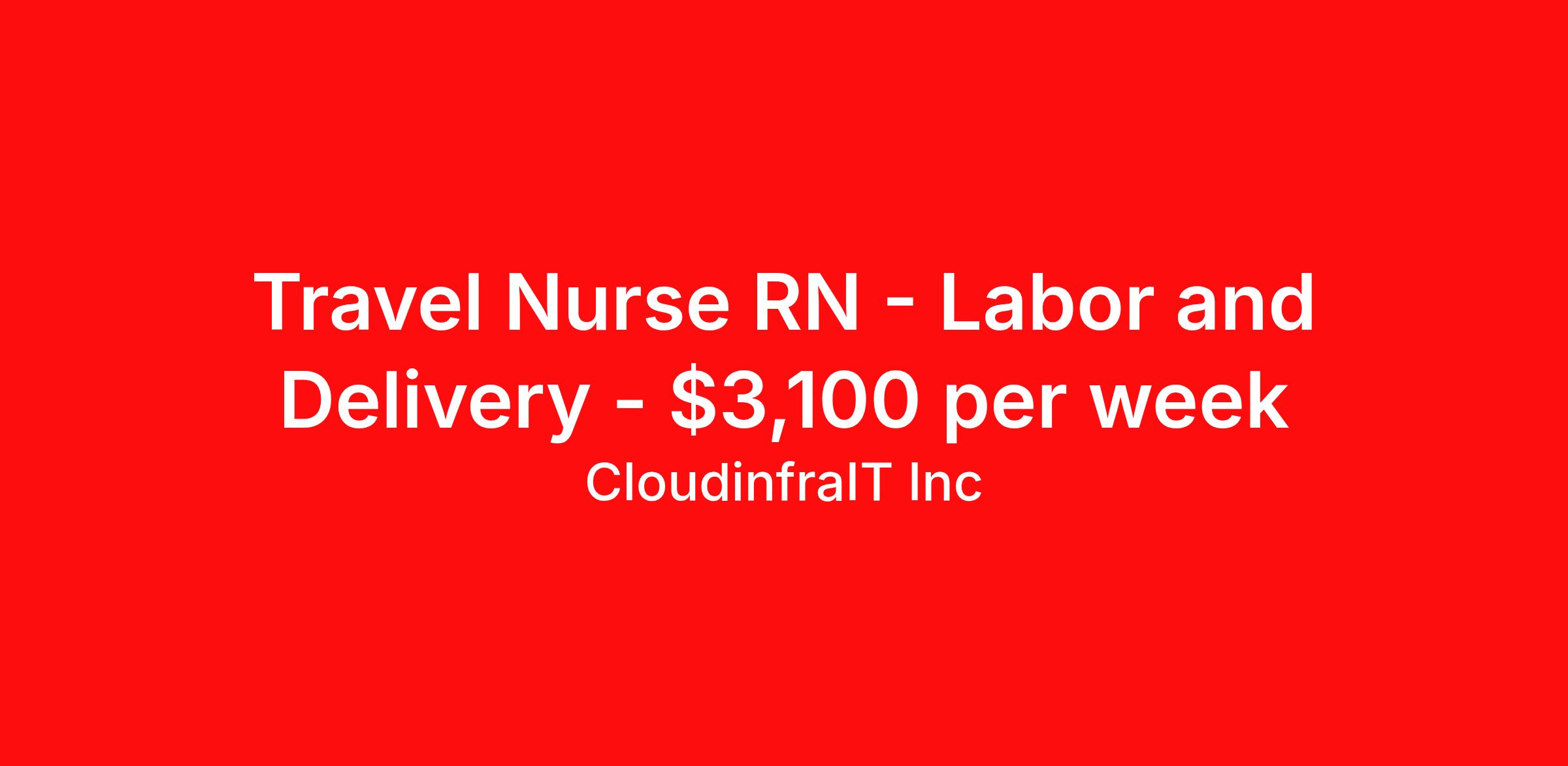 CloudinfraIT Inc is seeking a travel nurse RN Labor and Delivery for a travel nursing job in Scottsbluff, Nebraska. Job Description & Requirements Specialty: Labor and Delivery Discipline: RN Duration: 13 weeks 36 hours per week Shift: 12 hours, days Employment Type: Travel Position: RN – L&D Location: Scottsbluff, NE Contract: 13 Weeks | 36 Hours/Week Shift: Night 5am -5pm Weekly Pay: $3100 Gross ($1854 Taxable $1246 Stipends) Summary: Labor and Delivery, postpartum, and circulation experience required. NICU experience a plus. Must have ACLS, NRP, and BLS. Additional experience preferred in scrubbing in for C-sections, NICU, or pediatrics. Requirements : 2 years experience as Labor and Delivery RN experience Labor and Delivery, postpartum, and circulation experience required. NICU experience a plus. Must have ACLS, NRP, and BLS. Additional experience preferred in scrubbing in for C-sections, NICU, or pediatrics. CloudinfraIT Inc Job ID 294675. Pay package is based on 12 hour shifts and 36 hours per week (subject to confirmation) with tax-free stipend amount to be determined. About CloudinfraIT Inc CloudInfra IT delivers fast, reliable IT and healthcare staffing solutions, connecting top-tier talent with organizations that need to scale, innovate, and deliver exceptional service. With deep industry expertise and advanced sourcing capabilities, we provide highly skilled technology and healthcare professionals who help businesses accelerate digital transformation and healthcare providers enhance patient care. CloudInfra IT ensures you get the right people, at the right time, to drive growth and performance. Benefits Medical benefits Weekly pay