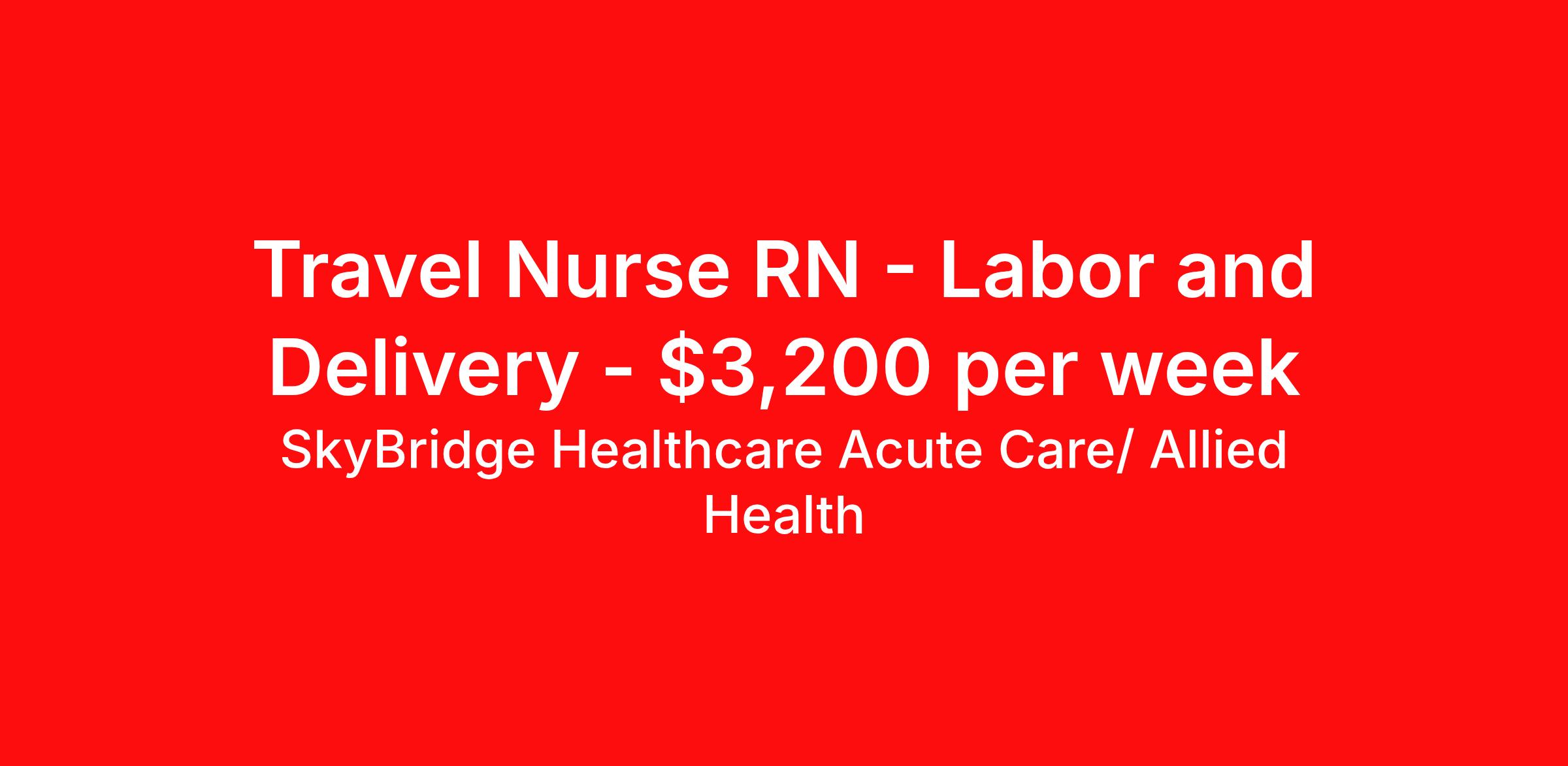 SkyBridge Healthcare Acute Care/ Allied Health is seeking a travel nurse RN Labor and Delivery for a travel nursing job in Fairbanks, Alaska. Job Description & Requirements Specialty: Labor and Delivery Discipline: RN Duration: 13 weeks 36 hours per week Shift: 12 hours, nights Employment Type: Travel SkyBridge Healthcare Acute Care/ Allied Health Job ID NV37704205FA. Pay package is based on 12 hour shifts and 36 hours per week (subject to confirmation) with tax-free stipend amount to be determined. About SkyBridge Healthcare Acute Care/ Allied Health It is our mission at SkyBridge Healthcare to connect professionals within the healthcare community through both genuine relationships and quality work. We understand the demands of healthcare positions which is why we want to give back to Healthcare Professionals who give so much to their communities. We’re partnered with some of the greatest facilities in the nation, therefore we ensure our Healthcare Professionals will receive top-notch treatment every step of the way. Our specialties include Nursing, Allied Health, Laboratory, Therapy, Healthcare Information Technology, and Revenue Cycle. Follow us on social media to stay in the know of our latest company updates and job postings. Benefits Weekly pay Holiday Pay Guaranteed Hours Vision benefits 401k retirement plan License and certification reimbursement Mileage reimbursement Referral bonus Employee assistance programs Medical benefits Life insurance Dental benefits
