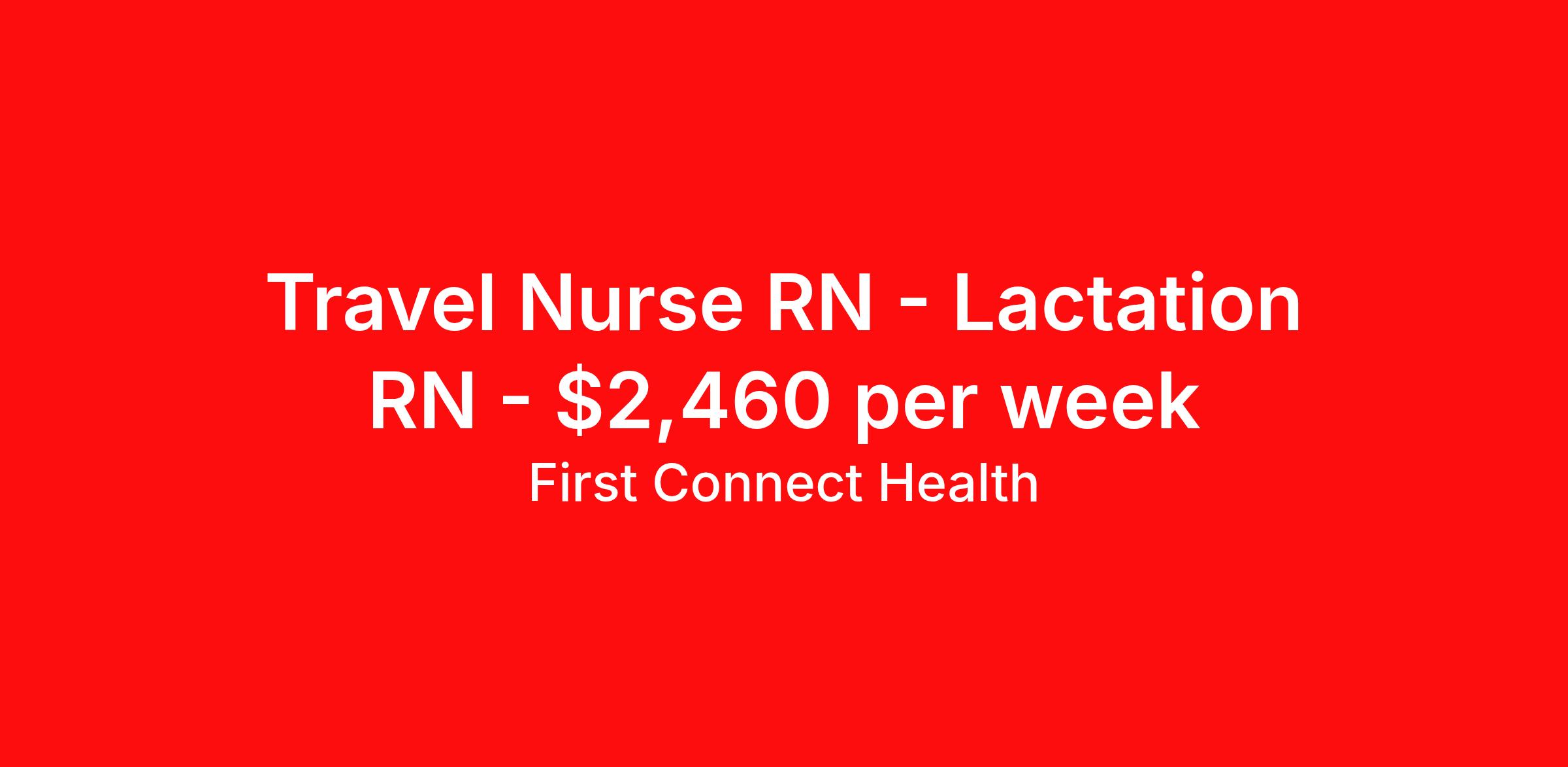 First Connect Health is seeking a travel nurse RN Lactation RN for a travel nursing job in Pittsfield, Massachusetts. Job Description & Requirements Specialty: Lactation RN Discipline: RN Start Date: 04/13/2026 Duration: 13 weeks 40 hours per week Shift: 8 hours, days Employment Type: Travel Lactation Consultant Program Coordinator 1 years experience as an International Board Certified Lactation Consultant (BCLC) - Equivalent Certs NOT accepted [Required] A MINIMUM of 2500 hours as a breast-feeding consultant [REQUIRED] Experience with inpatient lactation programs [required] Outpatient prenatal and postpartum lactation education, consultations and/or teaching experience [required] Meditech Expanse experience [strongly preferred] Certification Requirements BLS (AHA) Board Certified State License Requirements Massachusetts First Connect Health - 65418 Recruiter - Shubham Singh About First Connect Health At First Connect Health , we take pride in being a Joint Commission–certified healthcare staffing agency , headquartered in Newark, New Jersey. This prestigious certification is more than just a seal — it's a reflection of our commitment to excellence, safety, and quality in everything we do. By meeting the rigorous standards set by The Joint Commission, one of the most respected accrediting bodies in healthcare, we've demonstrated that our processes, compliance, and patient care standards are aligned with the highest levels of quality in the industry. But our dedication goes beyond certifications. Nurses choose First Connect Health because: ✅ Trust and Transparency: We foster honest communication, timely updates, and full transparency throughout your placement journey. ✅ Best Pay & Benefits: We offer industry-leading compensation packages, along with benefits that support your career goals. ✅ Flexibility & Choice: Whether you're seeking short-term assignments, long-term contracts, or local opportunities, we provide the flexibility to suit your preferences. ✅ Personalized Support: Our recruiters take the time to understand your needs, guiding you with care, respect, and responsiveness at every step. When you work with First Connect Health, you're not just another number — you're a valued professional. Join a team that’s focused on your success, your well-being, and your future in healthcare. Benefits Medical benefits Sick pay 401k retirement plan Weekly pay Referral bonus