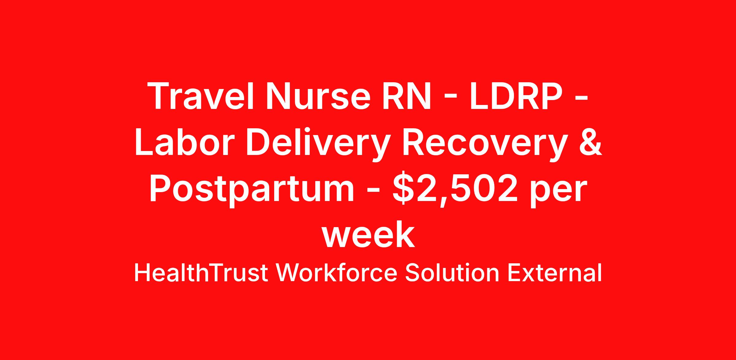 HealthTrust Workforce Solution External is seeking a travel nurse RN LDRP - Labor Delivery Recovery & Postpartum for a travel nursing job in Bentonville, Arkansas. Job Description & Requirements Specialty: LDRP - Labor Delivery Recovery & Postpartum Discipline: RN Duration: 13 weeks 36 hours per week Shift: 12 hours, days, nights Employment Type: Travel Must start within 2 weeks of accepting Gross Weekly: $ 2,502.25 | Hourly: $34.90 | Weekly Stipends: $ 1,245.85 ⌚ Shift: 3x12 Charting: Meditech Requirements & Experience: 2 Years Experience BLS - ACLS NRP 50 Miles To Be Considered Travel No locals
