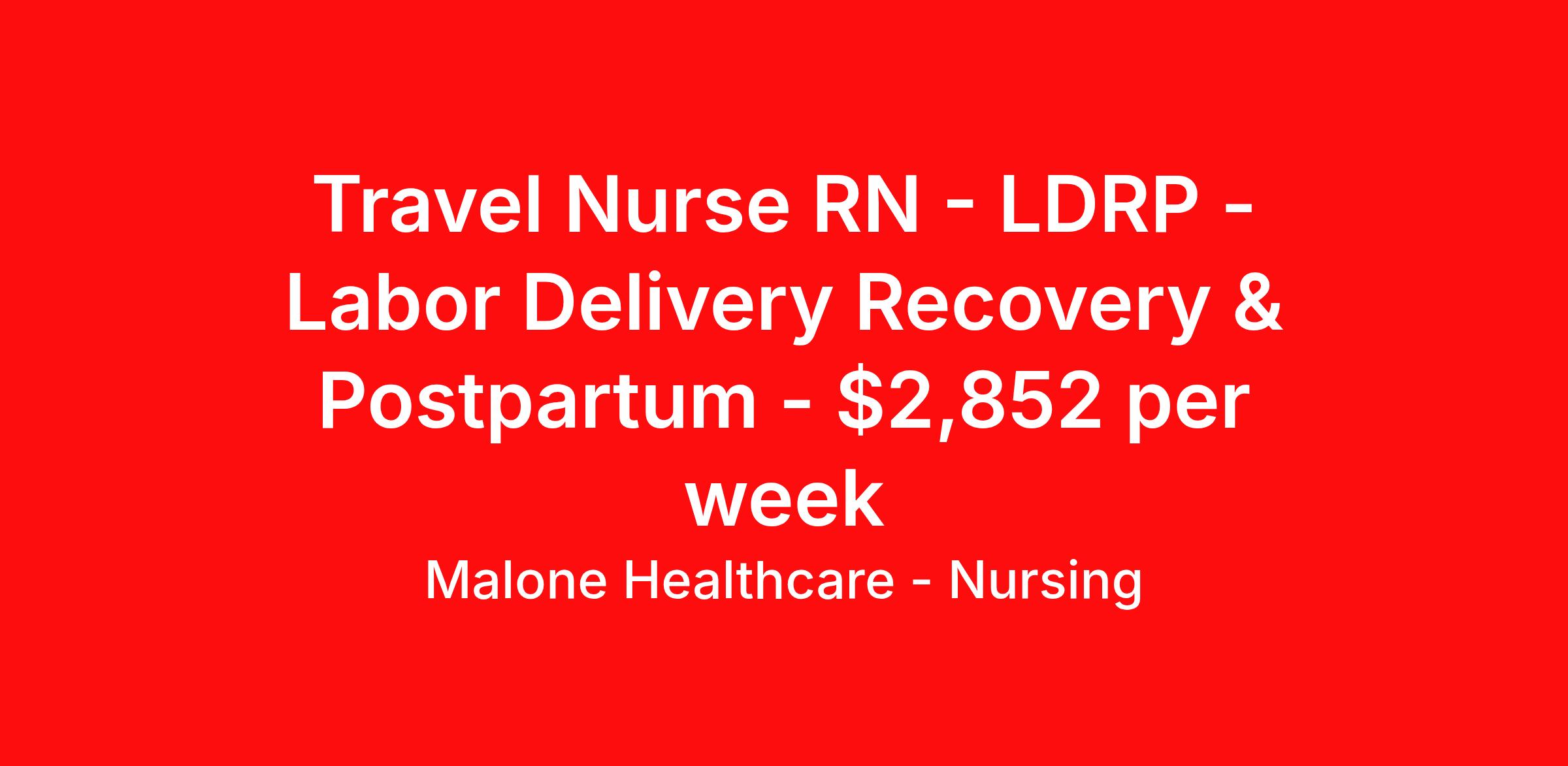 Malone Healthcare - Nursing is seeking a travel nurse RN LDRP - Labor Delivery Recovery & Postpartum for a travel nursing job in Silverdale, Washington. Job Description & Requirements Specialty: LDRP - Labor Delivery Recovery & Postpartum Discipline: RN Start Date: 04/04/2026 Duration: 13 weeks 36 hours per week Shift: 12 hours, days Employment Type: Travel LDRP RN – Travel Contract Washington Days | 7AM–7PM Every Other Weekend We are seeking an experienced LDRP Registered Nurse for a travel assignment in a busy Birthing Center / Mother Baby unit . Unit Details 34 LDRP Beds 2 OR Suites for C-Sections 2 Triage Beds 14 Postpartum Beds 150–180 Births Monthly Patient Ratios Labor & Delivery: 1:2 Postpartum Couplet Care: 1:3–4 Requirements Active RN License Minimum 2 years LDRP experience Previous travel experience required BLS, ACLS, NRP required Intermediate/Advanced Fetal Heart Monitoring preferred Required Skills Attend deliveries independently Circulate in C-Sections Assist with catching baby & newborn transition Provide routine postpartum couplet care Comfortable titrating Magnesium, Pitocin, and Insulin Unit Support 24/7 OB Hospitalist 24/7 Neonatal Nurse Practitioner 24/7 OB Anesthesia Surgical Tech coverage Additional Info Block scheduling available when requested No floating outside the department EPIC EMR Standby response time: 45 minutes Important: No first-time travelers 2 years of references required with submission ✅ Apply today to learn more about this opportunity! About Malone Healthcare - Nursing With a commitment to providing a higher standard of service and experience in patient care, Malone Healthcare places expert nurses and allied health professionals in rewarding careers throughout the United States. As a leading healthcare staffing agency, Malone’s focus on compliance and integrity translates to a seamless experience for our team members and partner facilities. When you work with Malone Healthcare, you can rely on over 50 years of proven experience placing exceptional professionals in quality healthcare settings. Benefits Weekly pay Holiday Pay Guaranteed Hours Continuing Education 401k retirement plan Pet insurance Referral bonus Medical benefits Dental benefits Vision benefits License and certification reimbursement Life insurance