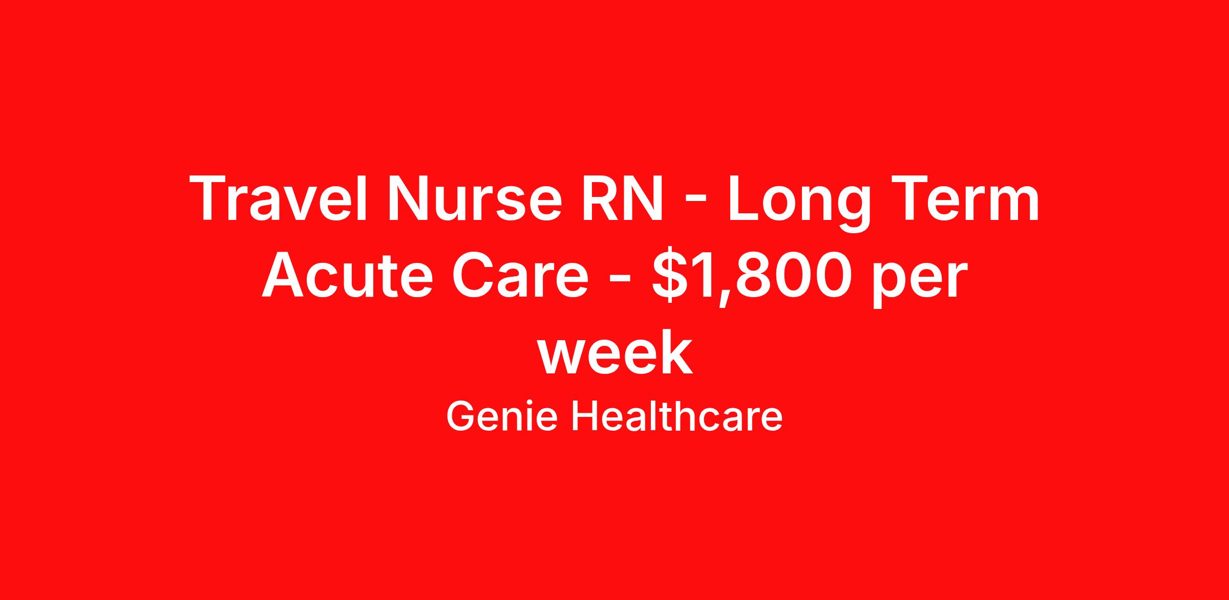 Genie Healthcare is seeking a travel nurse RN Long Term Acute Care for a travel nursing job in Florence, South Carolina. Job Description & Requirements Specialty: Long Term Acute Care Discipline: RN Start Date: 04/06/2026 Duration: 13 weeks 36 hours per week Shift: 12 hours, days, nights Employment Type: Travel About Genie Healthcare Genie Healthcare is one of the fastest growing Nurse Travel Agencies in the USA. Genie serves hundreds of facilities and has over 4000 current travel RN contracts open at any given time. Genie provides travel RN’s flexibility, support, top pay scale, housing and the 1 rated, multi-state health insurance coverage. Genie Healthcare carries with it a commitment to providing a comprehensive level of service and quality care. Growing from a small team of eager recruiters to a company with satisfied clients in nearly every corner of the nation, delivering excellence in patient and customer care is the key to Genie’s success. The management team has 20 years of experience in workforce solutions and staffing in medical and non-medical fields, roles ranging from Clerical job to Cardiologist to software developer to CEO.