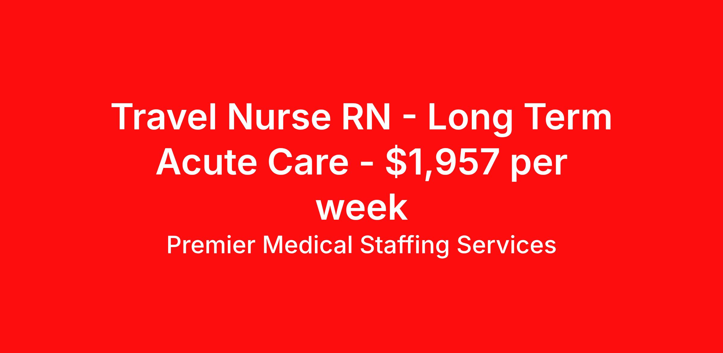 Premier Medical Staffing Services is seeking a travel nurse RN Long Term Acute Care for a travel nursing job in Indianapolis, Indiana. Job Description & Requirements Specialty: Long Term Acute Care Discipline: RN Start Date: 04/13/2026 Duration: 13 weeks 36 hours per week Shift: 12 hours, days Employment Type: Travel Assignment 625648 About Premier Medical Staffing Services Premier Medical Staffing Services, LLC is a nationally expanding healthcare staffing firm for healthcare professionals and companies. We understand our clients’ need for highly qualified, expertly trained medical professionals and are passionate about helping clinicians find employment opportunities that fit their personality and needs. Able to accommodate the ever-changing needs of the healthcare landscape, we offer per-diem, contract and direct hire placements to support the unique needs of each industry sector. Premier Medical Staffing Services is Joint Commission Certified, a Military Spouse Employment Partner and is certified as a Women’s Business Enterprise. We are proudly nurse owned.
