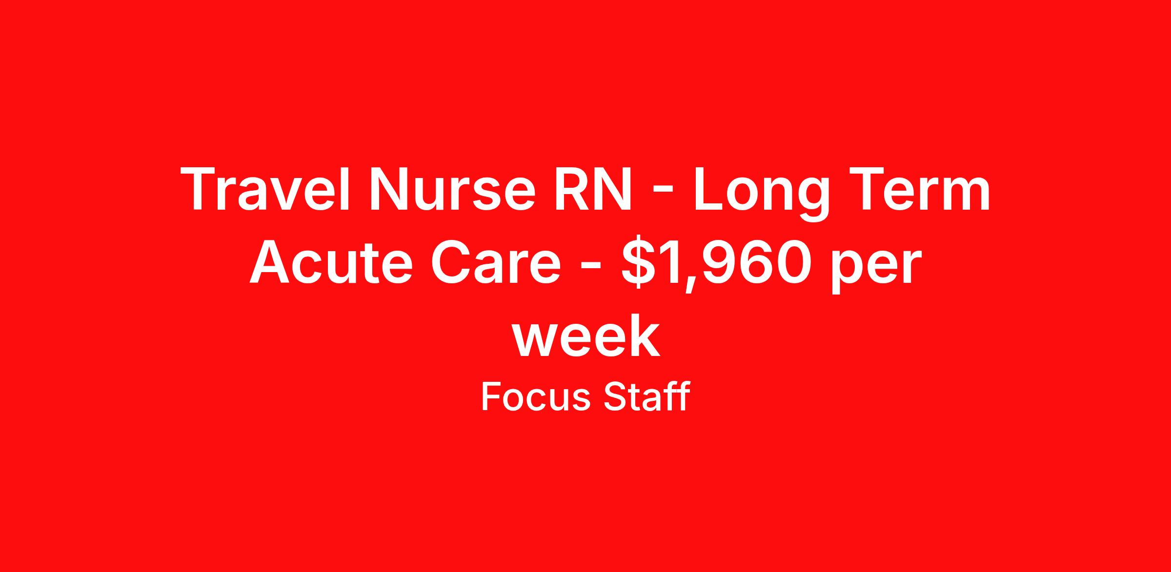 Focus Staff is seeking a travel nurse RN Long Term Acute Care for a travel nursing job in Panama City, Florida. Job Description & Requirements Specialty: Long Term Acute Care Discipline: RN Start Date: 03/30/2026 Duration: 13 weeks 36 hours per week Shift: 12 hours, nights Employment Type: Travel Focus Staff is seeking a Long Term Acute Care Registered Nurse for a travel contract in Panama City, FL. The ideal candidate will have at least 1 year of experience in a LTAC setting. Contract Length: 13 Weeks Start Date: 03/30/2026 Shift: 3x12 Nights Benefits for Travel LTAC RNs: Health insurance Vision insurance Dental insurance Life insurance Licensure reimbursement Travel reimbursement Relocation assistance 401(k) 401(k) matching Competitive pay Referral bonus Holiday bonus Requirements: 1 Year of Experience, 2 Preferred Valid FL RN License BLS (Basic Life Support) ACLS Eligible to work in the United States About Focus Staff: Focus Staff is a traveler-first nurse and healthcare staffing agency! We prioritize the needs of our travelers, giving you complete control over your journey. Our mission is to help you create the life you love, explore the country and do what you do best, help others. Interested in becoming a traveler with Focus Staff? Discover why travelers choose us, apply today! All-Star Status: Dallas 100 (Multiple Years in a Row) Inc. 5000 Middle Market 50 Certified by The Joint Commission Best of Staffing Talent Satisfaction 2022 Best of Staffing Client Satisfaction 2022 Fastest-Growing US Staffing Firms 2017 If you’re seeking a Travel Long Term Acute Care Nurse position in Panama City, FL and are looking to work with an agency that will listen to your needs and career goals, then Focus Staff is the right place to be. We are proud of our ability to build relationships with all our healthcare professionals, whether you’re seeking travel assignments, PR or permanent positions. We Offer: Immediate Openings Weekly Pay through Direct Deposits Flexible Schedules Day and Night Shifts Available Competitive Compensation Guaranteed Hours (based on employer) Travel Assistance Dedicated/Responsive Recruiters Day One Medical, Dental, Vision and Life Insurance Generous Housing Stipend 24/7 Support Company Provided Housing Options Referral Bonus ($600) Loyalty Bonus ($1,200) Discounts/Coupons to Hotels Access to Jobs in all 50 States Painless Credentialing Process U.S.A.-based Company Equal Opportunity Employer Joint Commission Certified Licensure Reimbursement Pet-Friendly Access to Discounts, Rewards, and more Other Information: Job Title: Travel LTAC Nurse Employment Time: Contract/Travel Date Posted: 03/11/2026 01:42:59 PM Valid Through: 06/29/2026 Job City: Panama City Job State: FL Job Country: USA Shift: 3x12 Nights Job ID: a0xVt00000Jce6OIAR Hiring Organization: Focus Staff Focus Staff is an EEO/AA (Equal Employment Opportunity and Affirmative Action) Employer. Estimated pay package based on bill rate at time job was posted. Bill rates can change frequently and without notice. Exact pay package may vary based on several factors, including, but not limited to, guaranteed hours, travel distance, demand, experience, etc. Traveling Registered Nurse, Travel, LTAC, RN – LTAC, Contract, Travel, Traveling Nursing, Assignment, Registered LTAC, Long Term Acute Care Nurse, LTAC RN, Acute Care Nurse, LTAC Travel Nurse, Healthcare RN, LTAC Nursing, Nurse RN, RN Nurse, Contract RN Focus Staff Job ID a0xVt00000Jce6OIAR. Pay package is based on 12 hour shifts and 36 hours per week (subject to confirmation) with tax-free stipend amount to be determined. Posted job title: Travel LTAC RN - Long Term Acute Care Registered Nurse About Focus Staff Your Journey, Our Focus. Travel Confidently, Care Boldly with Focus Staff. At Focus Staff, we’re here to make your travel healthcare career rewarding, seamless, and stress-free. Whether you’re a travel nurse, therapist, or allied health professional, we take care of the details so you can focus on what you do best — caring for others. Our mission is simple: to help healthcare heroes like you thrive, no matter where your journey takes you. With thousands of job opportunities across all 50 states, our dedicated recruiters work closely with you to match you to the right assignment, based on what matters most to you — pay, location, benefits, or career growth. From day one, you’ll enjoy premium benefits like medical coverage that bridges between assignments, 401K matching, travel and licensing reimbursements, and personalized housing support. Plus, our team is here for you 24/7, with clinical support available whenever you need guidance or backup. At Focus Staff, we believe in making every assignment a smooth, comfortable, and empowering experience. Let’s make your next adventure your best one yet.