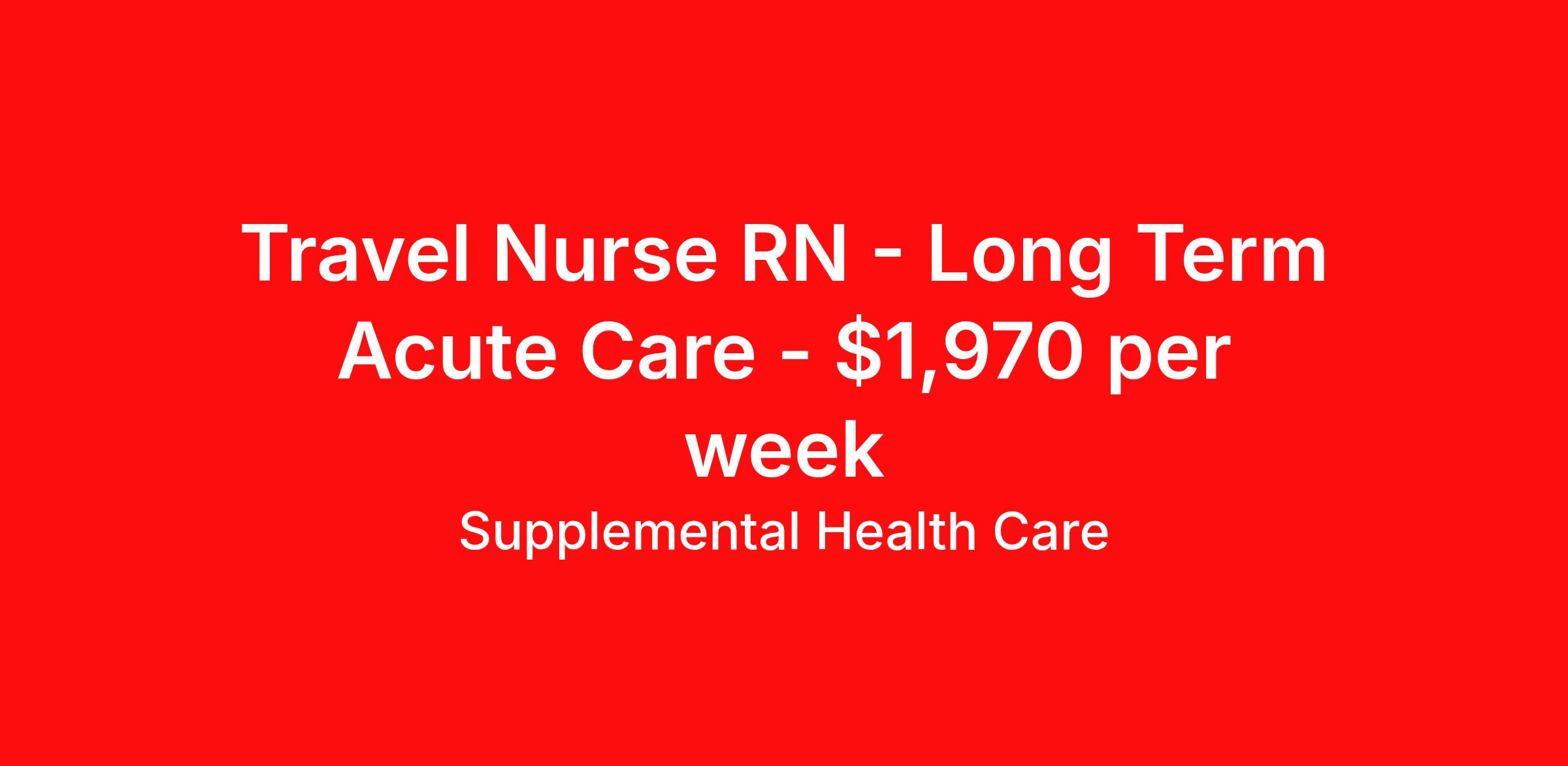Supplemental Health Care is seeking a travel nurse RN Long Term Acute Care for a travel nursing job in Rochelle Park, New Jersey. Job Description & Requirements Specialty: Long Term Acute Care Discipline: RN Start Date: ASAP Duration: 13 weeks 36 hours per week Shift: 12 hours, nights Employment Type: Travel Job Description: Supplemental Health Care is hiring Registered Nurses for contract assignments at a partnering Long Term Acute Care Facility in Rochelle Park, New Jersey. Whether you’re looking to travel or stay local, we’re committed to helping LTAC RNs find the right fit with top hospitals across the country. With more than 40 years of experience in healthcare staffing, Supplemental Health Care offers reliable support, competitive pay, and great benefits every step of the way. Qualifications: Active New Jersey RN License or Compact State Nursing License 2 years of recent clinical nursing experience Previous LTAC experience preferred American Heart Association BLS ACLS preferred LTAC RN Contract Details $1,764 - $1,970 per week* NOC shift available 13-week contract with possibility of extension RN will provide nursing care within their scope of practice and in accordance with the standards of the facility *Estimated weekly payment may include both taxable wages and tax-free reimbursements for meals, housing, and incidentals. Please speak with a recruiter for details. The average stay at an LTAC facility is 25 days and RNs working there often care for their patients from admission to discharge. We understand that you make important connections with your patients and offer the support you need while on assignment to provide the best care possible. Apply today to get started with this Registered Nurse contract opportunity, or talk to our team about the full range of RN opportunities available. What We Offer: Full medical, dental, vision, life, and even pet insurance! Round the clock support. No matter where you are or what time it is, Supplemental Health Care is standing by. SHC's Share the Care referral program is the most dynamic, profitable referral program in the industry. 401(k) Retirement Savings Program with a wide range of investment options. Discounted and free online access to CEU courses through Supplemental University. Supplemental Health Care is an Equal Opportunity Employer. All candidates, including veterans and those with disabilities, are encouraged to apply. SHC will consider for employment qualified applicants with criminal histories in a manner consistent with the requirements of applicable local, state, or federal law. To learn more, visit www.shccares.com/eeo Supplemental Health Care Job ID 1470374. Pay package is based on 12 hour shifts and 36 hours per week (subject to confirmation) with tax-free stipend amount to be determined. Posted job title: LTAC RN - Registered Nurse About Supplemental Health Care At Supplemental Health Care, a simple belief in the power of caring guides a unique commitment to world-class service in healthcare staffing. For 40 years, we’ve supported talented professionals pursuing their life calling in hospitals, schools, home health, corrections, behavioral health, and other settings. At SHC, we inspire vital connections and enrich lives and inspire better outcomes. As recipients of the Best in Staffing Awards for both Client and Talent, Supplemental Health Care is proud to be among only 2% of staffing companies singled out for the distinction based on the real feedback of our employees and the clients we serve. SHC has also earned The Joint Commission’s Gold Seal of Approval and is named among the Largest Health Care Staffing companies in the United States by Staffing Industry Analysts. We are also thrilled to recognize our very own SLP, Dr. Kelly Byrd as the American Staffing Association 2024 National Staffing Employee of the Year and Health Care Sector All-Star. We’re honored to connect Dr. Byrd to employment, share her incredible story, and support her family literacy nonprofit. For everyone that we serve, SHC is the place where caring hearts thrive. Benefits Referral bonus Benefits start day 1 401k retirement plan Continuing Education Discount program Health savings account
