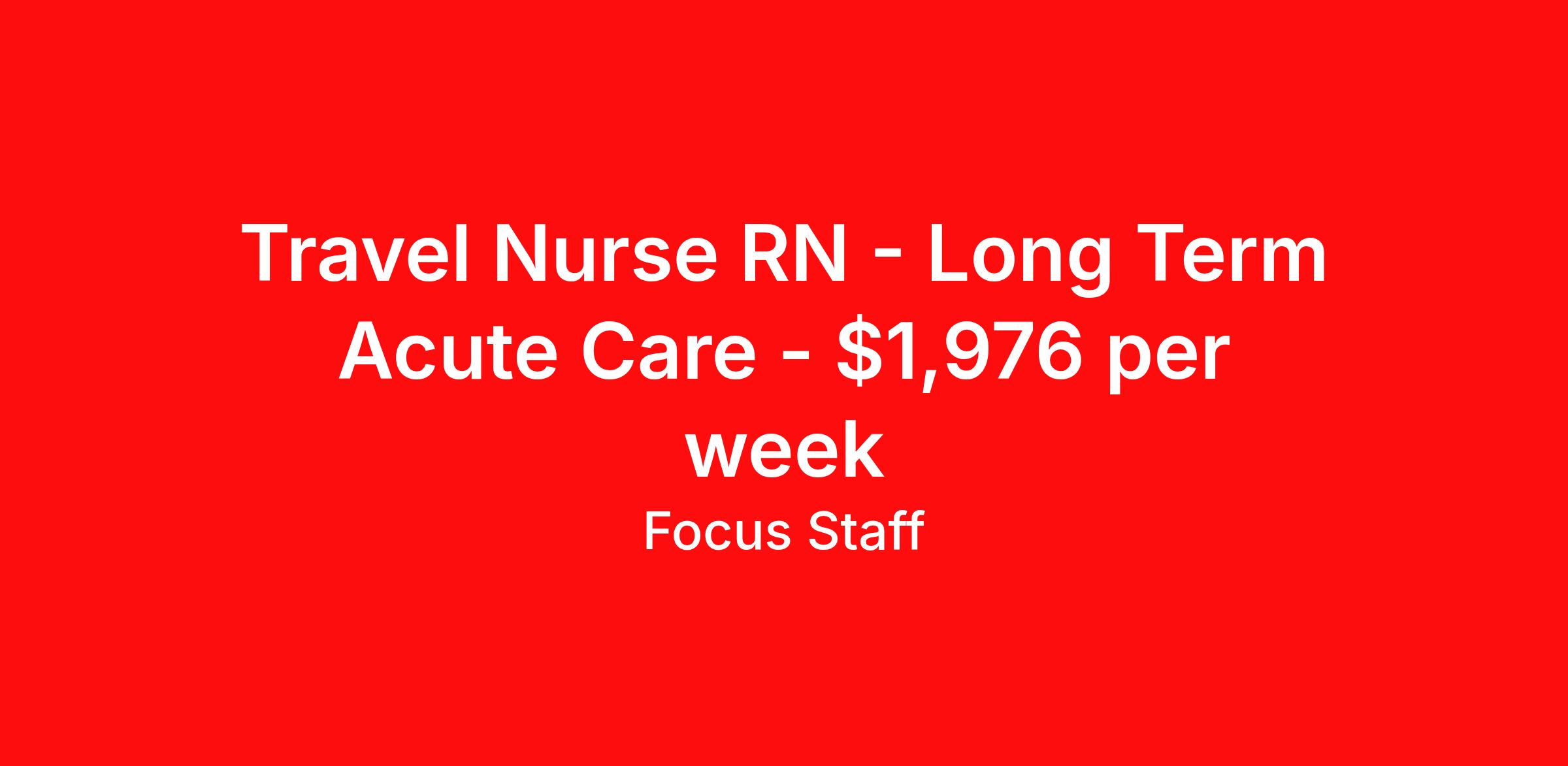 Focus Staff is seeking a travel nurse RN Long Term Acute Care for a travel nursing job in Phoenix, Arizona. Job Description & Requirements Specialty: Long Term Acute Care Discipline: RN Start Date: 04/06/2026 Duration: 13 weeks 36 hours per week Shift: 12 hours, nights Employment Type: Travel Focus Staff is seeking a Long Term Acute Care Registered Nurse for a travel contract in Phoenix, AZ. The ideal candidate will have at least 1 year of experience in a LTAC setting. Contract Length: 13 Weeks Start Date: 04/06/2026 Shift: 3x12 Nights Benefits for Travel LTAC RNs: Health insurance Vision insurance Dental insurance Life insurance Licensure reimbursement Travel reimbursement Relocation assistance 401(k) 401(k) matching Competitive pay Referral bonus Holiday bonus Requirements: 1 Year of Experience, 2 Preferred Valid AZ RN License BLS (Basic Life Support) ACLS Eligible to work in the United States About Focus Staff: Focus Staff is a traveler-first nurse and healthcare staffing agency! We prioritize the needs of our travelers, giving you complete control over your journey. Our mission is to help you create the life you love, explore the country and do what you do best, help others. Interested in becoming a traveler with Focus Staff? Discover why travelers choose us, apply today! All-Star Status: Dallas 100 (Multiple Years in a Row) Inc. 5000 Middle Market 50 Certified by The Joint Commission Best of Staffing Talent Satisfaction 2022 Best of Staffing Client Satisfaction 2022 Fastest-Growing US Staffing Firms 2017 If you’re seeking a Travel Long Term Acute Care Nurse position in Phoenix, AZ and are looking to work with an agency that will listen to your needs and career goals, then Focus Staff is the right place to be. We are proud of our ability to build relationships with all our healthcare professionals, whether you’re seeking travel assignments, PR or permanent positions. We Offer: Immediate Openings Weekly Pay through Direct Deposits Flexible Schedules Day and Night Shifts Available Competitive Compensation Guaranteed Hours (based on employer) Travel Assistance Dedicated/Responsive Recruiters Day One Medical, Dental, Vision and Life Insurance Generous Housing Stipend 24/7 Support Company Provided Housing Options Referral Bonus ($600) Loyalty Bonus ($1,200) Discounts/Coupons to Hotels Access to Jobs in all 50 States Painless Credentialing Process U.S.A.-based Company Equal Opportunity Employer Joint Commission Certified Licensure Reimbursement Pet-Friendly Access to Discounts, Rewards, and more Other Information: Job Title: Travel LTAC Nurse Employment Time: Contract/Travel Date Posted: 03/12/2026 03:58:25 PM Valid Through: 07/06/2026 Job City: Phoenix Job State: AZ Job Country: USA Shift: 3x12 Nights Job ID: a0xVt00000JhQdsIAF Hiring Organization: Focus Staff Focus Staff is an EEO/AA (Equal Employment Opportunity and Affirmative Action) Employer. Estimated pay package based on bill rate at time job was posted. Bill rates can change frequently and without notice. Exact pay package may vary based on several factors, including, but not limited to, guaranteed hours, travel distance, demand, experience, etc. Traveling Registered Nurse, Travel, LTAC, RN – LTAC, Contract, Travel, Traveling Nursing, Assignment, Registered LTAC, Long Term Acute Care Nurse, LTAC RN, Acute Care Nurse, LTAC Travel Nurse, Healthcare RN, LTAC Nursing, Nurse RN, RN Nurse, Contract RN Focus Staff Job ID a0xVt00000JhQdsIAF. Pay package is based on 12 hour shifts and 36 hours per week (subject to confirmation) with tax-free stipend amount to be determined. Posted job title: Travel LTAC RN - Long Term Acute Care Registered Nurse About Focus Staff Your Journey, Our Focus. Travel Confidently, Care Boldly with Focus Staff. At Focus Staff, we’re here to make your travel healthcare career rewarding, seamless, and stress-free. Whether you’re a travel nurse, therapist, or allied health professional, we take care of the details so you can focus on what you do best — caring for others. Our mission is simple: to help healthcare heroes like you thrive, no matter where your journey takes you. With thousands of job opportunities across all 50 states, our dedicated recruiters work closely with you to match you to the right assignment, based on what matters most to you — pay, location, benefits, or career growth. From day one, you’ll enjoy premium benefits like medical coverage that bridges between assignments, 401K matching, travel and licensing reimbursements, and personalized housing support. Plus, our team is here for you 24/7, with clinical support available whenever you need guidance or backup. At Focus Staff, we believe in making every assignment a smooth, comfortable, and empowering experience. Let’s make your next adventure your best one yet.