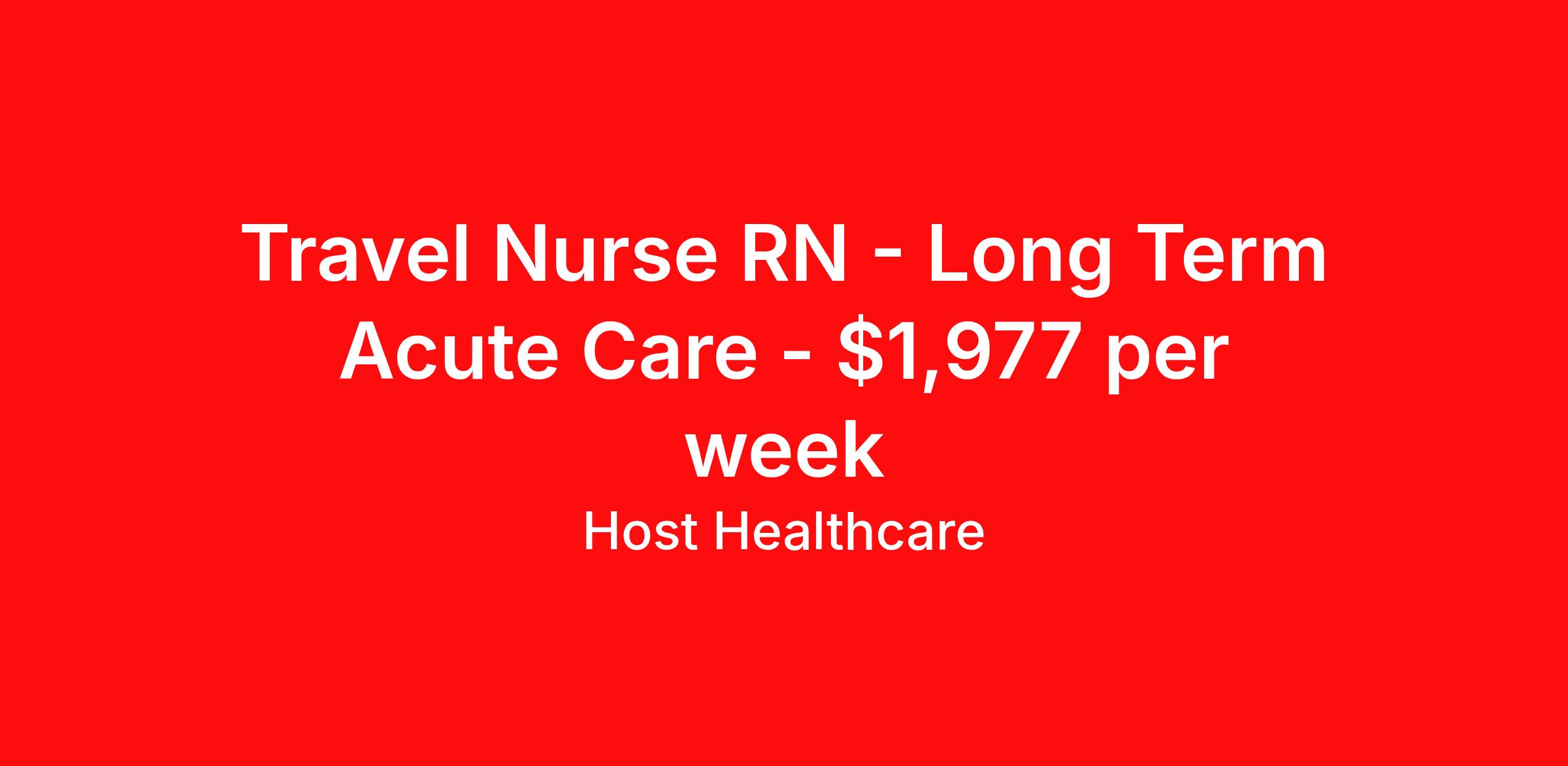 Host Healthcare is seeking a travel nurse RN Long Term Acute Care for a travel nursing job in Red Cloud, Nebraska. Job Description & Requirements Specialty: Long Term Acute Care Discipline: RN Start Date: 04/06/2026 Duration: 13 weeks 36 hours per week Shift: 12 hours, days Employment Type: Travel Host Healthcare Job ID a1fVJ000007vdF7YAI. Pay package is based on 12 hour shifts and 36 hours per week (subject to confirmation) with tax-free stipend amount to be determined. Posted job title: RN - Long Term Acute Care About Host Healthcare At Host Healthcare, we provide a truly comfortable experience as you explore your travel nursing, therapy, or allied career. We make your travel healthcare journey easy by taking care of all the details, so you don’t have to. We are on a mission to help others live better and we do this by helping the healers of the world be as comfortable as possible. With access to tens of thousands of travel nursing, therapy, and allied jobs in all 50 states, our responsive and friendly recruiters find your dream position based on what’s important to you. During your assignment, get access to premium benefits, including Day 1 medical that continues up to 30 days between assignments, 401K matching, travel reimbursements, dedicated housing support, and more. We also offer 24/7 support from our team and access to our on-staff clinicians so you can feel comfortable and confident throughout your entire assignment. Travel comfortably with Host Healthcare. Benefits Referral bonus School loan reimbursement Vision benefits Wellness and fitness programs Company provided housing options License and certification reimbursement Life insurance Medical benefits Mileage reimbursement Pet insurance Discount program Employee assistance programs Guaranteed Hours Health savings account Holiday Pay 401k retirement plan Continuing Education Dental benefits