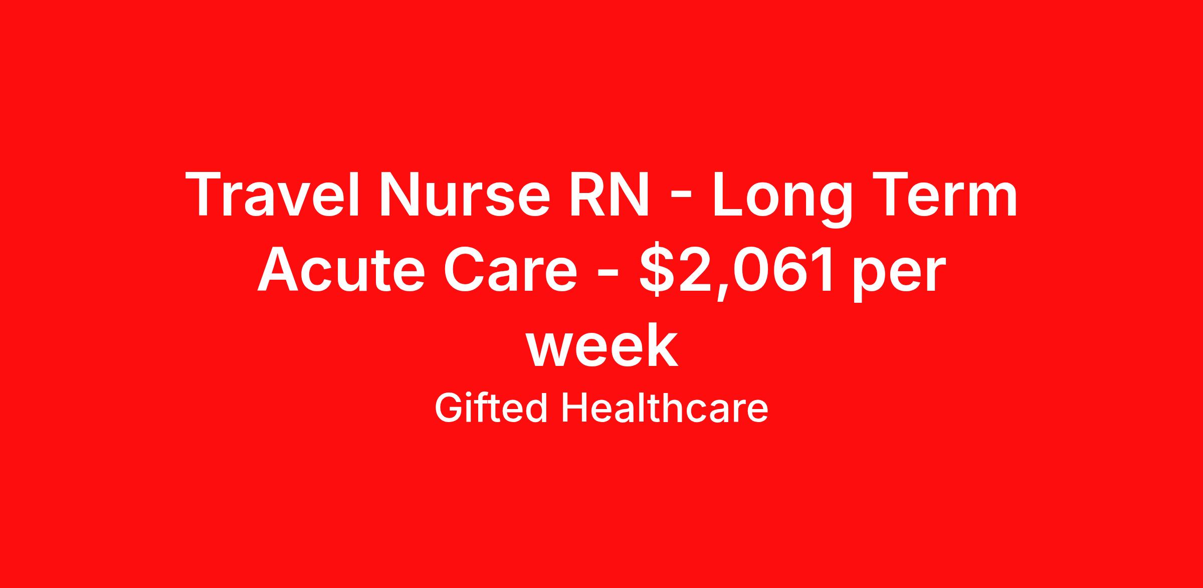 Gifted Healthcare is seeking a travel nurse RN Long Term Acute Care for a travel nursing job in Jackson, Tennessee. Job Description & Requirements Specialty: Long Term Acute Care Discipline: RN Duration: 13 weeks 36 hours per week Shift: 12 hours, nights Employment Type: Travel Requirements: • Experience with vents, trachs, and critical drips • 1 year of specialty experience • 2 years of RN experience for travel opportunities Benefits: • Guaranteed Pay: Never worry about canceled shifts due to low census • Premium Overtime: Earn double your hourly rate for overtime on travel assignments (excludes local, PRN, CA, Govt assignments) • Weekly Pay: Get paid weekly Contact us for more information! Gifted Healthcare Job ID 4367e. Pay package is based on 12 hour shifts and 36 hours per week (subject to confirmation) with tax-free stipend amount to be determined. About Gifted Healthcare Gifted Healthcare is an award-winning staffing agency that offers career opportunities to clinicians, healthcare leaders, and school-based professionals. Gifted provides Travel, Local, Per Diem, Government, and School-Based assignments as well as Interim Leadership services at premier facilities across the United States. We strive to elevate human connection in the delivery of care, and our team is committed to supporting you every step of the way in order to help you succeed on your terms. Joining Gifted comes with benefits like schedule flexibility, competitive pay, and the opportunity to gain valuable clinical experience in top-notch facilities. As a Gifted clinician, you can trust that we will invest in your career, fight for your well-being, and put your needs first. Apply with Gifted Healthcare today for access to exceptional job opportunities, day-one benefits, and 24/7 support. Our vision is to elevate the human connection in the delivery of care we provide to our clinicians. We serve your evolving needs through innovation, community, compassion, and service. Gifted is here for you every step of the way to help you succeed on your terms. Working with Gifted comes with benefits like schedule flexibility, competitive pay, and the opportunity to gain valuable clinical experience in top-notch facilities. Benefits Weekly pay Guaranteed Hours Pet insurance Wellness and fitness programs Referral bonus Medical benefits Dental benefits Vision benefits Benefits start day 1
