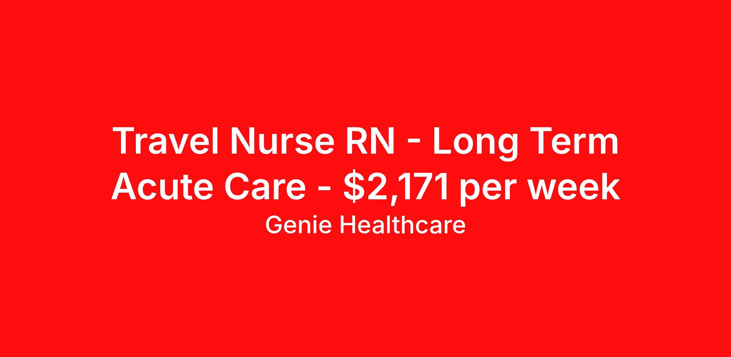 Genie Healthcare is seeking a travel nurse RN Long Term Acute Care for a travel nursing job in Joplin, Missouri. Job Description & Requirements Specialty: Long Term Acute Care Discipline: RN Start Date: 04/06/2026 Duration: 13 weeks 36 hours per week Shift: 12 hours, nights Employment Type: Travel 1 year of LTAC or critical care experience. BLS required. ACLS required. Must live over 50 miles from facility for full travel rate. ASAP start. About Genie Healthcare Genie Healthcare is one of the fastest growing Nurse Travel Agencies in the USA. Genie serves hundreds of facilities and has over 4000 current travel RN contracts open at any given time. Genie provides travel RN’s flexibility, support, top pay scale, housing and the 1 rated, multi-state health insurance coverage. Genie Healthcare carries with it a commitment to providing a comprehensive level of service and quality care. Growing from a small team of eager recruiters to a company with satisfied clients in nearly every corner of the nation, delivering excellence in patient and customer care is the key to Genie’s success. The management team has 20 years of experience in workforce solutions and staffing in medical and non-medical fields, roles ranging from Clerical job to Cardiologist to software developer to CEO.