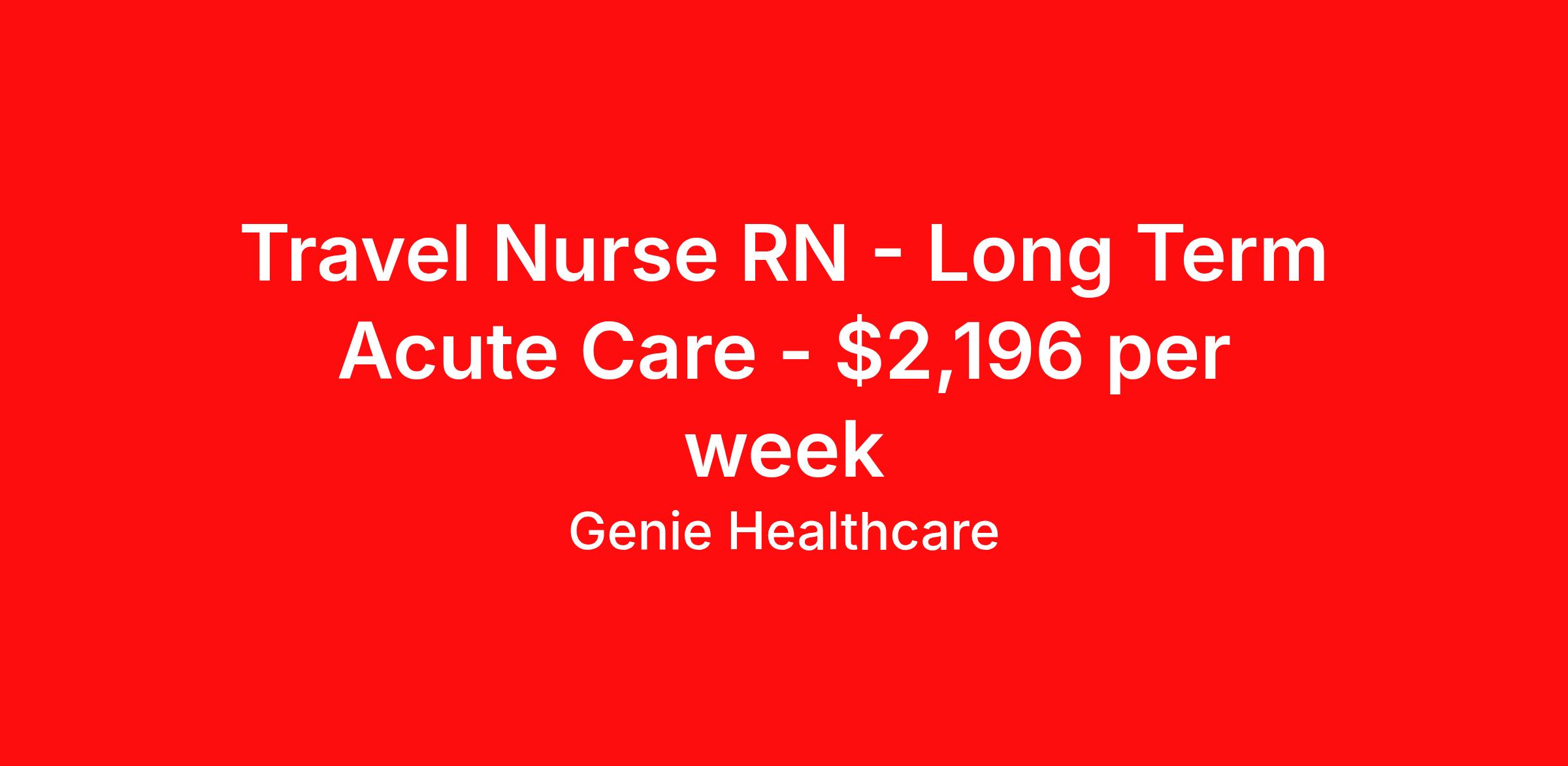 Genie Healthcare is seeking a travel nurse RN Long Term Acute Care for a travel nursing job in Tulsa, Oklahoma. Job Description & Requirements Specialty: Long Term Acute Care Discipline: RN Start Date: 04/06/2026 Duration: 13 weeks 36 hours per week Shift: 12 hours, nights Employment Type: Travel About Genie Healthcare Genie Healthcare is one of the fastest growing Nurse Travel Agencies in the USA. Genie serves hundreds of facilities and has over 4000 current travel RN contracts open at any given time. Genie provides travel RN’s flexibility, support, top pay scale, housing and the 1 rated, multi-state health insurance coverage. Genie Healthcare carries with it a commitment to providing a comprehensive level of service and quality care. Growing from a small team of eager recruiters to a company with satisfied clients in nearly every corner of the nation, delivering excellence in patient and customer care is the key to Genie’s success. The management team has 20 years of experience in workforce solutions and staffing in medical and non-medical fields, roles ranging from Clerical job to Cardiologist to software developer to CEO.