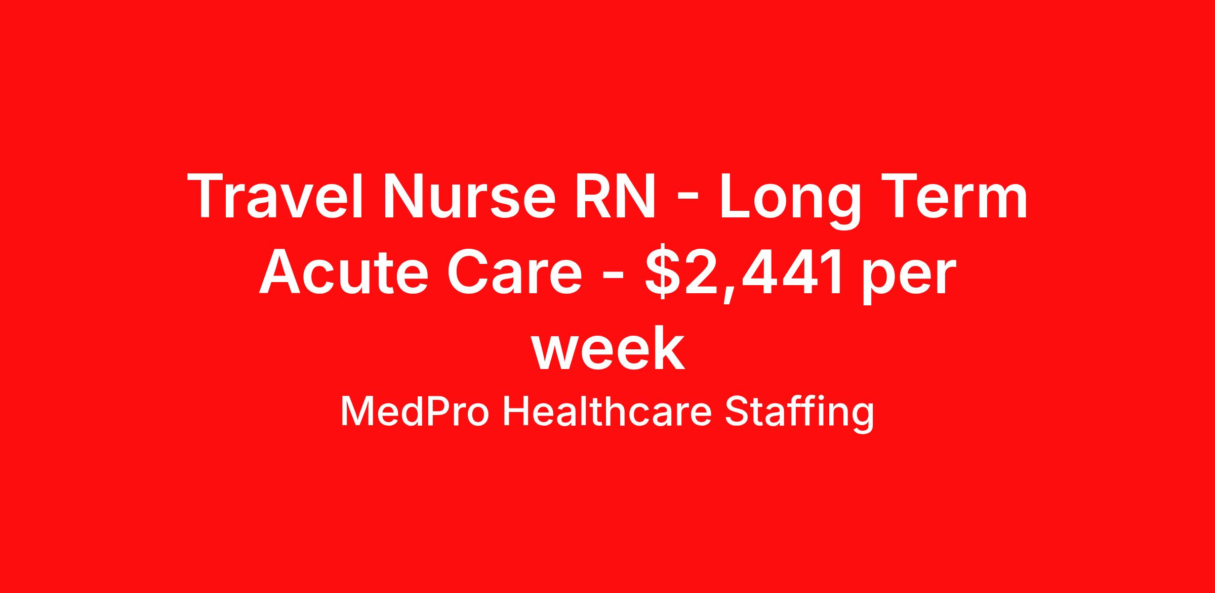 MedPro Healthcare Staffing is seeking a travel nurse RN Long Term Acute Care for a travel nursing job in Middlebury, Vermont. Job Description & Requirements Specialty: Long Term Acute Care Discipline: RN Start Date: 04/06/2026 Duration: 13 weeks 40 hours per week Shift: 8 hours, evenings Employment Type: Travel MedPro Healthcare Staffing , a Joint Commission-certified staffing agency, is seeking a quality Long Term Acute Care registered nurse for a travel assignment with one of our top healthcare clients. Requirements Active RN License Degree from accredited nursing program BLS & ACLS Certifications Eighteen months of recent experience in an Long Term Acute Care setting Experience with Vents, Trachs, Drips, EG Tubes and able to read Tele-strips Other requirements to be determined by our client facility Benefits Weekly pay and direct deposit Full coverage of all credentialing fees Private housing or housing allowance Group Health insurance for you and your family Company-paid life and disability insurance Travel reimbursement 401(k) matching Unlimited Referral Bonuses up to $1,000 Duties Responsibilities As part of the LTAC unit, Long Term Acute Care Nurses (RN) are responsible for caring for patients who require extended medical care. Provide care for 5-6 patients. Adjust and perform in fast paced environment Keep up with many admissions and discharges Be able to monitor and administer medications (orally, subcutaneously, and through an IV) Educate patients and family on surgical processes and how to manage their illness/injury Monitor and adjust specialized equipment used on patients, and record and interpret electronic displays Interpret and understand telemetry readings, notifying appropriate medical team members of any irregularities Perform the duties required of a registered nurse at all times Care for patients with pulmonary HTN, respiratory failure, COPD, CHF, and A-Fib Use computer equipment to monitor cardiac and other vital information Start IV’s, draw blood, see the patient from start to finish About Agency MedPro Healthcare Staffing is a Joint Commission certified provider of contract staffing services. Since 1983, we have placed nursing and allied travelers in top healthcare facilities nationwide. Join us today for your very own MedPro Experience®. If qualified and interested, please call for immediate consideration. MedPro Staffing is an Equal Opportunity Employer. All applicants will be considered for employment without attention to race, color, religion, national origin, age, sex, disability, marital status or veteran status. Key Words: Long Term Acute Care Nurse, RN-LTAC, Long Term Acute Care Nursing positions, Travel Nurse, Contract Nurse, Agency Nurse, LTAC, LTAC Contracts, Registered Nurse, LTAC Nurse, RN, Travel Nursing *Weekly payment estimates are intended for informational purposes only and include a gross estimate of hourly wages and reimbursements for meal, incidental, and housing expenses. Your recruiter will confirm your eligibility and provide additional details. MedPro Job ID a0Fcx00000G0dWPEAZ. Pay package is based on 8 hour shifts and 40 hours per week (subject to confirmation) with tax-free stipend amount to be determined. Posted job title: Long Term Acute Care Registered Nurse Nursing: LTAC - Long Term Acute Care. About MedPro Healthcare Staffing At MedPro Healthcare Staffing , we believe no one cares more for caregivers than we do. Our mission is simple: you focus on your patients, and we’ll take care of the rest. As a Joint Commission-certified leader in temporary and contract healthcare staffing since 1983, MedPro has proudly connected nursing and allied travelers with top healthcare facilities across the nation. With thousands of job opportunities available nationwide, we make it easy to find assignments that align with your goals and lifestyle. Our on-staff clinical support team—alongside a compassionate group of experienced recruiters—provides hands-on guidance every step of the way. From Day 1 medical benefits and a 401(k) plan to personalized career support, we’re committed to ensuring every professional we serve feels valued, cared for, and empowered to succeed. Guided by a CEO who is a Registered Nurse, MedPro is built on a foundation of clinical insight and genuine compassion for the caregiving community. Through The MedPro Experience® , we deliver travel assignments that are rewarding, memorable, and designed to help you DREAM big, EXPLORE often, and ACHIEVE greatness. Benefits Day 1 medical, dental, and vision benefits for you and your family Weekly pay and direct deposit Unlimited Referral Bonuses starting at $500 On Staff Clinical Support Team Access to nationwide travel assignments MPX Mobile app -24/7 real-time access to jobs, credentials, assignment details, and more Full coverage of all credentialing fees Private housing or housing allowance Tax Free Per Diems, Housing Stipends and Travel Reimbursements Company-paid life and disability insurance Travel reimbursement 401(k) matching Benefits Weekly pay Referral bonus Employee assistance programs