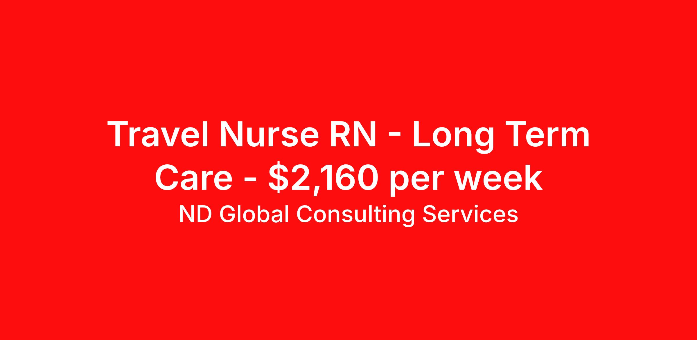 ND Global Consulting Services is seeking a travel nurse RN Long Term Care for a travel nursing job in Onawa, Iowa. Job Description & Requirements Specialty: Long Term Care Discipline: RN Duration: 13 weeks 36 hours per week Shift: 12 hours, nights Employment Type: Travel Job Title: Registered Nurse (RN) – Long Term Care (LTC) Start Date: ASAP / Urgent Need Job Overview: We are seeking a compassionate and dependable Registered Nurse (RN) for a Long Term Care (LTC) facility. The RN will provide skilled nursing care to residents, ensuring their comfort, safety, and overall well-being. The ideal candidate is experienced in geriatric care, medication management, and supervising support staff in a long-term care setting. Key Responsibilities: Administer medications and treatments as prescribed Perform resident assessments and monitor changes in condition Develop, implement, and update individualized care plans Supervise and delegate tasks to LPNs and CNAs Respond promptly to resident needs and emergencies Maintain accurate and timely documentation Communicate effectively with physicians, families, and interdisciplinary team members Ensure compliance with facility policies and state/federal regulations Required Qualifications: Active RN license (state-specific or compact license if applicable) LTC or skilled nursing experience preferred Current BLS certification Strong clinical judgment and assessment skills Ability to manage multiple residents in a fast-paced environment Excellent communication and leadership skills Schedule & Compensation: Day, evening, and night shifts available Weekend rotation may be required Competitive pay rates Overtime opportunities Why Join Us: Supportive team environment Stable patient population Opportunity to make a meaningful impact in residents’ lives Immediate start available