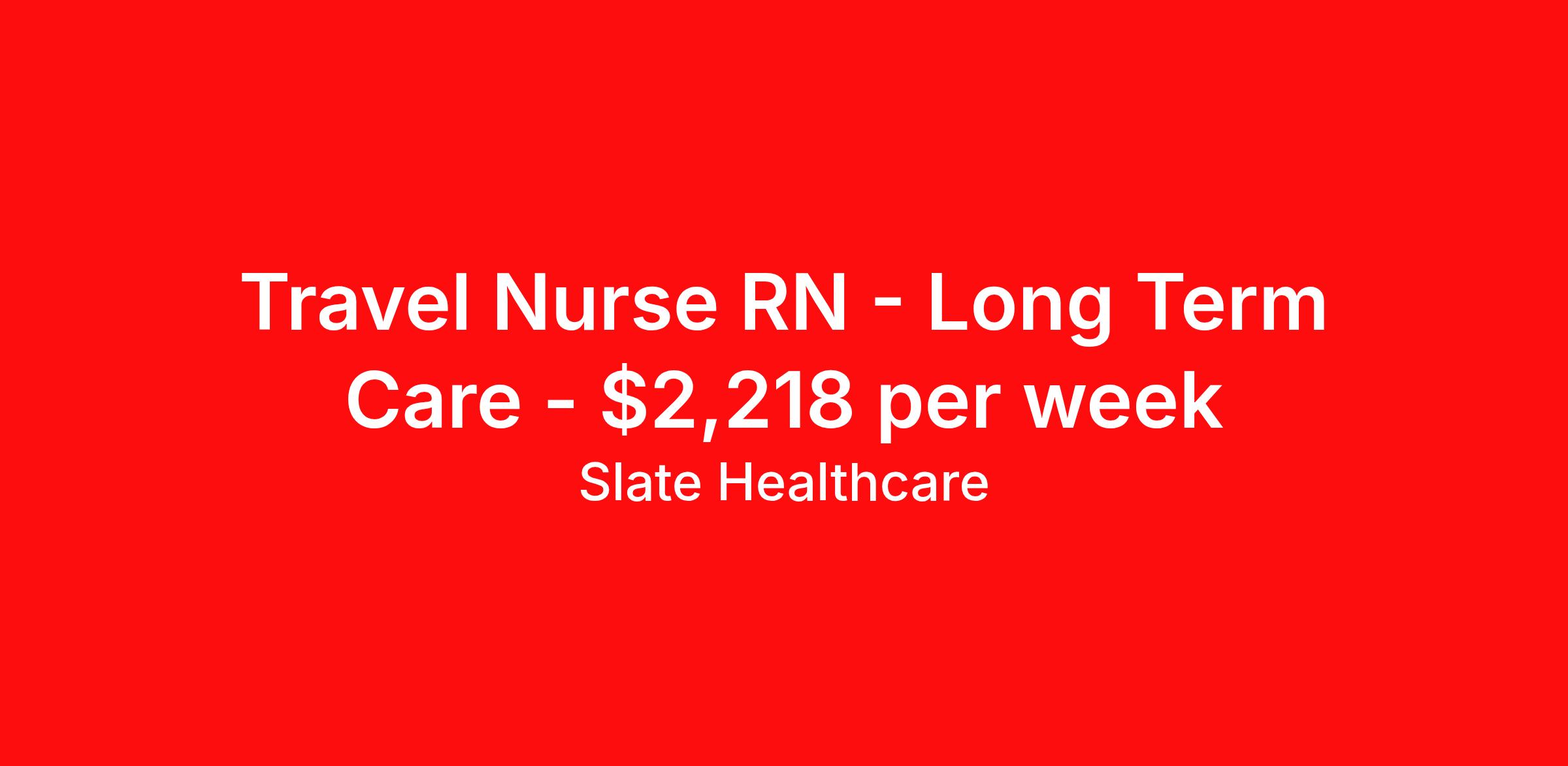 Slate Healthcare is seeking a travel nurse RN Long Term Care for a travel nursing job in Butte, Montana. Job Description & Requirements Specialty: Long Term Care Discipline: RN Start Date: ASAP Duration: 8 weeks 40 hours per week Shift: 8 hours, flexible Employment Type: Travel Job Name: RN - Evening shift 1:45pm-10:15pm -EOW. Account Name: CREST NURSING HOME, LLC Type of Facility: LTC / Nursing Homes Requested Start Date: End Date: Bill Rate: 77 OT Bill Rate: 103.95 Shifts: Variable - Evenings Hours: 8s Housing Type: Prime Time Healthcare Provided Guaranteed Hours: 40 Hours Billing City: BUTTE Billing State: MT Slate Healthcare Job ID 9abd5b15-9aef-4848-b359-bbfeffd887ab. Pay package is based on 8 hour shifts and 40 hours per week (subject to confirmation) with tax-free stipend amount to be determined. About Slate Healthcare Slate Healthcare is a premier travel healthcare staffing agency, connecting healthcare professionals with thousands of opportunities at top-tier hospitals and facilities across the country. We’re committed to supporting nurses and allied health professionals in building stable, fulfilling careers—while embracing the freedom and excitement that comes with travel. Our goal is simple: to offer flexibility, competitive pay, and personalized placements that align with each clinician’s lifestyle and career goals. At Slate, we empower our professionals to choose when and where they work, while ensuring they receive the highest compensation possible—because we believe that exceptional care starts with empowered caregivers.