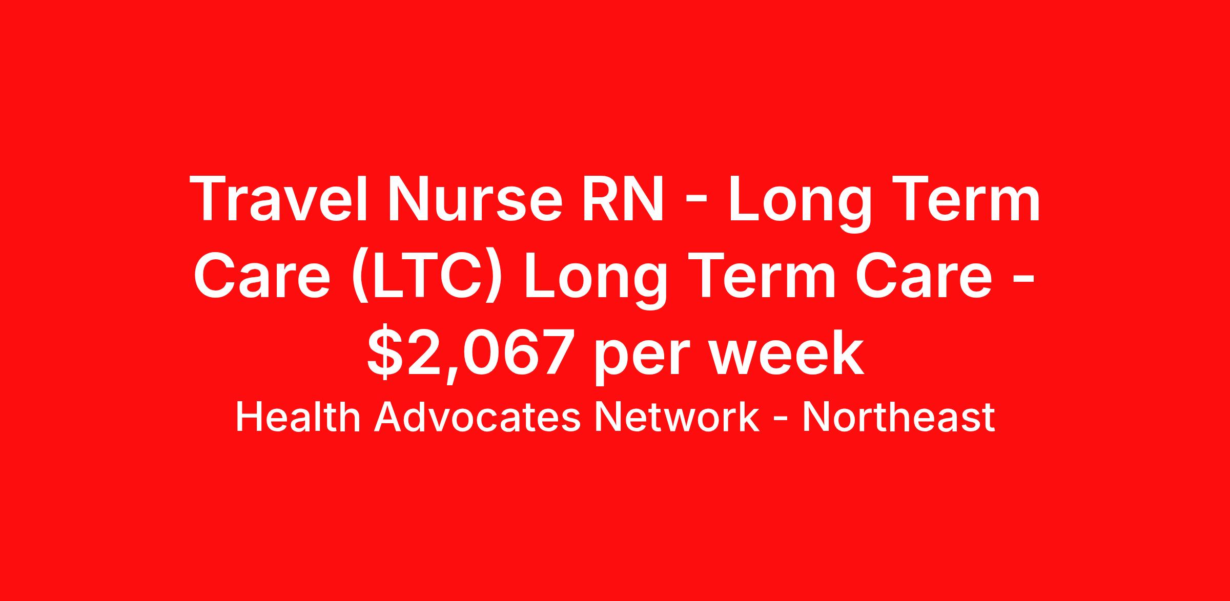 Health Advocates Network - Northeast is seeking a travel nurse RN Long Term Care (LTC) Long Term Care for a travel nursing job in Troy, New York. Job Description & Requirements Specialty: Long Term Care Discipline: RN Start Date: 04/03/2026 Duration: 8 weeks 40 hours per week Shift: 8 hours, evenings Employment Type: Travel Health Advocates Network is urgently hiring LTC Registered Nurses (RNs) in the Troy, NY area. Must have 1 year LTC experience. • Pay Rate: $2,067 weekly • Specialty: LTC Registered Nurse (RN) • Shift: Night • 8 Week Contracts and more available! • Radius Rule: 60 mile radius applies Qualification and Requirements: • Authorized to work in the United States. • Graduate of an Accredited School of Nursing • 1 year of experience as a LTC Registered Nurse (RN) • American Heart Association BLS • An active, current (NY) state license Apply for this job now or to find out more about other opportunities with Health Advocates Network, Inc. reply to this posting, contact us at or call/text . We can provide you unparalleled access to exciting career opportunities. Benefits We Offer: Competitive pay rates, Referral Bonus, Medical, Dental, Vision and 401k. Travel reimbursement and per diem allowances, Employee discounts, educational opportunities, and more! Who We Are: Health Advocates Network matches highly skilled applicants to positions at the best healthcare companies on a temporary and temporary-to-hire basis. Our mission is to provide you with a rewarding job that is well matched to your skills – helping you advance in your career. Our experience, combined with our client relationships, makes Health Advocates Network a great resource for your career. Health Advocates Network, Inc. is an equal opportunity employer. All qualified applicants shall receive consideration for employment without regard to any legally protected basis protected by applicable federal or state law except where a bona fide occupational qualification applies. Refer a Registered Nurse for a $1000.00 bonus opportunity! HANStaff Northeast Job ID 390016. Pay package is based on 8 hour shifts and 40 hours per week (subject to confirmation) with tax-free stipend amount to be determined. Posted job title: RN - LTC About Health Advocates Network - Northeast Health Advocates Network was founded on the basis of a shared aspiration, to improve the way healthcare staffing is done. We are a company established and led by nurses. Our flexible approach enables us to develop solutions customized to your specific needs. From short- and long-term travel contracts to local and per diem assignments and more, we are here to get you to your next adventure! By solving challenges, providing the best placements, and advocating for you, we stand to help you thrive and pave the path forward in your career. Benefits 401k retirement plan
