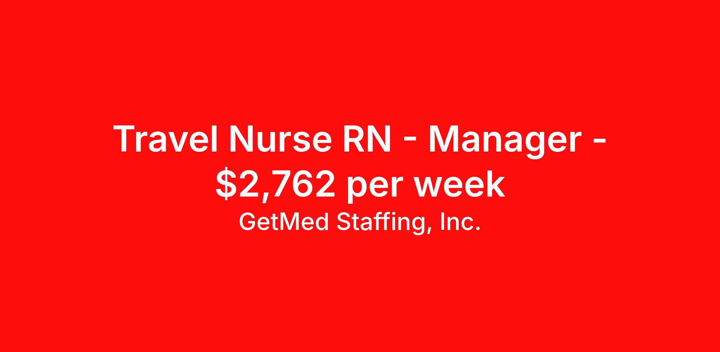 GetMed Staffing, Inc. is seeking a travel nurse RN Manager for a travel nursing job in Burlington, Massachusetts. Job Description & Requirements Specialty: Manager Discipline: RN Start Date: 04/06/2026 Duration: 13 weeks 40 hours per week Shift: 8 hours, days Employment Type: Travel GetMed Staffing is searching for a strong RN Manager to assist our traveler-friendly client. A minimum of 1-2 years of experience is required. Traveling with GetMed Staffing offers the unique opportunity to gain diverse experiences, both personally and professionally. Gain experience that matters. GetMed Staffing, Inc. Job ID 36167270. Pay package is based on 8 hour shifts and 40.0 hours per week (subject to confirmation) with tax-free stipend amount to be determined. Posted job title: RN:Manager,07:00:00-15:00:00 About GetMed Staffing, Inc. We are a diversity owned company, specializing in healthcare recruiting services. We truly understand how important a healthcare travelers' relationship is with their recruiter, as well as our relationship is with our healthcare facilities. We recognize that the needs of our healthcare travelers can vary, and therefore we provide the personalized touch necessary to ensure a successful travel assignment each and every time. Our healthcare facilities and clients benefit from us putting our healthcare travelers first. GetMed Staffing is excited to be a leader within the industry by focusing on providing healthcare travelers with more choices and possibilities as they plan for their next healthcare travel assignment. Benefits Life insurance Medical benefits Dental benefits Vision benefits 401k retirement plan