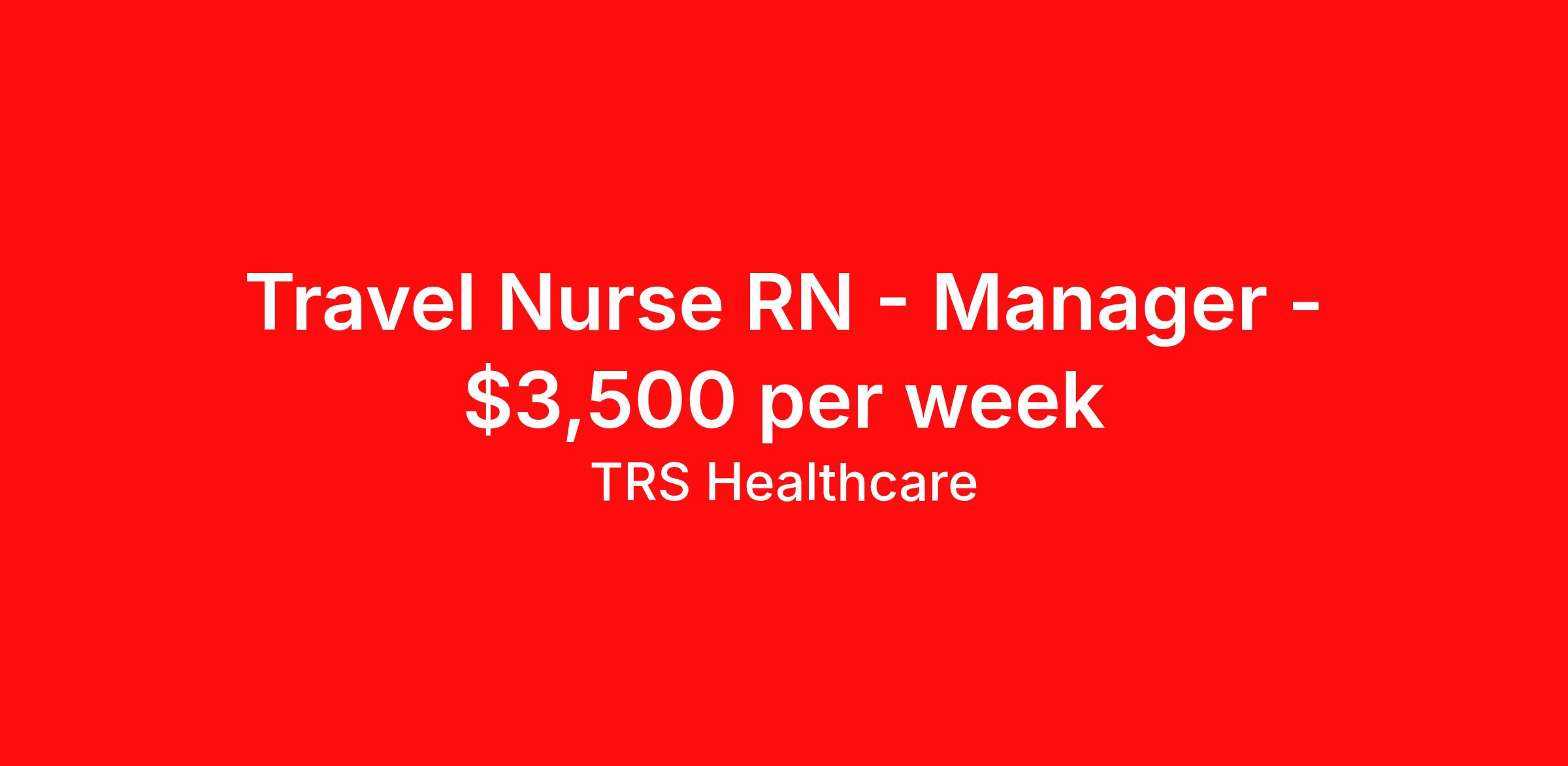 TRS Healthcare is seeking a travel nurse RN Manager for a travel nursing job in Greenbrae, California. Job Description & Requirements Specialty: Manager Discipline: RN Start Date: 04/13/2026 Duration: 13 weeks 40 hours per week Shift: 9 hours, days Employment Type: Travel TRS Healthcare Job ID 1449536. Pay package is based on 9 hour shifts and 40 hours per week (subject to confirmation) with tax-free stipend amount to be determined. Posted job title: Nurse Management Registered Nurse About TRS Healthcare TRS Healthcare has been a leader in the healthcare staffing industry for over 25 years, providing exceptional career opportunities for travel nurses and allied health professionals. An RN-founded, woman-owned company, TRS Healthcare has team members in all 50 states. We recruit and support registered nurses, licensed practical nurses, surgical technicians, respiratory therapists, imaging technologists, laboratory specialists, and other experienced nursing and allied healthcare professionals. We staff hundreds of healthcare facilities across the U.S. in urban, rural, and underserved areas, including multi-state hospital systems, critical access hospitals, rural community hospitals, long-term care facilities, trauma centers, standalone clinics, and more. Learn more about TRS Healthcare at trshealthcare.com .