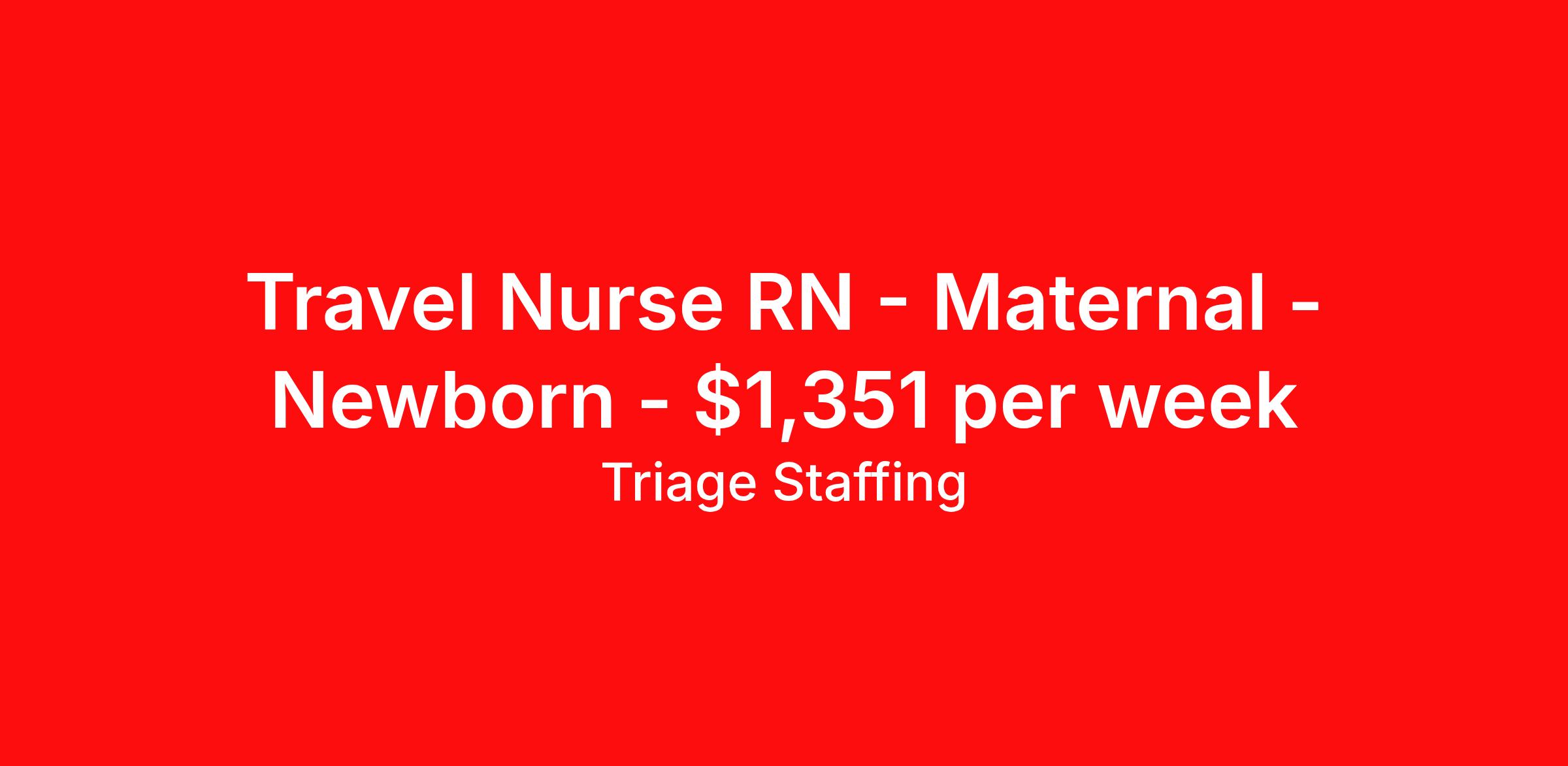 Triage Staffing is seeking a travel nurse RN Maternal - Newborn for a travel nursing job in Dallas, Texas. Job Description & Requirements Specialty: Maternal - Newborn Discipline: RN Start Date: 04/07/2026 Duration: 13 weeks 36 hours per week Shift: 12 hours, nights Employment Type: Travel Travel Nursing: Postpartum/Mother Baby Dallas Location: Dallas Start Date: 4/7/2026 Shift Details: 12H Nights 36 hours per week Length: 13 WEEKS Apply for specific facility details.Mother Baby RN Triage Staffing Job ID RQNA7LUC. Posted job title: Nursing: Postpartum/Mother Baby About Triage Staffing At Triage, we prefer to be real . Real about expectations—both ours and yours. Real about how a decision you make today could affect your tomorrows. Real about how compensation actually works. Real about how great—or grating—your next supervisor may be. Being real allows everyone at Triage to be ready . Ready to serve you with real honesty. So if that gig near the ocean is really no day at the beach, or that third shift comes with a second-class rate, we tell you. So you can be ready, too. We staff all five major divisions of acute care—nursing, lab, radiology, cardiopulmonary and rehab therapy, offering: - Competitive, custom pay packages - One point of contact for both travelers and facilities (per division) - A reliable recruiter who's got your back throughout your entire assignment - In-house compliance and accounting specialists - A clinical liaison team available 24/7 to offer medical and professional support and career development - A mentoring program that is run and managed by actual clinicians—yeah, you read that right - And more (because of course there’s more) Are we the biggest? No. Are we the best? That’s rather subjective, but we’re trying to be. Will we work like hell to get you as close to your idea of heaven as possible? Yes. Yes, we will. Benefits: Day One comprehensive, nationwide insurance plans for health, vision and dental and life—including a HSA option Day One 401(k) program with employer-matching contributions once eligible Facility cancelling protection—your time is money on and off-the-clock Guaranteed hours Weekly paychecks via direct deposit Earned vacation bonuses for time worked Paid holidays Employee assistance program (EAP)—your mental health is important, too Continuing education, certification and licensing reimbursement Workers comp—because accidents happen Top-rated professional liability insurance Company provided housing options Referral bonus—$750 in your pocket after they’ve completed a 13-week assignment