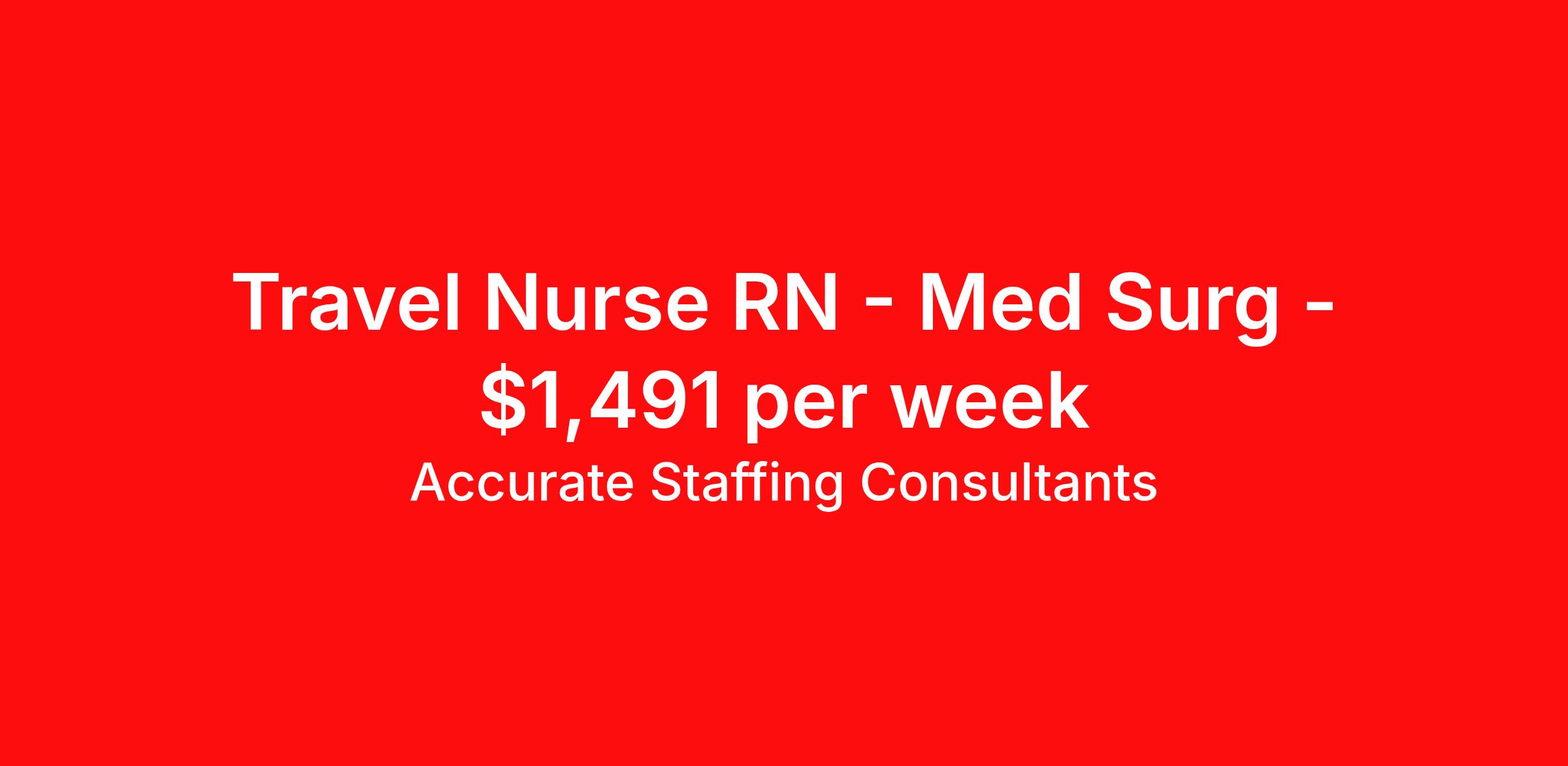 Accurate Staffing Consultants is seeking a travel nurse RN Med Surg for a travel nursing job in Goldsboro, North Carolina. Job Description & Requirements Specialty: Med Surg Discipline: RN Start Date: 04/13/2026 Duration: 7 weeks 36 hours per week Shift: 12 hours, nights Employment Type: Travel AccurateStaffing Job ID 4802. Pay package is based on 12 hour shifts and 36 hours per week (subject to confirmation) with tax-free stipend amount to be determined. Posted job title: RN - Medsurg