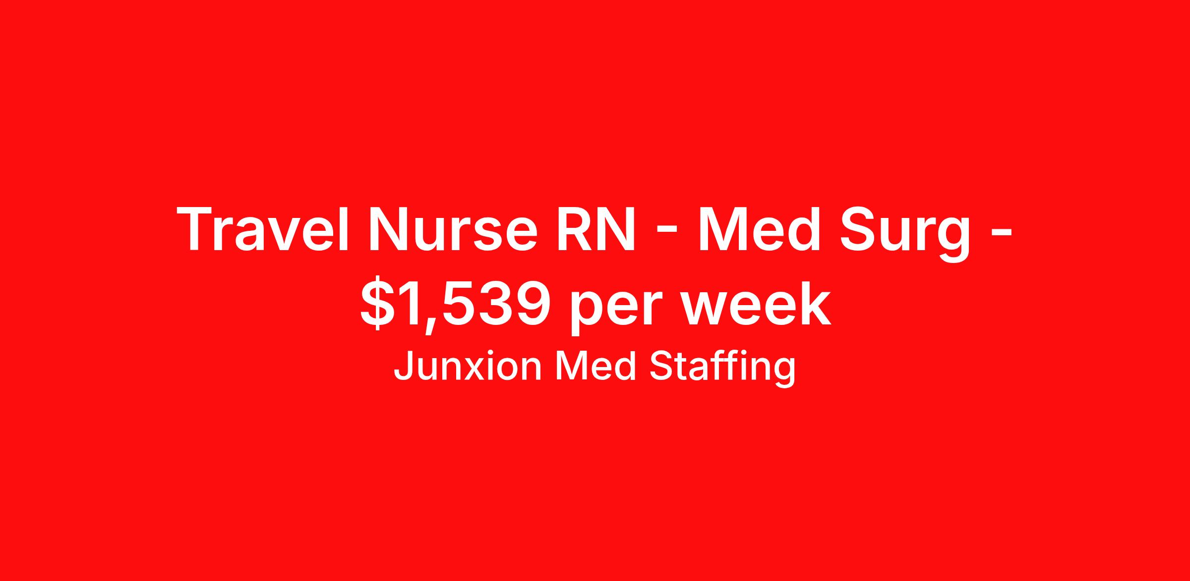 Junxion Med Staffing is seeking a travel nurse RN Med Surg for a travel nursing job in Cumming, Georgia. Job Description & Requirements Specialty: Med Surg Discipline: RN Start Date: 04/13/2026 Duration: 13 weeks 36 hours per week Shift: 12 hours, days Employment Type: Travel Summary: Junxion Med Staffing is looking for a Med surg RN to take an assignment in Cumming, Georgia. This assignment lasts 12.86 WEEKS and is scheduled to start on April 13, 2026. If you don't like the start date, pay, or shift, then let’s talk. Give us a call opt 1 Job Details: Shift: 12H Days Total Weekly Hours: 36 Certifications: BLS, BLS, ACLS, NIH Trauma Level: Benefits: Day 1 Insurance Additional bonus potential for every contract Additional vacation incentives Medical insurance with no more than $175 monthly premium for employee Employee Assistance Program (EAP) Referral bonus up to $1,000 401K and access to financial advisors for financial wellness and education A dedicated recruiter and support team that will help you every step of the way to sure you start on time and have an exceptional experience An agency ran by a traveler for travelers Click here for licensing requirements About the Company: Junxion Med Staffing is an award-winning healthcare staffing company with a mission to provide quality healthcare to our communities. Apply today to speak with a recruiter! Awards: RNVIP- Top 10 Travel Nursing Agencies of 2024 BluePipes – The Best Travel Nursing Companies 2023 *Estimated weekly pay includes projected hourly wages and weekly meal and lodging per diems for eligible clinicians based on nationally published GSA rates. Actual weekly pay and per diems may differ from the amount shown and may be subject to change during an assignment. For all employees and employee applicants, Junxion Med Staffing is an Equal Employment Opportunity ("EEO") Employer, including Disability/Vets, and welcomes all to apply. Junxion Med Staffing Job ID 1363292. Pay package is based on 12 hour shifts and 36 hours per week (subject to confirmation) with tax-free stipend amount to be determined. About Junxion Med Staffing Junxion Med Staffing was founded by a former healthcare traveler who understands the challenges healthcare professionals face - because we’ve been there. We specialize in placing travel nurses, allied health professionals, physicians, physician assistants, and nurse practitioners in both short-term and permanent roles across a wide range of specialties. Whether you're looking for a travel contract or a long-term fit, we work to ensure the right match between each healthcare professional and facility. At Junxion, we keep it simple: ● Transparent communication. No surprises, no hidden details, just honest conversations so you always know what to expect. ● Dedicated support. From job search to contract negotiations and throughout your assignment, you’ll have a recruiter who’s with you every step of the way. ● Competitive pay and benefits. We advocate for you to be fairly compensated and supported in your goals. ● A focus on your success. When healthcare professionals feel valued and empowered, patient care improves and that’s what it’s all about. You’re not just a number here. You’re part of a team that actually cares. Let’s find your next great opportunity together. Benefits Weekly pay Referral bonus Dental benefits Vision benefits 401k retirement plan Medical benefits Mileage reimbursement