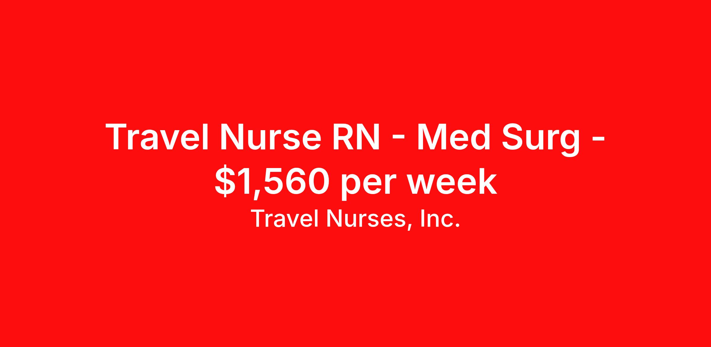 Travel Nurses, Inc. is seeking a travel nurse RN Med Surg for a travel nursing job in Anniston, Alabama. Job Description & Requirements Specialty: Med Surg Discipline: RN Start Date: 03/30/2026 Duration: 13 weeks 36 hours per week Shift: 12 hours Employment Type: Travel Travel Nurses, Inc. Job ID 309393. Pay package is based on 12 hour shifts and 36 hours per week (subject to confirmation) with tax-free stipend amount to be determined. Posted job title: Medical Surgical Registered Nurse About Travel Nurses, Inc. Travel Nurses, Inc. is a leading healthcare staffing agency that provides healthcare professionals with opportunities to work across the country. Founded by nurses in 1988, TNI has more than 30 years of experience in the industry. The agency initially focused on staffing operating room settings in the MidSouth. However, this quickly evolved to encompass all nursing specialties and allied health fields nationwide. At the heart of our mission is a profound respect for nurses, whom we consider the cornerstone of healthcare. This acknowledgment extends beyond the nursing profession alone. Travel Nurses, Inc. now proudly embraces a wide array of healthcare professionals, recognizing their crucial roles in our collective mission. Travel Nurses, Inc. is dedicated to providing comprehensive support and opportunities that will help facilitate complete career mobility in the healthcare field. Our commitment to transparency ensures that all professionals, not just nurses, can confidently accept any assignment without financial uncertainties. We prioritize our professionals’ well-being with comprehensive benefits packages, including day-one healthcare coverage, competitive salaries, bonuses and incentives. This underscores our unwavering commitment to offering the best possible rewards and support for all the professionals we serve. Benefits Weekly pay Continuing Education 401k retirement plan Wellness and fitness programs Mileage reimbursement Referral bonus Employee assistance programs Medical benefits Dental benefits Vision benefits Benefits start day 1 License and certification reimbursement Life insurance Retention bonus