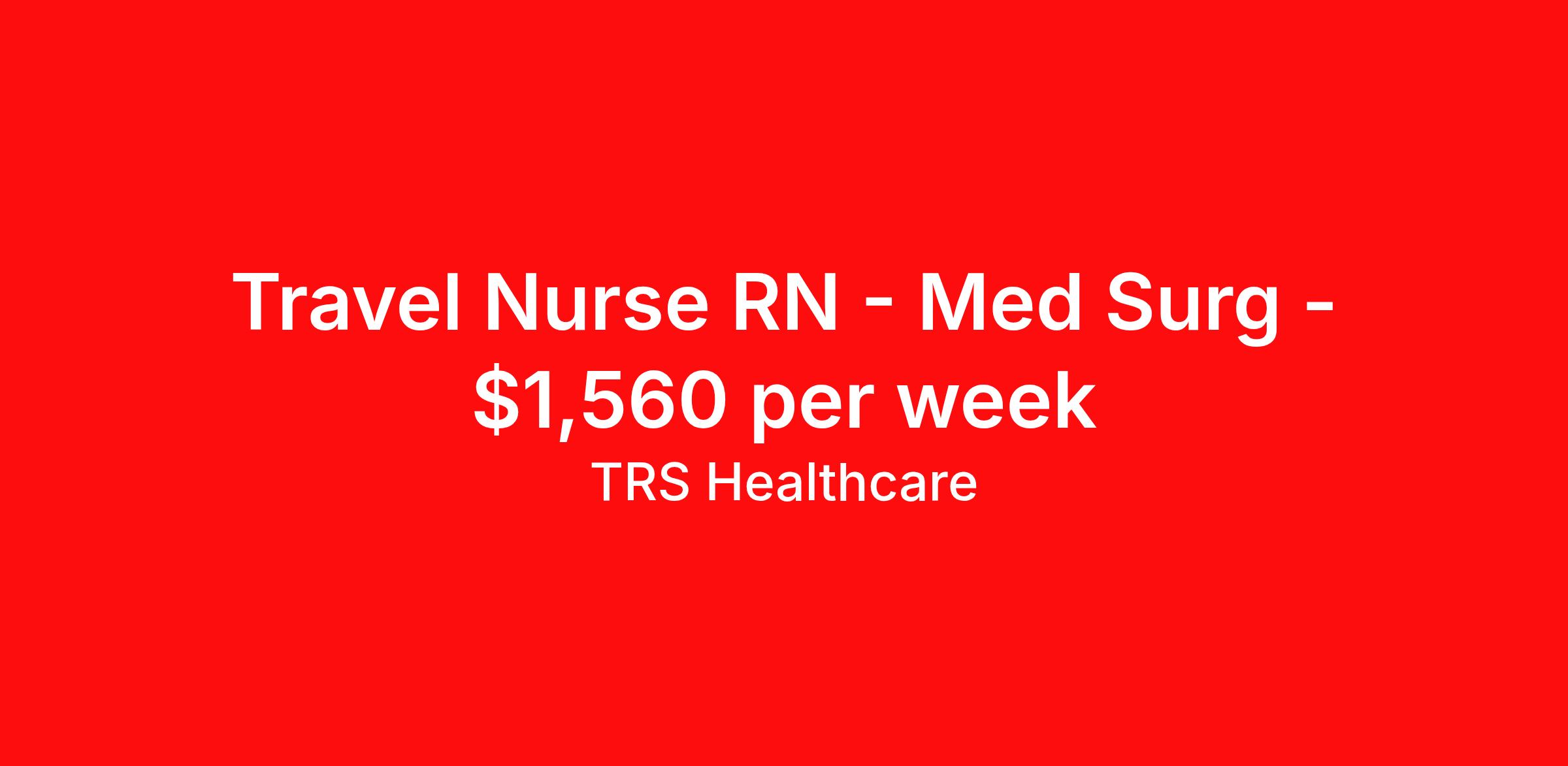 TRS Healthcare is seeking a travel nurse RN Med Surg for a travel nursing job in Evansville, Indiana. Job Description & Requirements Specialty: Med Surg Discipline: RN Start Date: ASAP Duration: 13 weeks 36 hours per week Shift: 12 hours, nights Employment Type: Travel TRS Healthcare Job ID 1433497. Pay package is based on 12 hour shifts and 36 hours per week (subject to confirmation) with tax-free stipend amount to be determined. Posted job title: Medical Surgical Registered Nurse About TRS Healthcare TRS Healthcare has been a leader in the healthcare staffing industry for over 25 years, providing exceptional career opportunities for travel nurses and allied health professionals. An RN-founded, woman-owned company, TRS Healthcare has team members in all 50 states. We recruit and support registered nurses, licensed practical nurses, surgical technicians, respiratory therapists, imaging technologists, laboratory specialists, and other experienced nursing and allied healthcare professionals. We staff hundreds of healthcare facilities across the U.S. in urban, rural, and underserved areas, including multi-state hospital systems, critical access hospitals, rural community hospitals, long-term care facilities, trauma centers, standalone clinics, and more. Learn more about TRS Healthcare at trshealthcare.com .