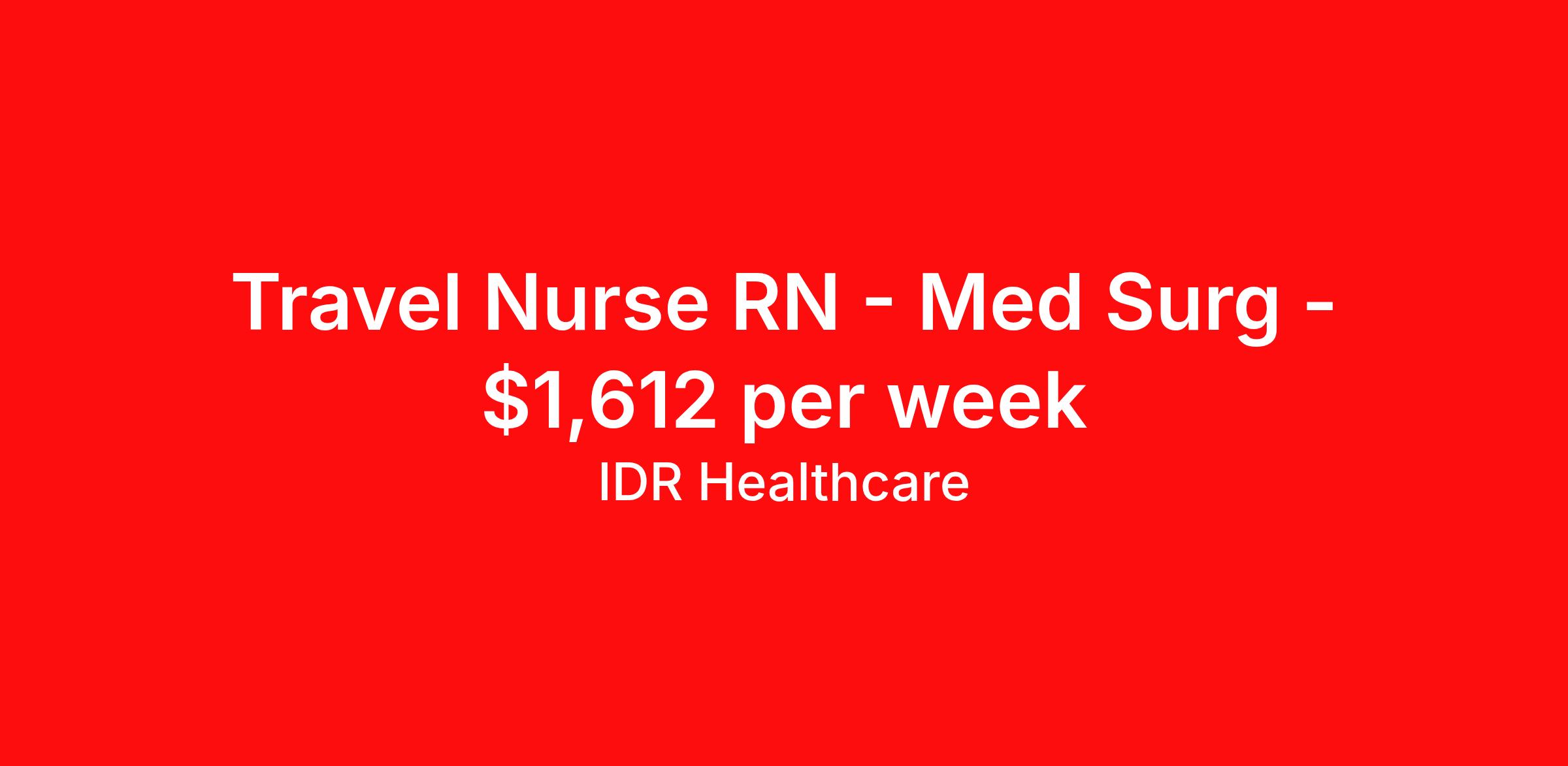 IDR Healthcare is seeking a travel nurse RN Med Surg for a travel nursing job in Lenexa, Kansas. Job Description & Requirements Specialty: Med Surg Discipline: RN Start Date: ASAP Duration: 13 weeks 36 hours per week Shift: 12 hours, nights Employment Type: Travel IDR Healthcare is an awarding winning staffing firm that believes it is a privilege and awesome responsibility to serve those who selflessly care for others. Our mission is to empower healthcare professionals to achieve their fullest potential both personally and professionally while they create positive change within the healthcare community. We exercise true grit, tenacity, and authenticity while embracing and ownership mindset to go above and beyond providing healthcare professionals a world class experience. We are employee owned and our travelers and clinicians earn shares/equity by just completing multiple assignments! We have been named SIA’s Fastest Growing Staffing Firms and have won ClearlyRated® Best of Staffing for 11 consecutive years! This cements our commitment to clinician satisfaction earning top net promoter scores putting us in the top 2% of agencies in North America! TravelFarWithIDR and see what an extraordinary experience is all about! Benefits 2024 World Staffing Best Staffing Firms to Work For! ESOP (Equity) Healthcare Benefits for up to 30 days Between Assignments Comprehensive Health Insurance Dental and Vision Insurance Sign-On, Completion, & Referral Bonus Programs License and Certification Reimbursement Weekly Pay and Competitive Compensation Large Network of Clients and Job Opportunities 401k retirement plan Exclusive Assignments IDR Job ID 493593. Pay package is based on 12 hour shifts and 36 hours per week (subject to confirmation) with tax-free stipend amount to be determined. About IDR Healthcare IDR Healthcare is an awarding winning staffing firm that believes it is a privilege and awesome responsibility to serve those who selflessly care for others. Our mission is to empower healthcare professionals to achieve their fullest potential both personally and professionally while they create positive change within the healthcare community. We exercise true grit, tenacity, and authenticity while embracing and ownership mindset to go above and beyond providing healthcare professionals a world class experience. We are employee owned and our travelers and clinicians earn shares/equity by just completing multiple assignments! We have been named SIA’s Fastest Growing Staffing Firms and have won ClearlyRated® Best of Staffing for 11 consecutive years! This cements our commitment to clinician satisfaction earning top net promoter scores putting us in the top 2% of agencies in North America! Help us give back! For every booked assignment, proceeds are donated to St. Jude and Feeding America! Last year we raised over $18,000 for St. Jude and provided over 49,000 meals for children in need. TravelFarWithIDR and see what it is all about! Benefits Weekly pay 401k retirement plan Referral bonus Medical benefits Dental benefits License and certification reimbursement Vision benefits