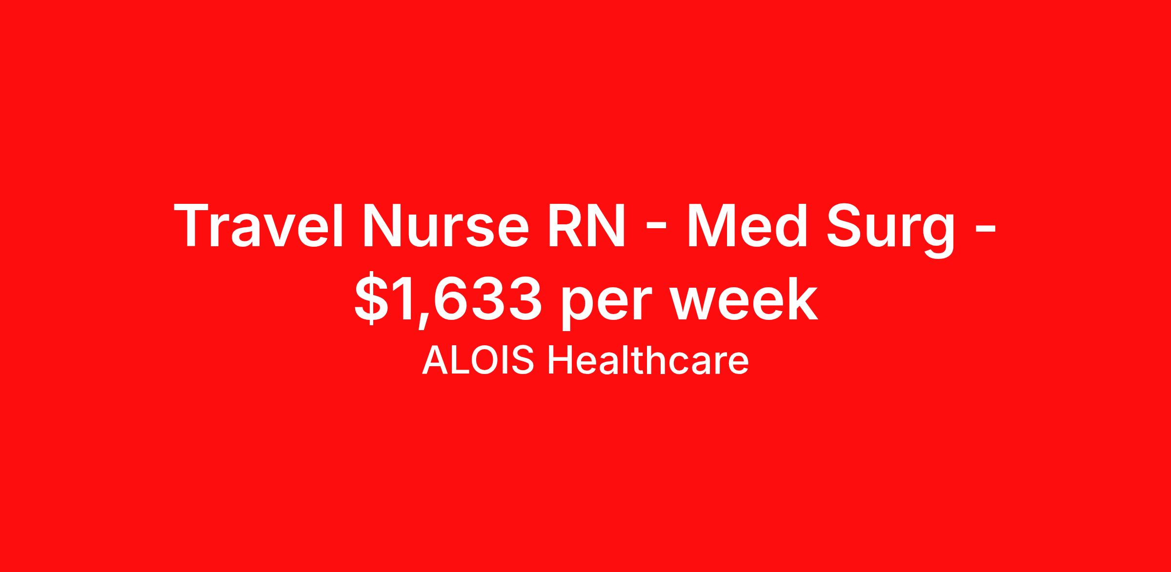 ALOIS Healthcare is seeking a travel nurse RN Med Surg for a travel nursing job in Tyler, Texas. Job Description & Requirements Specialty: Med Surg Discipline: RN Start Date: 04/20/2026 Duration: 13 weeks 36 hours per week Shift: 12 hours, nights Employment Type: Travel Assessing, planning, implementing, and evaluating patient care plans in consultation with healthcare professionals. Evaluating medical information, as well as providing direct and individualized bedside nursing care to pre and post-surgery patients. ALOIS Healthcare Job ID 17876734. Pay package is based on 12 hour shifts and 36.0 hours per week (subject to confirmation) with tax-free stipend amount to be determined. Posted job title: RN MS About ALOIS Healthcare Why ALOIS Healthcare? ALOIS means “brave warrior” and that’s what you are- Warrior in Scrubs! Just as you advocate for your patients, we will advocate for you. The pay you deserve. The support you need. We’re in your corner for every battle – because you shouldn’t settle for anything less when it comes to your career. We offer: · Industry-leading pay Generous cost of living and housing stipends · Opportunities for referral, sign-on, and extension bonuses · Weekly health insurance or health insurance Marketplace weekly bonus · Continuing education credits We’re proud to be recognized globally as a certified minority-owned staffing supplier. At ALOIS Healthcare: · Everyone Matters · We are Performance Driven · We are Open, Honest and Direct · We are Transparent · We are Inclusive · We Do the Right Thing We care about you - and your success is our success.