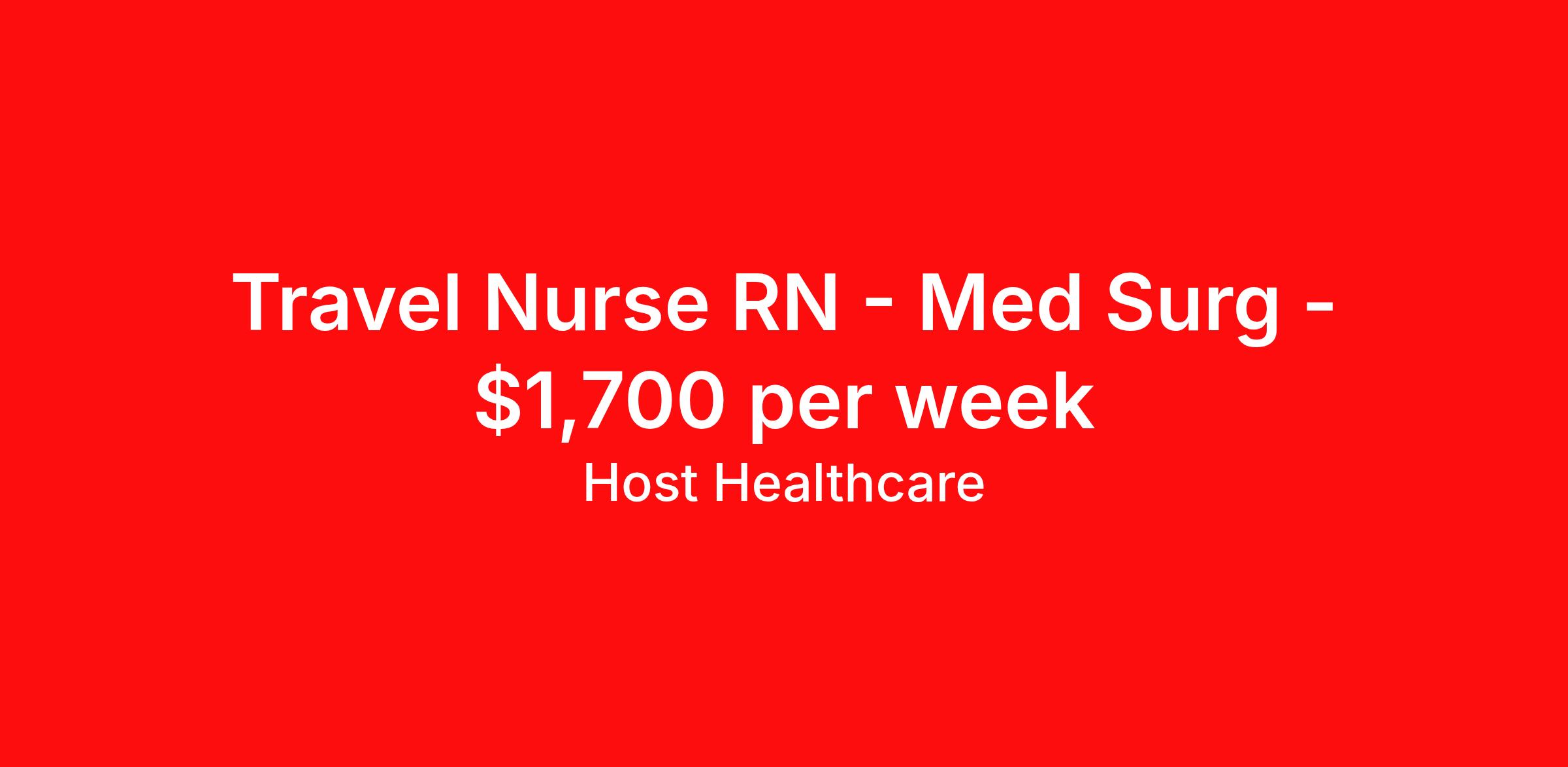 Host Healthcare is seeking a travel nurse RN Med Surg for a travel nursing job in Harlingen, Texas. Job Description & Requirements Specialty: Med Surg Discipline: RN Start Date: 04/08/2026 Duration: 13 weeks 36 hours per week Shift: 12 hours, days Employment Type: Travel Host Healthcare Job ID a1fVX000002xiblYAA. Pay package is based on 12 hour shifts and 36 hours per week (subject to confirmation) with tax-free stipend amount to be determined. Posted job title: RN - Med Surg About Host Healthcare At Host Healthcare, we provide a truly comfortable experience as you explore your travel nursing, therapy, or allied career. We make your travel healthcare journey easy by taking care of all the details, so you don’t have to. We are on a mission to help others live better and we do this by helping the healers of the world be as comfortable as possible. With access to tens of thousands of travel nursing, therapy, and allied jobs in all 50 states, our responsive and friendly recruiters find your dream position based on what’s important to you. During your assignment, get access to premium benefits, including Day 1 medical that continues up to 30 days between assignments, 401K matching, travel reimbursements, dedicated housing support, and more. We also offer 24/7 support from our team and access to our on-staff clinicians so you can feel comfortable and confident throughout your entire assignment. Travel comfortably with Host Healthcare. Benefits Referral bonus School loan reimbursement Vision benefits Wellness and fitness programs Company provided housing options License and certification reimbursement Life insurance Medical benefits Mileage reimbursement Pet insurance Discount program Employee assistance programs Guaranteed Hours Health savings account Holiday Pay 401k retirement plan Continuing Education Dental benefits