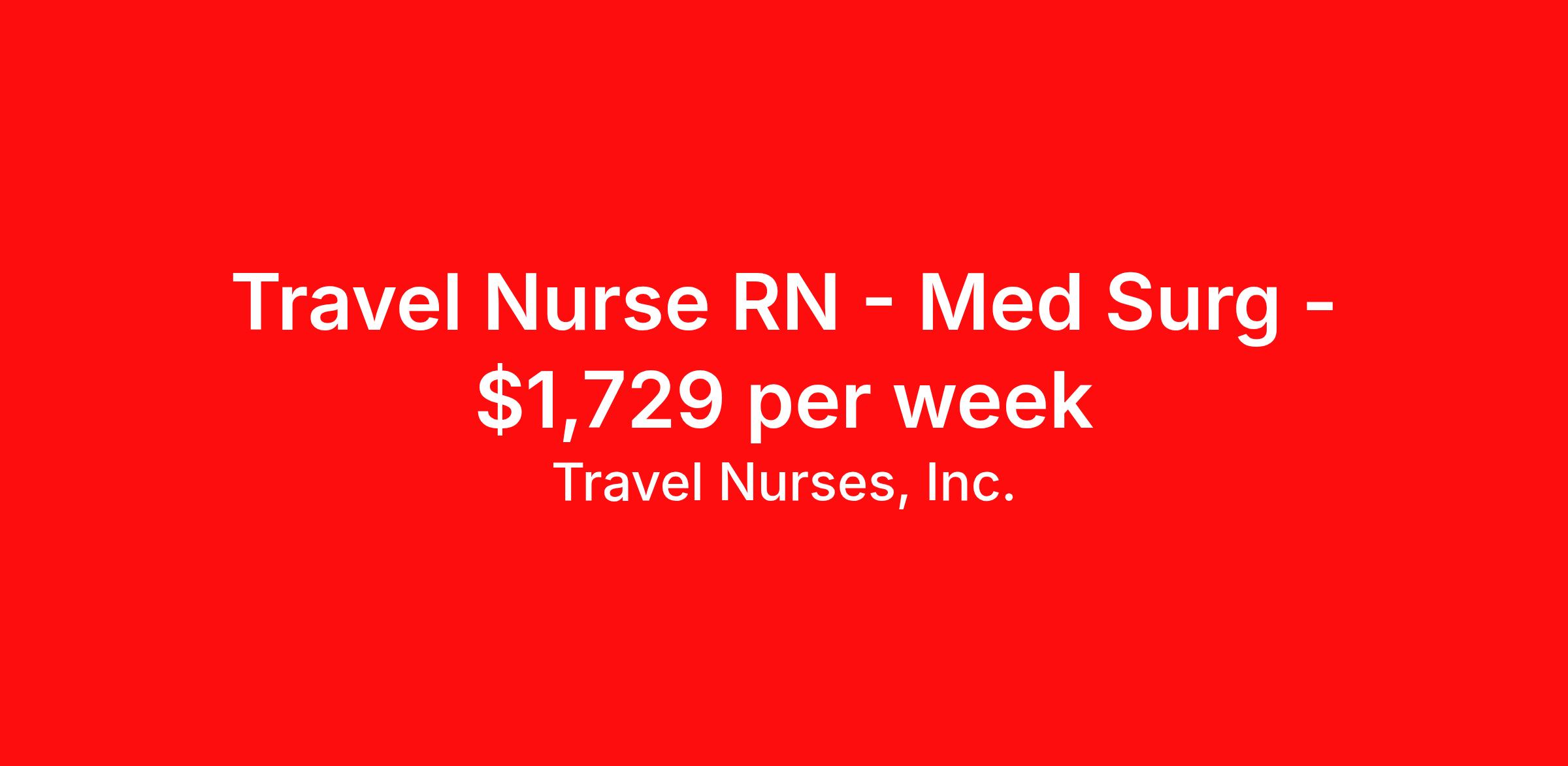 Travel Nurses, Inc. is seeking a travel nurse RN Med Surg for a travel nursing job in Crowley, Louisiana. Job Description & Requirements Specialty: Med Surg Discipline: RN Start Date: 04/06/2026 Duration: 13 weeks 36 hours per week Shift: 12 hours Employment Type: Travel Travel Nurses, Inc. Job ID 307881. Pay package is based on 12 hour shifts and 36 hours per week (subject to confirmation) with tax-free stipend amount to be determined. Posted job title: Medical Surgical Registered Nurse About Travel Nurses, Inc. Travel Nurses, Inc. is a leading healthcare staffing agency that provides healthcare professionals with opportunities to work across the country. Founded by nurses in 1988, TNI has more than 30 years of experience in the industry. The agency initially focused on staffing operating room settings in the MidSouth. However, this quickly evolved to encompass all nursing specialties and allied health fields nationwide. At the heart of our mission is a profound respect for nurses, whom we consider the cornerstone of healthcare. This acknowledgment extends beyond the nursing profession alone. Travel Nurses, Inc. now proudly embraces a wide array of healthcare professionals, recognizing their crucial roles in our collective mission. Travel Nurses, Inc. is dedicated to providing comprehensive support and opportunities that will help facilitate complete career mobility in the healthcare field. Our commitment to transparency ensures that all professionals, not just nurses, can confidently accept any assignment without financial uncertainties. We prioritize our professionals’ well-being with comprehensive benefits packages, including day-one healthcare coverage, competitive salaries, bonuses and incentives. This underscores our unwavering commitment to offering the best possible rewards and support for all the professionals we serve. Benefits Weekly pay Continuing Education 401k retirement plan Wellness and fitness programs Mileage reimbursement Referral bonus Employee assistance programs Medical benefits Dental benefits Vision benefits Benefits start day 1 License and certification reimbursement Life insurance Retention bonus