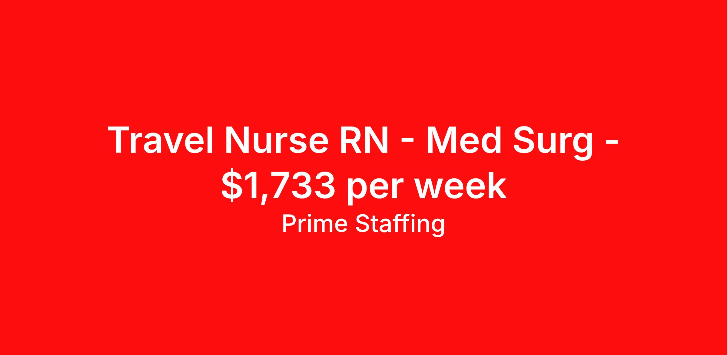 Prime Staffing is seeking a travel nurse RN Med Surg for a travel nursing job in Tyler, Texas. Job Description & Requirements Specialty: Med Surg Discipline: RN Start Date: 04/06/2026 Duration: 13 weeks 36 hours per week Shift: 12 hours, days, nights Employment Type: Travel About Prime Staffing At Prime Staffing, we understand the importance of finding the perfect fit for both our clients and candidates. Prime Staffing utilizes a unique matchmaking approach, providing the most qualified contingent staffing to our clients, and the most competitive contracts to our workforce. Our experienced team takes the time to get to know both our clients and candidates, their needs, and preferences, to ensure that each placement is a success. We offer a wide range of staffing services including temporary, temp-to-perm, and direct hire placements. Our extensive network of qualified candidates includes nurses, allied healthcare professionals, corporate support professionals and executives.