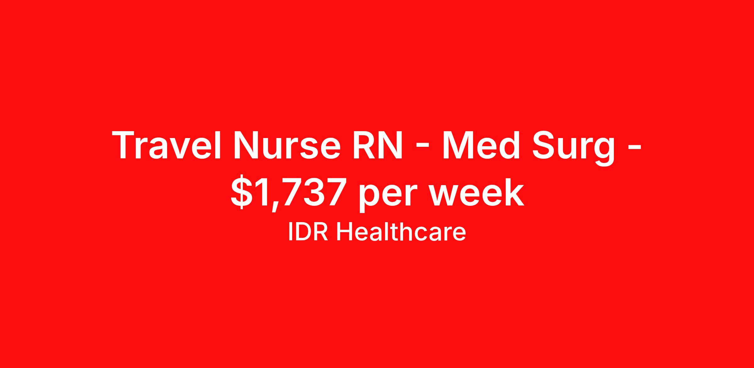 IDR Healthcare is seeking a travel nurse RN Med Surg for a travel nursing job in Birmingham, Alabama. Job Description & Requirements Specialty: Med Surg Discipline: RN Duration: 13 weeks 36 hours per week Shift: 12 hours, nights Employment Type: Travel IDR Job ID UA003. Pay package is based on 12 hour shifts and 36 hours per week (subject to confirmation) with tax-free stipend amount to be determined. About IDR Healthcare IDR Healthcare is an awarding winning staffing firm that believes it is a privilege and awesome responsibility to serve those who selflessly care for others. Our mission is to empower healthcare professionals to achieve their fullest potential both personally and professionally while they create positive change within the healthcare community. We exercise true grit, tenacity, and authenticity while embracing and ownership mindset to go above and beyond providing healthcare professionals a world class experience. We are employee owned and our travelers and clinicians earn shares/equity by just completing multiple assignments! We have been named SIA’s Fastest Growing Staffing Firms and have won ClearlyRated® Best of Staffing for 11 consecutive years! This cements our commitment to clinician satisfaction earning top net promoter scores putting us in the top 2% of agencies in North America! Help us give back! For every booked assignment, proceeds are donated to St. Jude and Feeding America! Last year we raised over $18,000 for St. Jude and provided over 49,000 meals for children in need. TravelFarWithIDR and see what it is all about! Benefits Weekly pay 401k retirement plan Referral bonus Medical benefits Dental benefits License and certification reimbursement Vision benefits