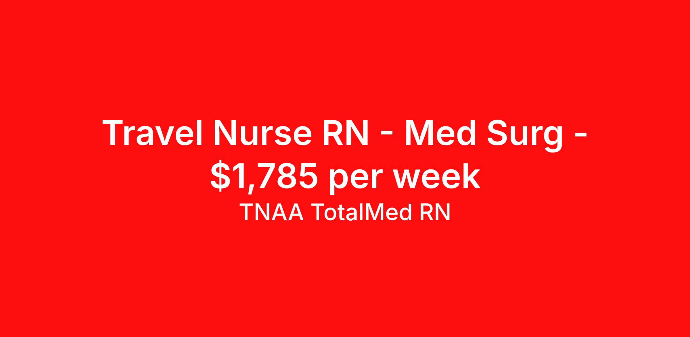 TNAA TotalMed RN is seeking a travel nurse RN Med Surg for a travel nursing job in Syracuse, New York. Job Description & Requirements Specialty: Med Surg Discipline: RN Duration: 16 weeks 36 hours per week Shift: 12 hours, days Employment Type: Travel We're looking for Medical Surgical RNs for an immediate travel nurse opening in Syracuse, NY. The right RN should have 1-2 years recent acute care experience. Read below for more requirements. As a MedSurg RN, you will conduct patient assessments and prioritize data collection based on patients' immediate conditions or needs. MedSurg RNs perform ongoing assessments and appropriate treatments as ordered by a physician. Documenting patient findings and providing education and support to patients' families is essential to this travel nurse position. As a Medical Surgical Travel Nurse, you should be prepared to perform the following tasks: Provide bedside care for a variety of patients, including pre- and post-op patients. Prepare, administer and record prescribed medication, reporting any adverse reactions to treatment. Change dressings, insert catheters and start IVs. Prepares equipment and aids physician during examination and treatment of patient. Educates patients on surgical procedures. Participates in discharge planning and initiates patient education plan as prescribed by physician. Medical Surgical Travel Nurses should be able to stand and walk for long periods of time, as well as bend, lean and stoop without difficulty. RNs should be able to easily lift 20 pounds. Moving or lifting of patients may require lifting of up to 50 pounds at times. RNs will work in a fast-paced environment treating patients that may be confused, agitated, and/or uncooperative. Requirements*: ACLS, BLS, 2 Years * Additional certifications may be required before beginning an assignment. TotalMed Travel Job ID 1385109. Pay package is based on 12 hour shifts and 36 hours per week (subject to confirmation) with tax-free stipend amount to be determined. Posted job title: Medical/Surgical - MedSurg RN - Travel Nurse About TNAA TotalMed RN TotalMed is a Top Ten, travel nursing and healthcare staffing agency with the mission of igniting purpose in healthcare. The organization staffs nurses, therapists, pharmacists, and other clinicians of all specialties in all 50 states. They offer local and travel jobs and match caregivers with the right organization to assist both facilities and patients. As an organization, they focus on putting highly-skilled staff into facilities to ensure adequate staffing for a better patient experience. TotalMed specializes in recruiting and placing healthcare professionals in travel, PRN, and permanent positions across the country in Nursing and Allied Health. Throughout 2020, the organization filled roles at even the most short-staffed facilities during the most challenging time in healthcare. By matching the right travel healthcare professional with the right organization, TotalMed continues to offer a lifeline to facilities and their patients. Benefits Weekly pay Guaranteed Hours Continuing Education 401k retirement plan Sick pay Wellness and fitness programs Referral bonus Employee assistance programs Medical benefits Dental benefits Vision benefits Benefits start day 1