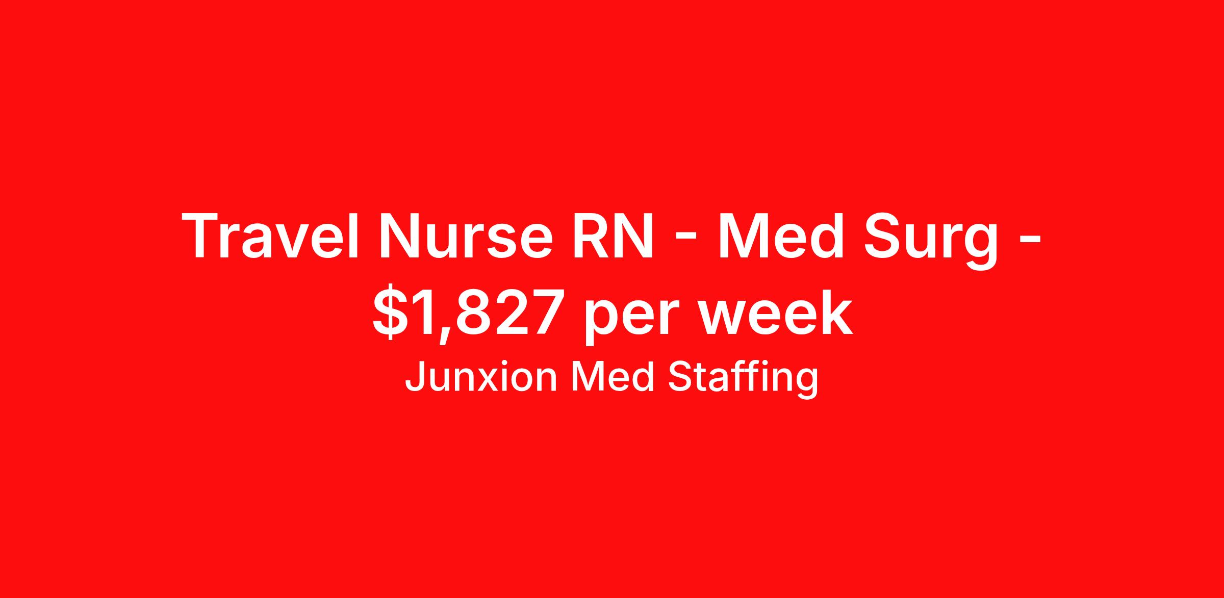 Junxion Med Staffing is seeking a travel nurse RN Med Surg for a travel nursing job in Evansville, Indiana. Job Description & Requirements Specialty: Med Surg Discipline: RN Start Date: 04/12/2026 Duration: 13 weeks 36 hours per week Shift: 12 hours, days Employment Type: Travel Summary: Junxion Med Staffing is looking for a Med surg RN to take an assignment in Evansville, Indiana. This assignment lasts 13 WEEKS and is scheduled to start on April 12, 2026. If you don't like the start date, pay, or shift, then let’s talk. Give us a call opt 1 Job Details: Shift: 12H Days Total Weekly Hours: 36 Certifications: BLS, Nursys, License/Certificate Verification Trauma Level: Benefits: Day 1 Insurance Additional bonus potential for every contract Additional vacation incentives Medical insurance with no more than $175 monthly premium for employee Employee Assistance Program (EAP) Referral bonus up to $1,000 401K and access to financial advisors for financial wellness and education A dedicated recruiter and support team that will help you every step of the way to sure you start on time and have an exceptional experience An agency ran by a traveler for travelers Click here for licensing requirements About the Company: Junxion Med Staffing is an award-winning healthcare staffing company with a mission to provide quality healthcare to our communities. Apply today to speak with a recruiter! Awards: RNVIP- Top 10 Travel Nursing Agencies of 2024 BluePipes – The Best Travel Nursing Companies 2023 *Estimated weekly pay includes projected hourly wages and weekly meal and lodging per diems for eligible clinicians based on nationally published GSA rates. Actual weekly pay and per diems may differ from the amount shown and may be subject to change during an assignment. For all employees and employee applicants, Junxion Med Staffing is an Equal Employment Opportunity ("EEO") Employer, including Disability/Vets, and welcomes all to apply. Junxion Med Staffing Job ID 1363252. Pay package is based on 12 hour shifts and 36 hours per week (subject to confirmation) with tax-free stipend amount to be determined. About Junxion Med Staffing Junxion Med Staffing was founded by a former healthcare traveler who understands the challenges healthcare professionals face - because we’ve been there. We specialize in placing travel nurses, allied health professionals, physicians, physician assistants, and nurse practitioners in both short-term and permanent roles across a wide range of specialties. Whether you're looking for a travel contract or a long-term fit, we work to ensure the right match between each healthcare professional and facility. At Junxion, we keep it simple: ● Transparent communication. No surprises, no hidden details, just honest conversations so you always know what to expect. ● Dedicated support. From job search to contract negotiations and throughout your assignment, you’ll have a recruiter who’s with you every step of the way. ● Competitive pay and benefits. We advocate for you to be fairly compensated and supported in your goals. ● A focus on your success. When healthcare professionals feel valued and empowered, patient care improves and that’s what it’s all about. You’re not just a number here. You’re part of a team that actually cares. Let’s find your next great opportunity together. Benefits Weekly pay Referral bonus Dental benefits Vision benefits 401k retirement plan Medical benefits Mileage reimbursement