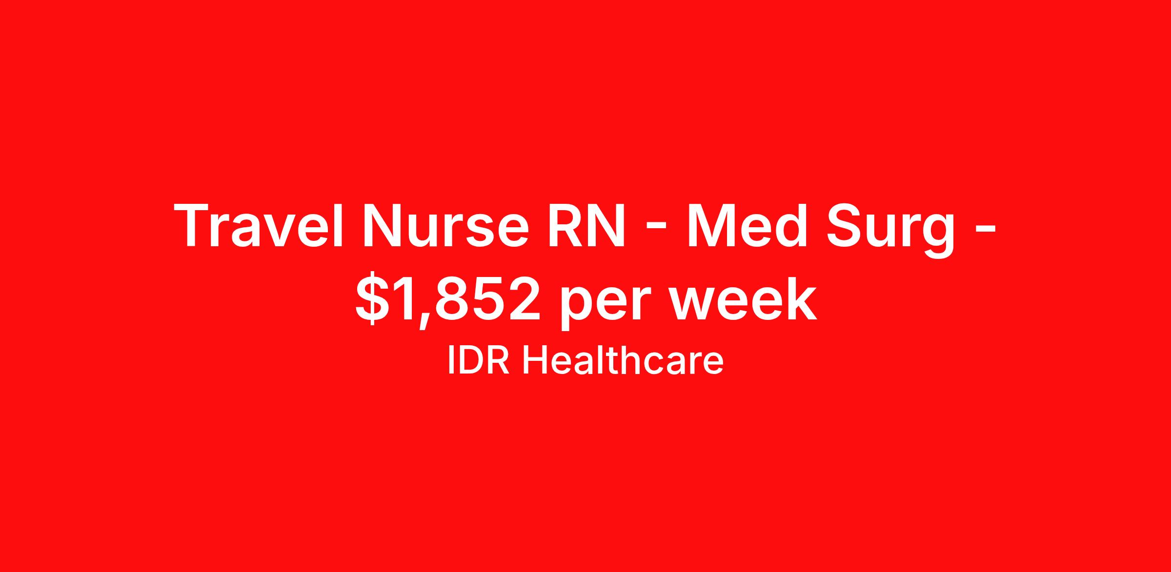 IDR Healthcare is seeking a travel nurse RN Med Surg for a travel nursing job in Atlanta, Georgia. Job Description & Requirements Specialty: Med Surg Discipline: RN Start Date: 04/13/2026 Duration: 13 weeks 36 hours per week Shift: 12 hours, days Employment Type: Travel IDR Healthcare is an awarding winning staffing firm that believes it is a privilege and awesome responsibility to serve those who selflessly care for others. Our mission is to empower healthcare professionals to achieve their fullest potential both personally and professionally while they create positive change within the healthcare community. We exercise true grit, tenacity, and authenticity while embracing and ownership mindset to go above and beyond providing healthcare professionals a world class experience. We are employee owned and our travelers and clinicians earn shares/equity by just completing multiple assignments! We have been named SIA’s Fastest Growing Staffing Firms and have won ClearlyRated® Best of Staffing for 11 consecutive years! This cements our commitment to clinician satisfaction earning top net promoter scores putting us in the top 2% of agencies in North America! TravelFarWithIDR and see what an extraordinary experience is all about! Benefits 2024 World Staffing Best Staffing Firms to Work For! ESOP (Equity) Healthcare Benefits for up to 30 days Between Assignments Comprehensive Health Insurance Dental and Vision Insurance Sign-On, Completion, & Referral Bonus Programs License and Certification Reimbursement Weekly Pay and Competitive Compensation Large Network of Clients and Job Opportunities 401k retirement plan Exclusive Assignments IDR Job ID 496005. Pay package is based on 12 hour shifts and 36 hours per week (subject to confirmation) with tax-free stipend amount to be determined. About IDR Healthcare IDR Healthcare is an awarding winning staffing firm that believes it is a privilege and awesome responsibility to serve those who selflessly care for others. Our mission is to empower healthcare professionals to achieve their fullest potential both personally and professionally while they create positive change within the healthcare community. We exercise true grit, tenacity, and authenticity while embracing and ownership mindset to go above and beyond providing healthcare professionals a world class experience. We are employee owned and our travelers and clinicians earn shares/equity by just completing multiple assignments! We have been named SIA’s Fastest Growing Staffing Firms and have won ClearlyRated® Best of Staffing for 11 consecutive years! This cements our commitment to clinician satisfaction earning top net promoter scores putting us in the top 2% of agencies in North America! Help us give back! For every booked assignment, proceeds are donated to St. Jude and Feeding America! Last year we raised over $18,000 for St. Jude and provided over 49,000 meals for children in need. TravelFarWithIDR and see what it is all about! Benefits Weekly pay 401k retirement plan Referral bonus Medical benefits Dental benefits License and certification reimbursement Vision benefits