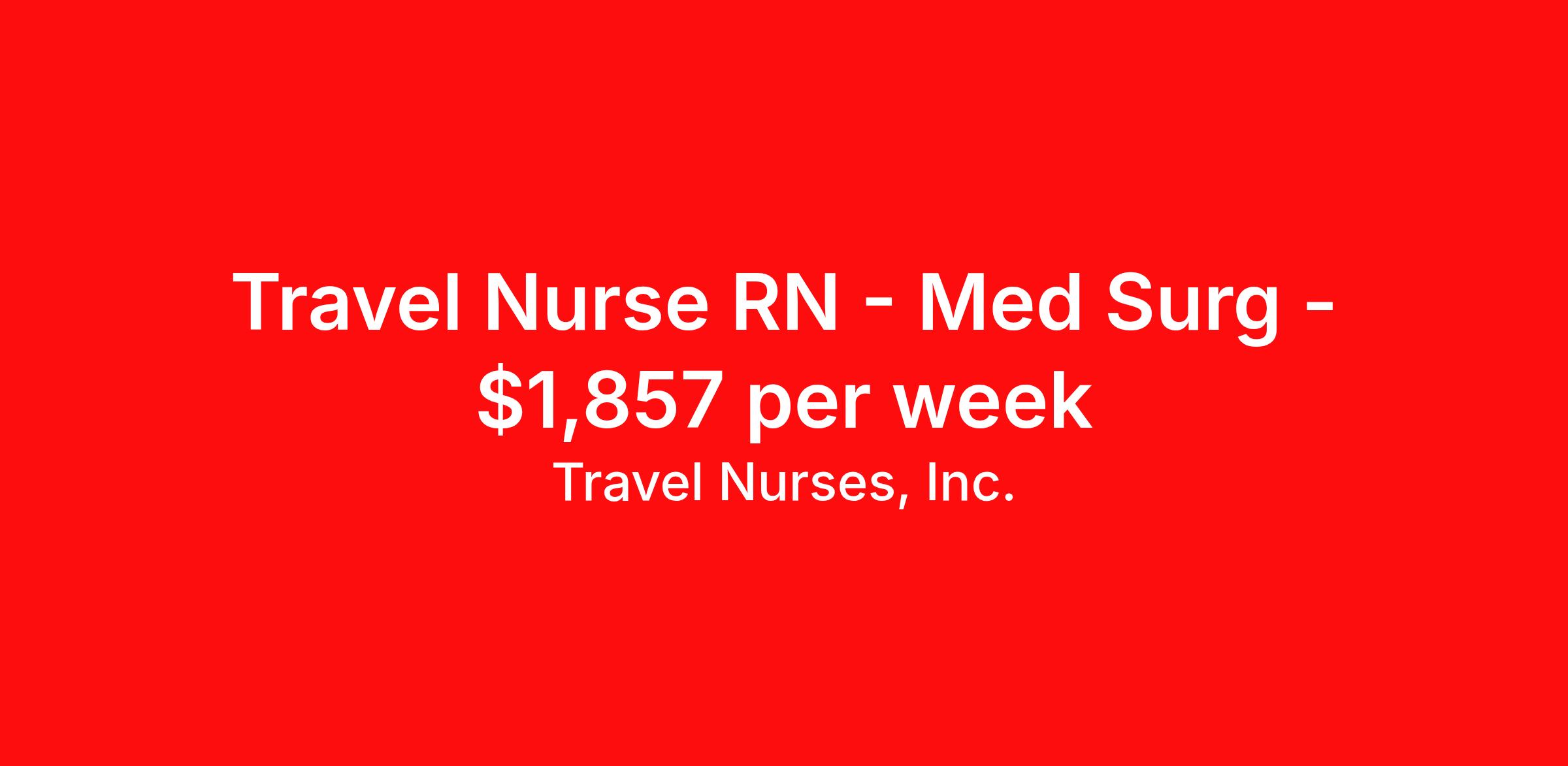 Travel Nurses, Inc. is seeking a travel nurse RN Med Surg for a travel nursing job in Burlington, North Carolina. Job Description & Requirements Specialty: Med Surg Discipline: RN Start Date: 04/06/2026 Duration: 13 weeks 36 hours per week Shift: 12 hours Employment Type: Travel Travel Nurses, Inc. Job ID 302109. Pay package is based on 12 hour shifts and 36 hours per week (subject to confirmation) with tax-free stipend amount to be determined. Posted job title: Medical Surgical Registered Nurse About Travel Nurses, Inc. Travel Nurses, Inc. is a leading healthcare staffing agency that provides healthcare professionals with opportunities to work across the country. Founded by nurses in 1988, TNI has more than 30 years of experience in the industry. The agency initially focused on staffing operating room settings in the MidSouth. However, this quickly evolved to encompass all nursing specialties and allied health fields nationwide. At the heart of our mission is a profound respect for nurses, whom we consider the cornerstone of healthcare. This acknowledgment extends beyond the nursing profession alone. Travel Nurses, Inc. now proudly embraces a wide array of healthcare professionals, recognizing their crucial roles in our collective mission. Travel Nurses, Inc. is dedicated to providing comprehensive support and opportunities that will help facilitate complete career mobility in the healthcare field. Our commitment to transparency ensures that all professionals, not just nurses, can confidently accept any assignment without financial uncertainties. We prioritize our professionals’ well-being with comprehensive benefits packages, including day-one healthcare coverage, competitive salaries, bonuses and incentives. This underscores our unwavering commitment to offering the best possible rewards and support for all the professionals we serve. Benefits Weekly pay Continuing Education 401k retirement plan Wellness and fitness programs Mileage reimbursement Referral bonus Employee assistance programs Medical benefits Dental benefits Vision benefits Benefits start day 1 License and certification reimbursement Life insurance Retention bonus