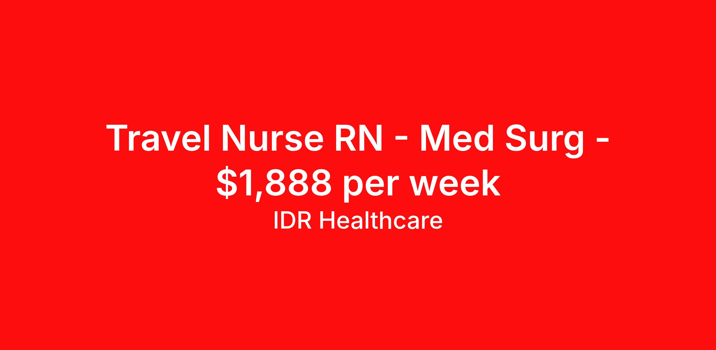 IDR Healthcare is seeking a travel nurse RN Med Surg for a travel nursing job in Ukiah, California. Job Description & Requirements Specialty: Med Surg Discipline: RN Start Date: ASAP Duration: 13 weeks 36 hours per week Shift: 12 hours, days Employment Type: Travel IDR Healthcare is an awarding winning staffing firm that believes it is a privilege and awesome responsibility to serve those who selflessly care for others. Our mission is to empower healthcare professionals to achieve their fullest potential both personally and professionally while they create positive change within the healthcare community. We exercise true grit, tenacity, and authenticity while embracing and ownership mindset to go above and beyond providing healthcare professionals a world class experience. We are employee owned and our travelers and clinicians earn shares/equity by just completing multiple assignments! We have been named SIA’s Fastest Growing Staffing Firms and have won ClearlyRated® Best of Staffing for 11 consecutive years! This cements our commitment to clinician satisfaction earning top net promoter scores putting us in the top 2% of agencies in North America! TravelFarWithIDR and see what an extraordinary experience is all about! Benefits 2024 World Staffing Best Staffing Firms to Work For! ESOP (Equity) Healthcare Benefits for up to 30 days Between Assignments Comprehensive Health Insurance Dental and Vision Insurance Sign-On, Completion, & Referral Bonus Programs License and Certification Reimbursement Weekly Pay and Competitive Compensation Large Network of Clients and Job Opportunities 401k retirement plan Exclusive Assignments IDR Job ID 484208. Pay package is based on 12 hour shifts and 36 hours per week (subject to confirmation) with tax-free stipend amount to be determined. About IDR Healthcare IDR Healthcare is an awarding winning staffing firm that believes it is a privilege and awesome responsibility to serve those who selflessly care for others. Our mission is to empower healthcare professionals to achieve their fullest potential both personally and professionally while they create positive change within the healthcare community. We exercise true grit, tenacity, and authenticity while embracing and ownership mindset to go above and beyond providing healthcare professionals a world class experience. We are employee owned and our travelers and clinicians earn shares/equity by just completing multiple assignments! We have been named SIA’s Fastest Growing Staffing Firms and have won ClearlyRated® Best of Staffing for 11 consecutive years! This cements our commitment to clinician satisfaction earning top net promoter scores putting us in the top 2% of agencies in North America! Help us give back! For every booked assignment, proceeds are donated to St. Jude and Feeding America! Last year we raised over $18,000 for St. Jude and provided over 49,000 meals for children in need. TravelFarWithIDR and see what it is all about! Benefits Weekly pay 401k retirement plan Referral bonus Medical benefits Dental benefits License and certification reimbursement Vision benefits