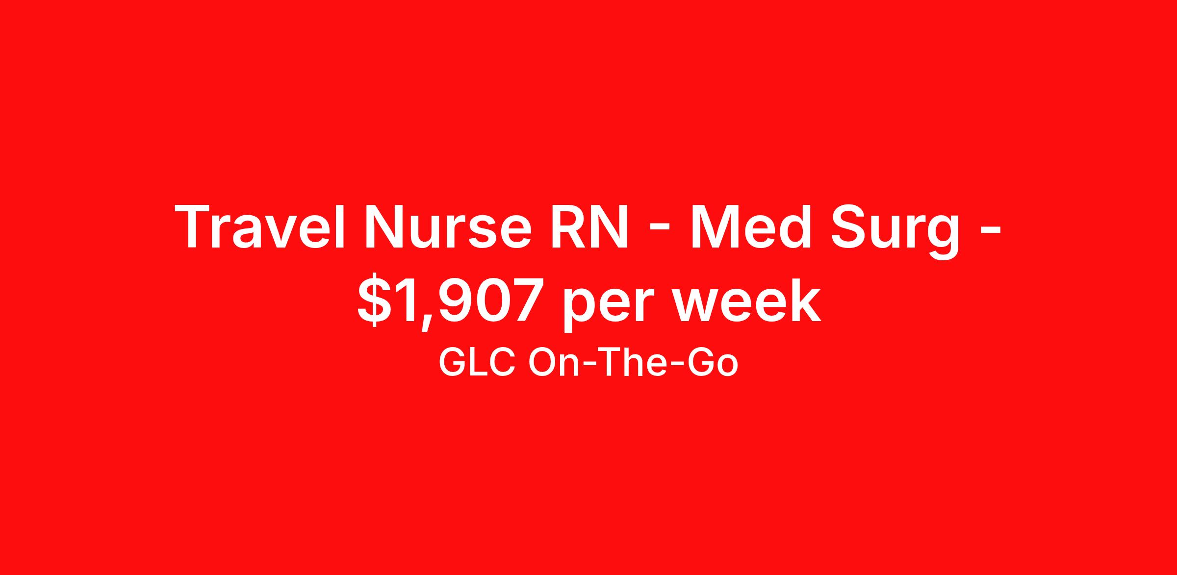 GLC On-The-Go is seeking a travel nurse RN Med Surg for a travel nursing job in Porterville, California. Job Description & Requirements Specialty: Med Surg Discipline: RN Start Date: 04/07/2026 Duration: 13 weeks 36 hours per week Shift: 12 hours Employment Type: Travel GLC is hiring: RN Labor & Delivery (L&D) - Porterville, CA - 13-week contract GLC – Named Best Nurse Agency 2024–2025 We connect nurses, nursing professionals, and allied health professionals like you to contracts that align with your skills, schedule, and career goals. About this Assignment Join the care team in Labor & Delivery (L&D) where you’ll provide patient-centered care in a collaborative environment. Typical responsibilities include direct patient care, timely documentation, and coordination with the care team. Specific duties will be confirmed during your interview with a recruiter. Assignment Details Location: Porterville, CA Assignment Length: 13 weeks Start Date: 04/07/2026 End Date: 07/04/2026 Pay Range: $1,716 - $1,907 Minimum Requirements Active license in Labor & Delivery (L&D) 1 year full-time RN, Labor & Delivery (L&D) experience within the last 2 years What you can expect from GLC Weekly on-time pay with direct deposit Transparent communication, clear assignment details, and recruiter support from start to finish - or extension Referral bonus up to $500 Health, dental, and vision insurance 401(k) plan Completion and signing bonuses may also be available Ready to move forward? Apply now and start your rewarding journey with GLC - a recruiter will connect quickly to review pay , start date , and assignment details so you can make the best decision for your next contract. GLC On-The-Go Job ID 501989. Pay package is based on 12 hour shifts and 36 hours per week (subject to confirmation) with tax-free stipend amount to be determined. Posted job title: Registered Nurse About GLC On-The-Go GLC is more than just a staffing agency – we’re your trusted partner in finding travel, local, and PRN contracts that align with your career aspirations and lifestyle. We specialize in connecting travel nurses and allied healthcare professionals like you with opportunities in acute care, long-term care, behavioral health, and allied fields across the U.S. Our attentive and friendly recruiters are always just a call or text away, ready to guide you at every step, ensuring you feel valued and heard. We understand the unique needs of travel healthcare professionals, which is why we offer comprehensive benefits and 24/7 support. Join GLC, where our 20 years of experience mean we know how to help you find the assignments that turn your career goals into reality. With us, it's not just a placement – it's your dream career made possible