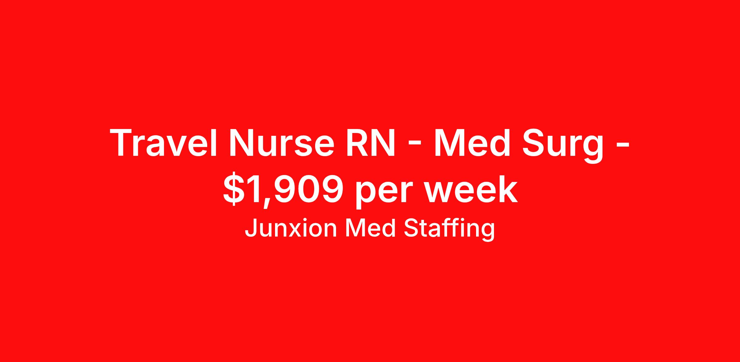 Junxion Med Staffing is seeking a travel nurse RN Med Surg for a travel nursing job in Carlsbad, New Mexico. Job Description & Requirements Specialty: Med Surg Discipline: RN Start Date: 03/23/2026 Duration: 13 weeks 36 hours per week Shift: 12 hours, nights Employment Type: Travel Summary: Junxion Med Staffing is looking for a Med surg RN to take an assignment in Carlsbad, New Mexico. This assignment lasts 13.14 WEEKS and is scheduled to start on March 23, 2026. If you don't like the start date, pay, or shift, then let’s talk. Give us a call opt 1 Job Details: Shift: 12H Nights Total Weekly Hours: 36 Certifications: BLS, ACLS, BLS Trauma Level: Benefits: Day 1 Insurance Additional bonus potential for every contract Additional vacation incentives Medical insurance with no more than $175 monthly premium for employee Employee Assistance Program (EAP) Referral bonus up to $1,000 401K and access to financial advisors for financial wellness and education A dedicated recruiter and support team that will help you every step of the way to sure you start on time and have an exceptional experience An agency ran by a traveler for travelers Click here for licensing requirements About the Company: Junxion Med Staffing is an award-winning healthcare staffing company with a mission to provide quality healthcare to our communities. Apply today to speak with a recruiter! Awards: RNVIP- Top 10 Travel Nursing Agencies of 2024 BluePipes – The Best Travel Nursing Companies 2023 *Estimated weekly pay includes projected hourly wages and weekly meal and lodging per diems for eligible clinicians based on nationally published GSA rates. Actual weekly pay and per diems may differ from the amount shown and may be subject to change during an assignment. For all employees and employee applicants, Junxion Med Staffing is an Equal Employment Opportunity ("EEO") Employer, including Disability/Vets, and welcomes all to apply. Junxion Med Staffing Job ID 1360245. Pay package is based on 12 hour shifts and 36 hours per week (subject to confirmation) with tax-free stipend amount to be determined. About Junxion Med Staffing Junxion Med Staffing was founded by a former healthcare traveler who understands the challenges healthcare professionals face - because we’ve been there. We specialize in placing travel nurses, allied health professionals, physicians, physician assistants, and nurse practitioners in both short-term and permanent roles across a wide range of specialties. Whether you're looking for a travel contract or a long-term fit, we work to ensure the right match between each healthcare professional and facility. At Junxion, we keep it simple: ● Transparent communication. No surprises, no hidden details, just honest conversations so you always know what to expect. ● Dedicated support. From job search to contract negotiations and throughout your assignment, you’ll have a recruiter who’s with you every step of the way. ● Competitive pay and benefits. We advocate for you to be fairly compensated and supported in your goals. ● A focus on your success. When healthcare professionals feel valued and empowered, patient care improves and that’s what it’s all about. You’re not just a number here. You’re part of a team that actually cares. Let’s find your next great opportunity together. Benefits Weekly pay Referral bonus Dental benefits Vision benefits 401k retirement plan Medical benefits Mileage reimbursement