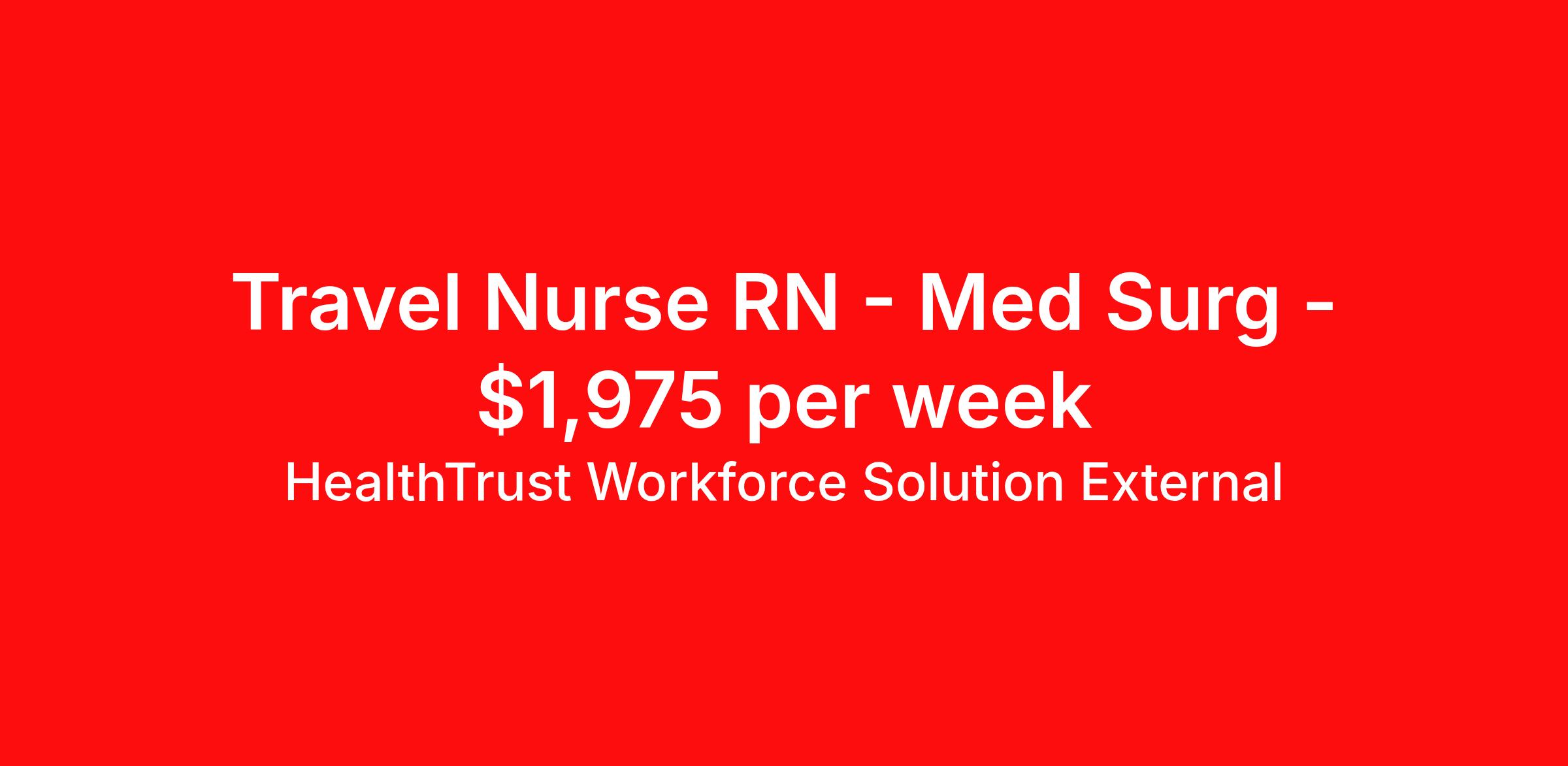 HealthTrust Workforce Solution External is seeking a travel nurse RN Med Surg for a travel nursing job in Natchez, Mississippi. Job Description & Requirements Specialty: Med Surg Discipline: RN Duration: 13 weeks 36 hours per week Shift: 12 hours, nights Employment Type: Travel JA3 Merit Health Natchez Travel Med Surg RN Duration: 13 weeks Shift: Nights (7:15p-7:15a) Requirements: BLS, PALS, perm address 50mi from facility