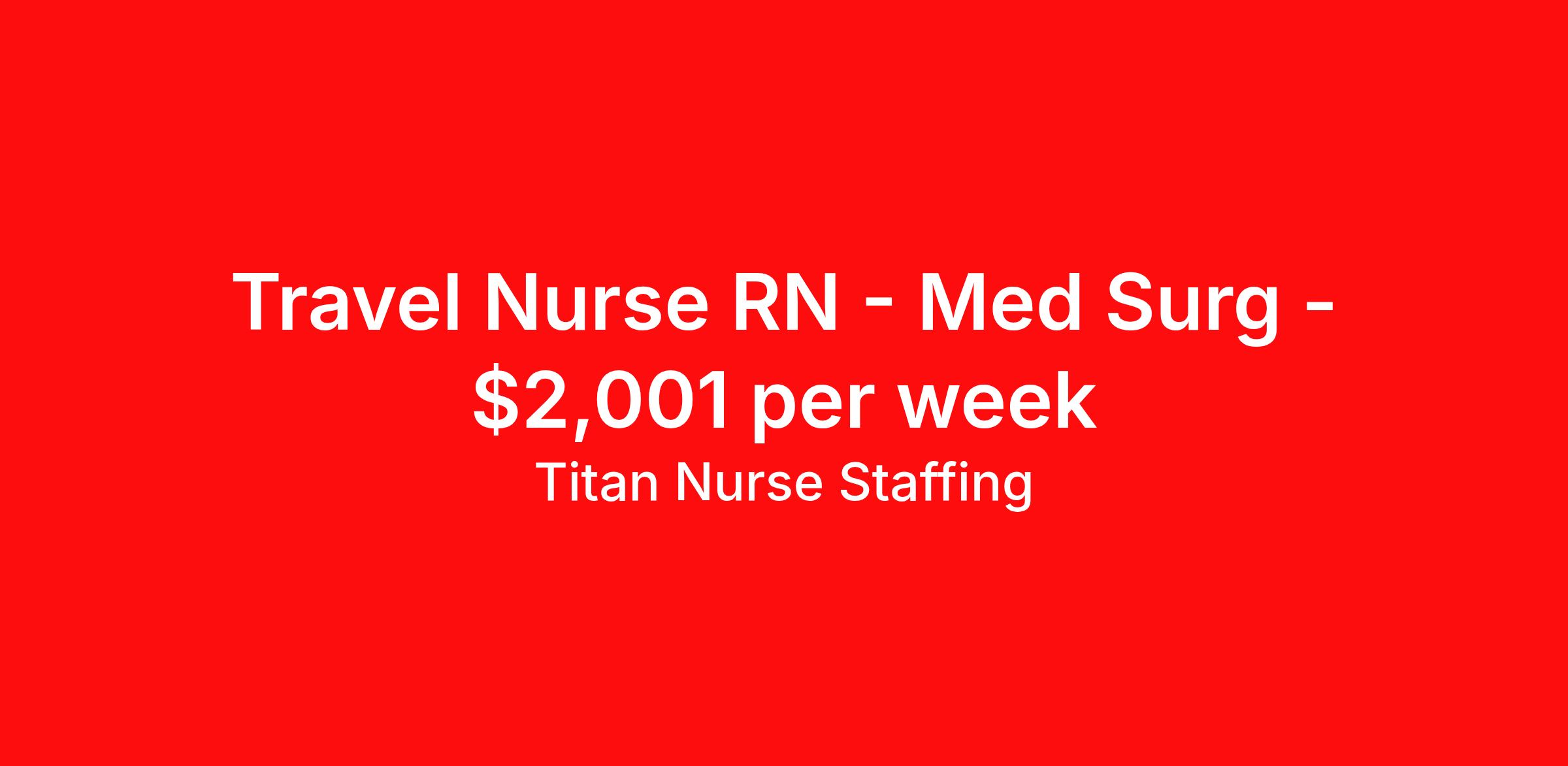 Titan Nurse Staffing is seeking a travel nurse RN Med Surg for a travel nursing job in Turtle Lake, North Dakota. Job Description & Requirements Specialty: Med Surg Discipline: RN Start Date: 03/30/2026 Duration: 13 weeks 36 hours per week Shift: 12 hours, nights Employment Type: Travel Health care professional needed for a Med Surg position in ND. Must have a minimum of 2 years experience as a Med Surg RN. We offer our clients the best in traveling medical professionals. The only way we can attract and maintain a good relationship with those professionals is to keep their best interests in mind. After all, our success relies on your success. That’s why we always put your best interests in mind — from superior placements to finding great living accommodations and negotiating a fair price to providing the tools you need for success. Titan Medical is one of the top medical staffing agencies because we provide superior support to our travelers every step of the way. About Titan Nurse Staffing We Take Care of You. While the availability of medical technicians and professionals becomes increasingly limited, there seems to be no shortage of staffing firms. That’s why Titan Medical works hard to distinguish itself through our responsiveness, our candidates and our attentiveness to your individual needs. When we say, “We take care of you.” We mean it – both to the medical professionals we represent and the healthcare organizations that rely on us for quality candidates. Founded by experienced medical professional recruiters and healthcare human resource professionals, Titan Medical was created as an alternative to other staffing resources. We found that by focusing on the needs of the individuals we served, we were able to attract higher quality candidates and clients in need of their services. It’s a risk that paid off, making Titan Medical one of the leading medical professional staffing firms in the country. Our candidates include the very best in the fields of radiation oncology, rehabilitation, respiratory care, radiology services, nursing and medical laboratory have to offer. Our clients represent the broad diversity of the healthcare industry today – from leading national and regional healthcare centers to traditional hospitals, specialty care clinics and other centers of care.
