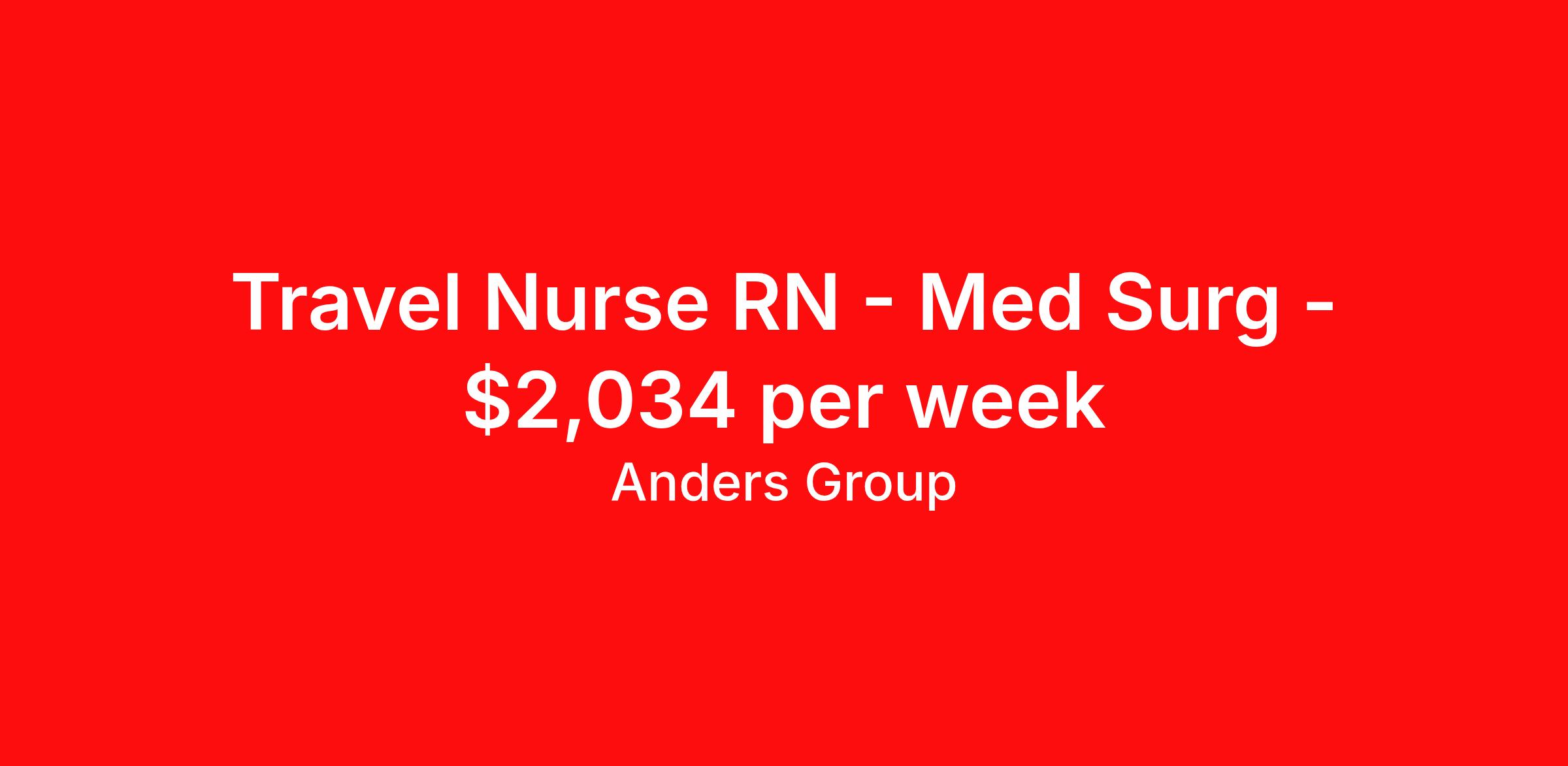 Anders Group is seeking a travel nurse RN Med Surg for a travel nursing job in Great Bend, Kansas. Job Description & Requirements Specialty: Med Surg Discipline: RN Start Date: 04/19/2026 Duration: 13 weeks 36 hours per week Shift: 12 hours, days Employment Type: Travel Anders Group Job ID 987144. Pay package is based on 12 hour shifts and 36 hours per week (subject to confirmation) with tax-free stipend amount to be determined. Posted job title: Registered Nurse Medical/Surgical About Anders Group WHY ANDERS? Anders Group is a Joint Commission accredited staffing agency and stands out from other agencies by our commitment to making sure our travelers are given the best customer service. Our team works hard to find the best jobs with the most aggressive rates! Anders Group offers rewarding assignments and competitive compensation packages, nationwide! We offer the following benefits from day one: Health Insurance, Including a Buy-up Option Dental Insurance Vision Insurance Life Insurance 401(k) Licensure Reimbursement Premium Pay Packages CEU Reimbursements Daily Per Diems Travel Reimbursements Rental Car Allowances Continuing Education Resources Referral Bonus And Many More! THE ANDERS DIFFERENCE You're committed to providing exceptional healthcare. We're committed to you. Anders Group was founded by a team of healthcare recruiters who had built strong relationships with healthcare facilities and professionals nationwide. As staffing firms shifted their focus to numbers and margins, these recruiters saw a need for a company to take a different approach to staffing. Anders Group was founded in 2010 to do just that. We focus on individual and facility goals to make quality placements. Great people working with great facilities make for the best placements. Through our focus on providing the best experience to Allied and Nursing health care professionals, Anders Group has grown to be a top staffing firm in Healthcare. We look forward to working with you! Benefits Medical benefits Dental benefits Vision benefits Life insurance 401k retirement plan License and certification reimbursement Continuing Education Referral bonus