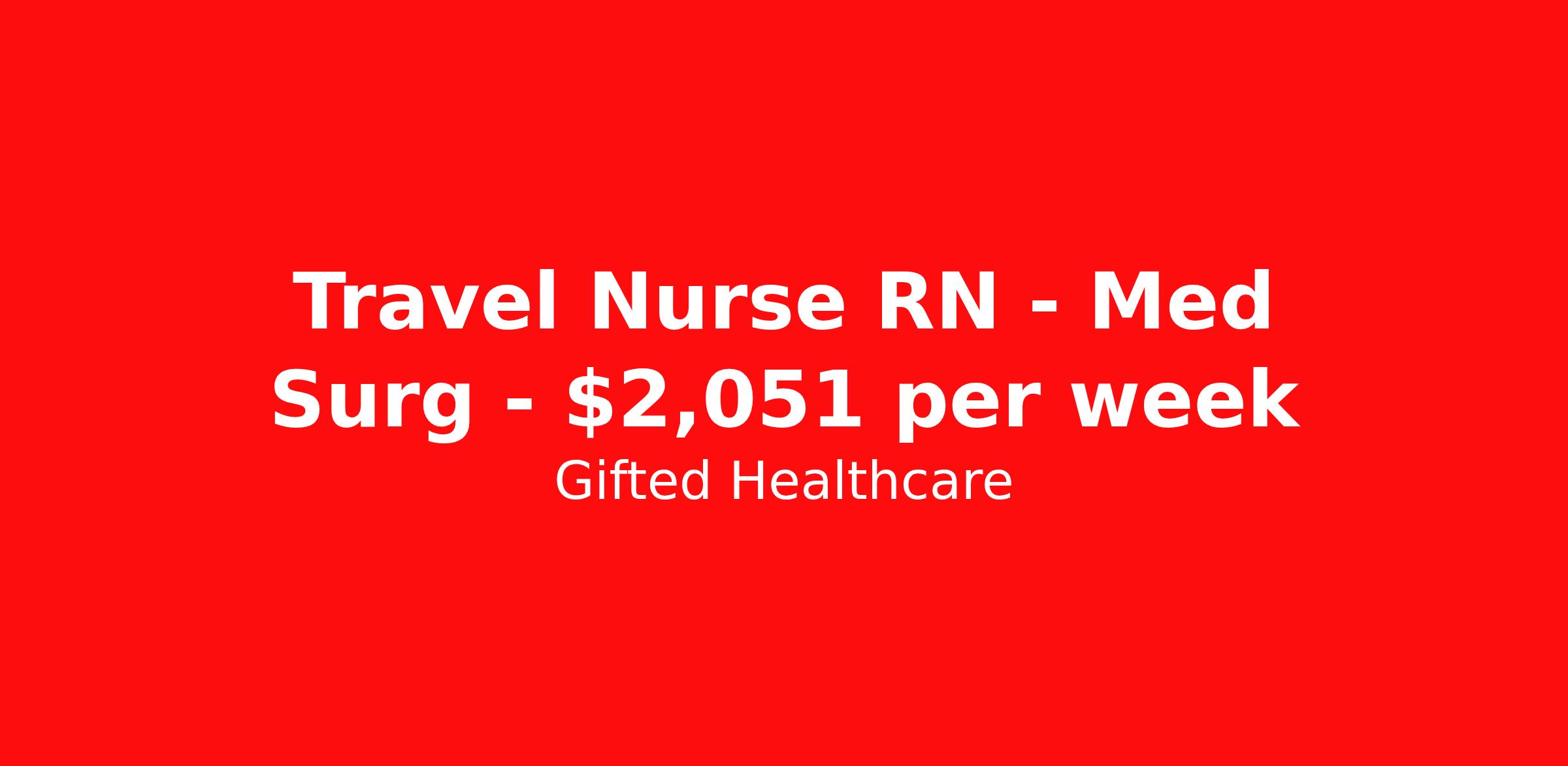 Gifted Healthcare is seeking a travel nurse RN Med Surg for a travel nursing job in Lafayette, Louisiana. Job Description & Requirements Specialty: Med Surg Discipline: RN Duration: 8 weeks 36 hours per week Shift: 12 hours, nights Employment Type: Travel Requirements • Minimum 2 years of RN experience in the United States • At least 2 years of recent MedSurg experience • Must reside 65 miles from the facility (no local candidates) Benefits • Guaranteed Pay: Paid even if a shift is canceled due to low census • Premium Overtime: Earn 2× your hourly rate for overtime on travel assignments (excludes local, PRN, CA, and government assignments) • Weekly Pay: Consistent weekly pay for easier financial management Gifted Healthcare Job ID 4340e. Pay package is based on 12 hour shifts and 36 hours per week (subject to confirmation) with tax-free stipend amount to be determined. About Gifted Healthcare Gifted Healthcare is an award-winning staffing agency that offers career opportunities to clinicians, healthcare leaders, and school-based professionals. Gifted provides Travel, Local, Per Diem, Government, and School-Based assignments as well as Interim Leadership services at premier facilities across the United States. We strive to elevate human connection in the delivery of care, and our team is committed to supporting you every step of the way in order to help you succeed on your terms. Joining Gifted comes with benefits like schedule flexibility, competitive pay, and the opportunity to gain valuable clinical experience in top-notch facilities. As a Gifted clinician, you can trust that we will invest in your career, fight for your well-being, and put your needs first. Apply with Gifted Healthcare today for access to exceptional job opportunities, day-one benefits, and 24/7 support. Our vision is to elevate the human connection in the delivery of care we provide to our clinicians. We serve your evolving needs through innovation, community, compassion, and service. Gifted is here for you every step of the way to help you succeed on your terms. Working with Gifted comes with benefits like schedule flexibility, competitive pay, and the opportunity to gain valuable clinical experience in top-notch facilities. Benefits Weekly pay Guaranteed Hours Pet insurance Wellness and fitness programs Referral bonus Medical benefits Dental benefits Vision benefits Benefits start day 1