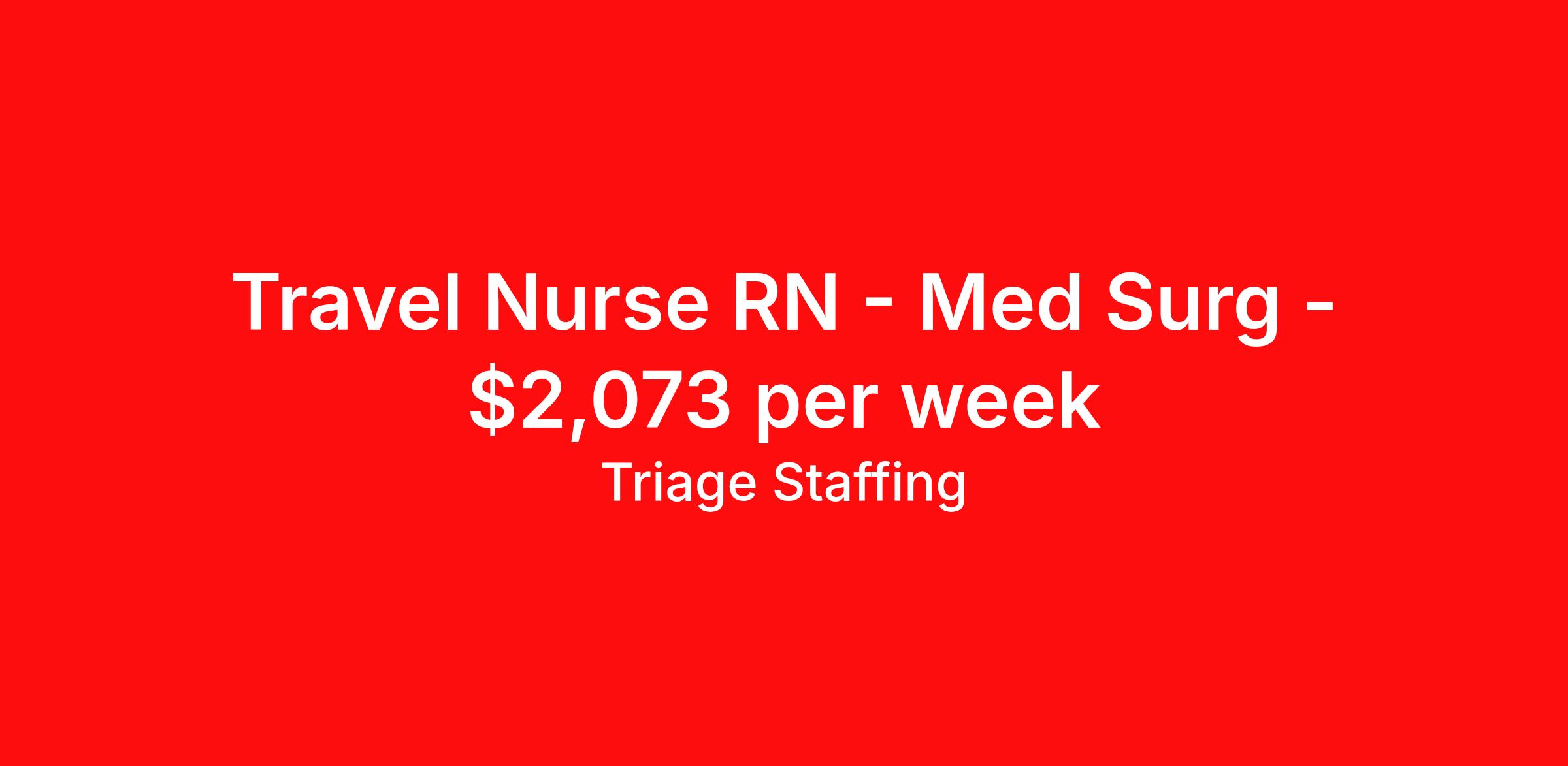 Triage Staffing is seeking a travel nurse RN Med Surg for a travel nursing job in Springfield, Illinois. Job Description & Requirements Specialty: Med Surg Discipline: RN Start Date: 04/13/2026 Duration: 13 weeks 36 hours per week Shift: 12 hours, nights Employment Type: Travel Travel Nursing: Med/Surg Springfield, IL Location: Springfield, IL Start Date: 4/13/2026 Shift Details: 12H Nights 36 hours per week Length: 13 WEEKS Apply for specific facility details.Med Surg RN Triage Staffing Job ID ACQEJUFF. Posted job title: Nursing: Med/Surg About Triage Staffing At Triage, we prefer to be real . Real about expectations—both ours and yours. Real about how a decision you make today could affect your tomorrows. Real about how compensation actually works. Real about how great—or grating—your next supervisor may be. Being real allows everyone at Triage to be ready . Ready to serve you with real honesty. So if that gig near the ocean is really no day at the beach, or that third shift comes with a second-class rate, we tell you. So you can be ready, too. We staff all five major divisions of acute care—nursing, lab, radiology, cardiopulmonary and rehab therapy, offering: - Competitive, custom pay packages - One point of contact for both travelers and facilities (per division) - A reliable recruiter who's got your back throughout your entire assignment - In-house compliance and accounting specialists - A clinical liaison team available 24/7 to offer medical and professional support and career development - A mentoring program that is run and managed by actual clinicians—yeah, you read that right - And more (because of course there’s more) Are we the biggest? No. Are we the best? That’s rather subjective, but we’re trying to be. Will we work like hell to get you as close to your idea of heaven as possible? Yes. Yes, we will. Benefits: Day One comprehensive, nationwide insurance plans for health, vision and dental and life—including a HSA option Day One 401(k) program with employer-matching contributions once eligible Facility cancelling protection—your time is money on and off-the-clock Guaranteed hours Weekly paychecks via direct deposit Earned vacation bonuses for time worked Paid holidays Employee assistance program (EAP)—your mental health is important, too Continuing education, certification and licensing reimbursement Workers comp—because accidents happen Top-rated professional liability insurance Company provided housing options Referral bonus—$750 in your pocket after they’ve completed a 13-week assignment