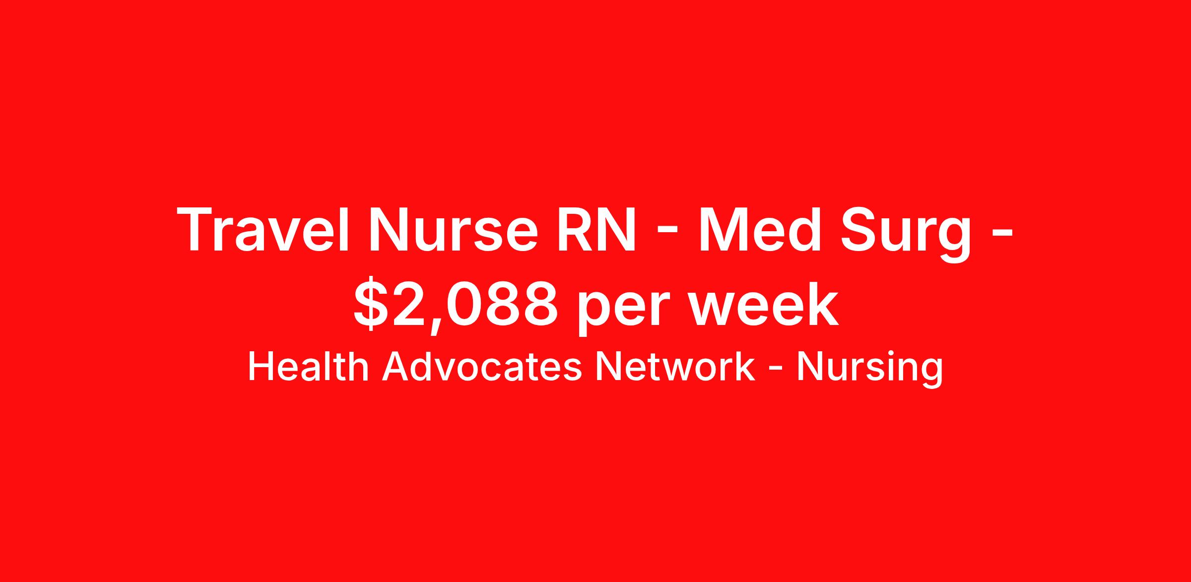 Health Advocates Network - Nursing is seeking a travel nurse RN Med Surg for a travel nursing job in Great Falls, Montana. Job Description & Requirements Specialty: Med Surg Discipline: RN Start Date: ASAP Duration: 13 weeks 40 hours per week Shift: 8 hours, days Employment Type: Travel RN – Medical Surgical Registered Nurse - Health Advocates Network is urgently hiring Medical Surgical RNs with at least 2 years of recent experience! IMMEDIATE STARTS! Travel packages up to $2088 weekly Shift: 12 hour DAY shifts available 13 week contracts available Specialty: Medical Surgical Registered Nurse (RN) Requirements: Active MT Or compact State Registered Nurse License Valid BLS Graduate of an Accredited School of Nursing Additional certifications may be required Benefits We Offer: Competitive pay rates, Referral Bonus, Medical, Dental and Vision. Travel reimbursement and per diem allowances, Employee discounts, educational opportunities, and more! To apply for this job now or to find out more about other opportunities with Health Advocates Network, Inc. reply to this posting, contact us at or call/text XXX-XXX-XXXX. We can provide you unparalleled access to exciting career opportunities. Health Advocates Network, Inc . is an equal opportunity employer. All qualified applicants shall receive consideration for employment without regard to any legally protected basis protected by applicable federal or state law except where a bona fide occupational qualification applies. Refer a Registered Nurse for a $XXX.00 bonus opportunity! HANStaff Job ID 517573. Pay package is based on 8 hour shifts and 40 hours per week (subject to confirmation) with tax-free stipend amount to be determined. Posted job title: RN - Med-Surg About Health Advocates Network - Nursing Health Advocates Network was founded on the basis of a shared aspiration, to improve the way healthcare staffing is done. We are a company established and led by nurses. Our flexible approach enables us to develop solutions customized to your specific needs. From short- and long-term travel contracts to local and per diem assignments and more, we are here to get you to your next adventure! By solving challenges, providing the best placements, and advocating for you, we stand to help you thrive and pave the path forward in your career. Click on the videos below to learn more about our values!