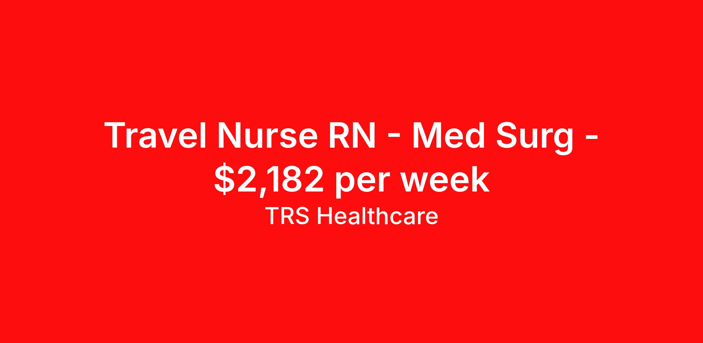 TRS Healthcare is seeking a travel nurse RN Med Surg for a travel nursing job in Springfield, Illinois. Job Description & Requirements Specialty: Med Surg Discipline: RN Start Date: 04/13/2026 Duration: 13 weeks 36 hours per week Shift: 12 hours, nights Employment Type: Travel TRS Healthcare Job ID 1445043. Pay package is based on 12 hour shifts and 36 hours per week (subject to confirmation) with tax-free stipend amount to be determined. Posted job title: Medical Surgical Registered Nurse About TRS Healthcare TRS Healthcare has been a leader in the healthcare staffing industry for over 25 years, providing exceptional career opportunities for travel nurses and allied health professionals. An RN-founded, woman-owned company, TRS Healthcare has team members in all 50 states. We recruit and support registered nurses, licensed practical nurses, surgical technicians, respiratory therapists, imaging technologists, laboratory specialists, and other experienced nursing and allied healthcare professionals. We staff hundreds of healthcare facilities across the U.S. in urban, rural, and underserved areas, including multi-state hospital systems, critical access hospitals, rural community hospitals, long-term care facilities, trauma centers, standalone clinics, and more. Learn more about TRS Healthcare at trshealthcare.com .