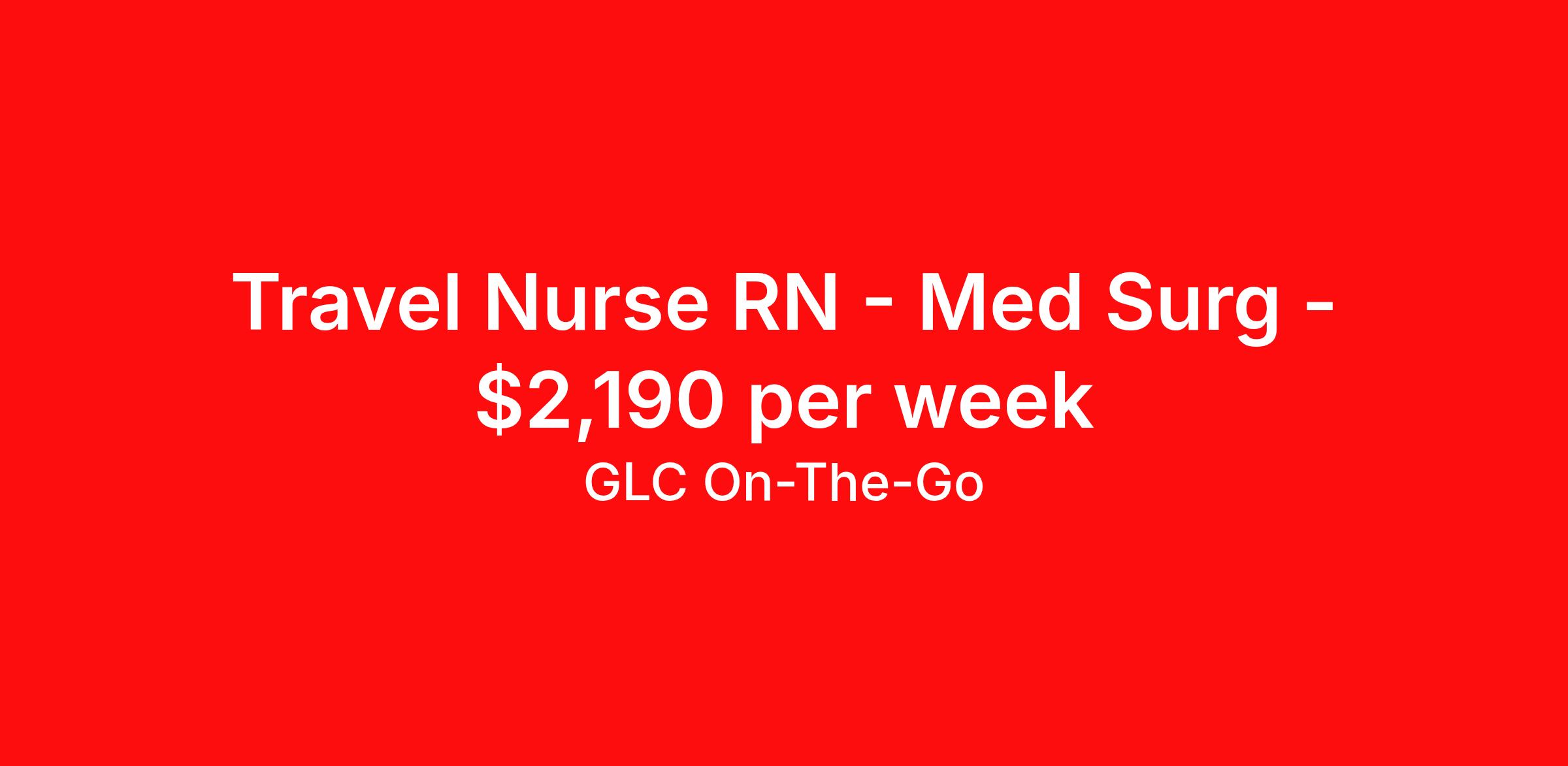 GLC On-The-Go is seeking a travel nurse RN Med Surg for a travel nursing job in Danvers, Massachusetts. Job Description & Requirements Specialty: Med Surg Discipline: RN Start Date: 04/06/2026 Duration: 13 weeks 36 hours per week Shift: 12 hours Employment Type: Travel GLC is hiring: RN Clinic - Danvers, MA - 26-week contract GLC – Named Best Nurse Agency 2024–2025 We connect nurses, nursing professionals, and allied health professionals like you to contracts that align with your skills, schedule, and career goals. About this Assignment Join the care team in Clinic where you’ll provide patient-centered care in a collaborative environment. Typical responsibilities include direct patient care, timely documentation, and coordination with the care team. Specific duties will be confirmed during your interview with a recruiter. Assignment Details Location: Danvers, MA Assignment Length: 26 weeks Start Date: 04/06/2026 End Date: 10/03/2026 Pay Range: $1,971 - $2,190 Minimum Requirements Active license in Clinic 1 year full-time RN, Clinic experience within the last 2 years What you can expect from GLC Weekly on-time pay with direct deposit Transparent communication, clear assignment details, and recruiter support from start to finish - or extension Referral bonus up to $500 Health, dental, and vision insurance 401(k) plan Completion and signing bonuses may also be available Ready to move forward? Apply now and start your rewarding journey with GLC - a recruiter will connect quickly to review pay , start date , and assignment details so you can make the best decision for your next contract. GLC On-The-Go Job ID 503833. Pay package is based on 12 hour shifts and 36 hours per week (subject to confirmation) with tax-free stipend amount to be determined. Posted job title: Registered Nurse About GLC On-The-Go GLC is more than just a staffing agency – we’re your trusted partner in finding travel, local, and PRN contracts that align with your career aspirations and lifestyle. We specialize in connecting travel nurses and allied healthcare professionals like you with opportunities in acute care, long-term care, behavioral health, and allied fields across the U.S. Our attentive and friendly recruiters are always just a call or text away, ready to guide you at every step, ensuring you feel valued and heard. We understand the unique needs of travel healthcare professionals, which is why we offer comprehensive benefits and 24/7 support. Join GLC, where our 20 years of experience mean we know how to help you find the assignments that turn your career goals into reality. With us, it's not just a placement – it's your dream career made possible