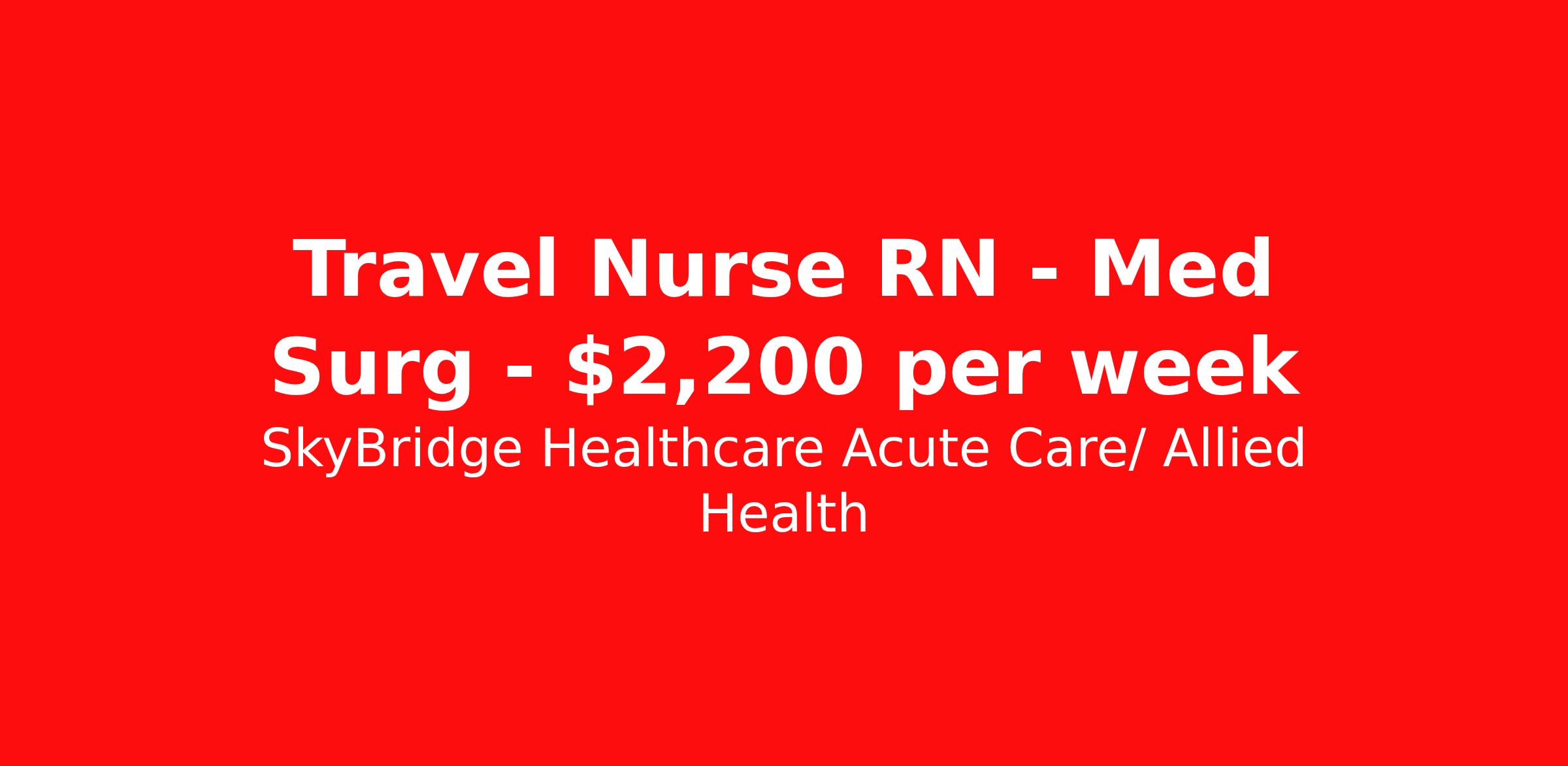 SkyBridge Healthcare Acute Care/ Allied Health is seeking a travel nurse RN Med Surg for a travel nursing job in Rockford, Illinois. Job Description & Requirements Specialty: Med Surg Discipline: RN Duration: 13 weeks 36 hours per week Shift: 12 hours, days Employment Type: Travel SkyBridge Healthcare Acute Care/ Allied Health Job ID NV0806H. Pay package is based on 12 hour shifts and 36 hours per week (subject to confirmation) with tax-free stipend amount to be determined. About SkyBridge Healthcare Acute Care/ Allied Health It is our mission at SkyBridge Healthcare to connect professionals within the healthcare community through both genuine relationships and quality work. We understand the demands of healthcare positions which is why we want to give back to Healthcare Professionals who give so much to their communities. We’re partnered with some of the greatest facilities in the nation, therefore we ensure our Healthcare Professionals will receive top-notch treatment every step of the way. Our specialties include Nursing, Allied Health, Laboratory, Therapy, Healthcare Information Technology, and Revenue Cycle. Follow us on social media to stay in the know of our latest company updates and job postings. Benefits Weekly pay Holiday Pay Guaranteed Hours Vision benefits 401k retirement plan License and certification reimbursement Mileage reimbursement Referral bonus Employee assistance programs Medical benefits Life insurance Dental benefits