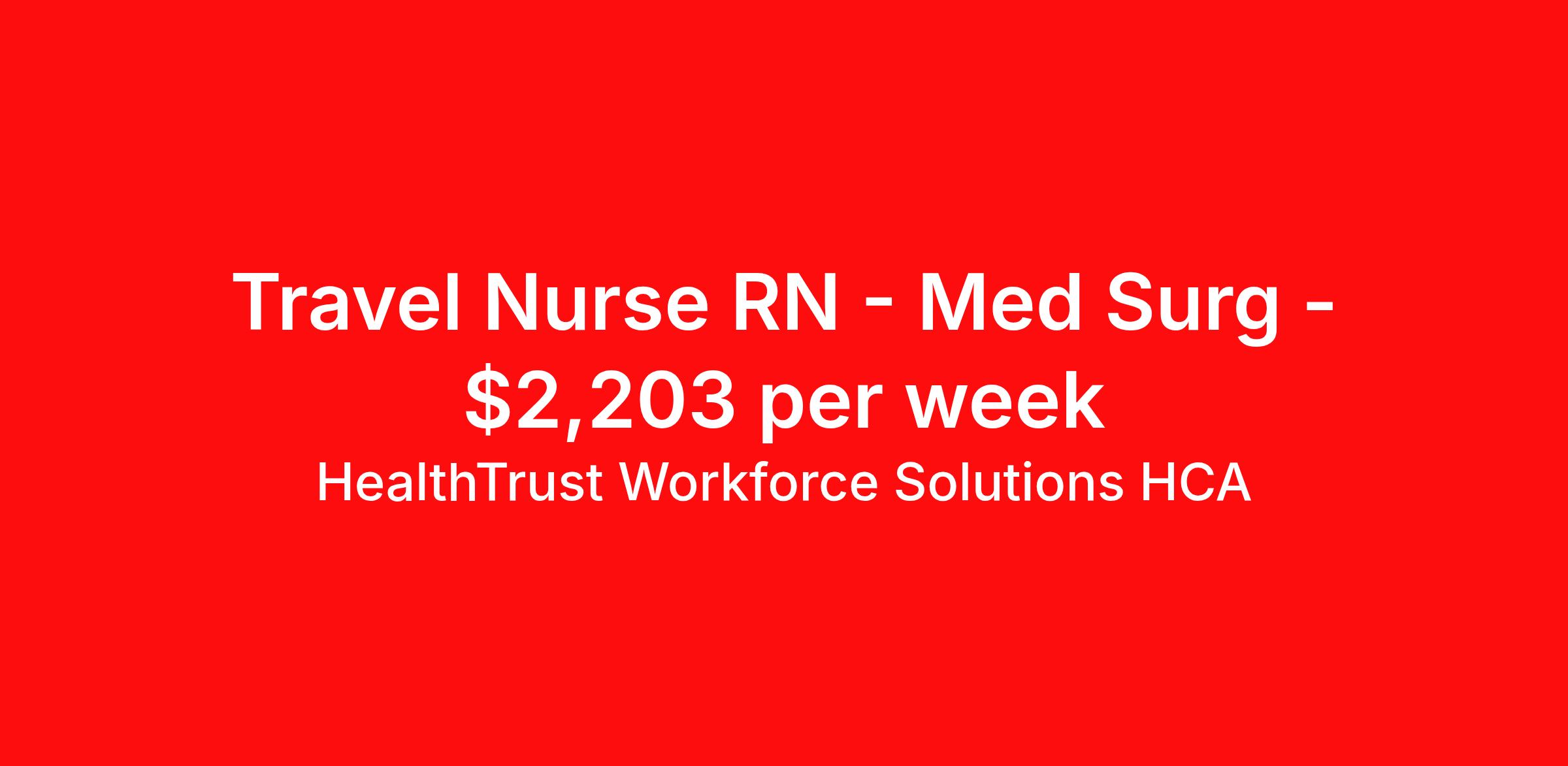 HealthTrust Workforce Solutions HCA is seeking a travel nurse RN Med Surg for a travel nursing job in Carlsbad, New Mexico. Job Description & Requirements Specialty: Med Surg Discipline: RN Start Date: 04/13/2026 Duration: 13 weeks 36 hours per week Shift: 12 hours, days, nights Employment Type: Travel About HealthTrust Workforce Solutions HCA At HealthTrust Workforce Solutions, healthcare is not just about the four walls of a facility but about the people who provide and receive care. Our focus is on empowering healthcare professionals to deliver exceptional patient experiences by providing them with the necessary skills, tools, and support. We partner with healthcare facilities nationwide to ensure that the right professionals are in the right roles. We prioritize our clinicians by giving them a voice and access to opportunities to fulfill their mission of improving lives by providing quality patient care. We are committed to our core values of Trust, Innovation, Adaptability, Courage, and Accountability. We are dedicated to positively impacting the healthcare industry by providing first-priority access to more than 200,000 jobs nationwide to our healthcare professionals. Join us and be part of the HealthTrust family, where you can make a difference every day. We embrace our changing environment, and we maintain a culture that has a rich tradition of transforming itself to meet the challenges of the future. MISSION STATEMENT While putting great people in the right roles is essential, our mission is far greater. We want our clinicians to be part of the HealthTrust family, where healthcare professionals have a voice and are empowered with the right tools and opportunities to fulfill their personal mission of improving lives. Plus, as a preferred partner to thousands of top-performing hospitals, we provide our healthcare professionals with first-priority access to more than 200,000 jobs nationwide. Benefits Dental benefits Vision benefits Referral bonus Continuing Education Life insurance