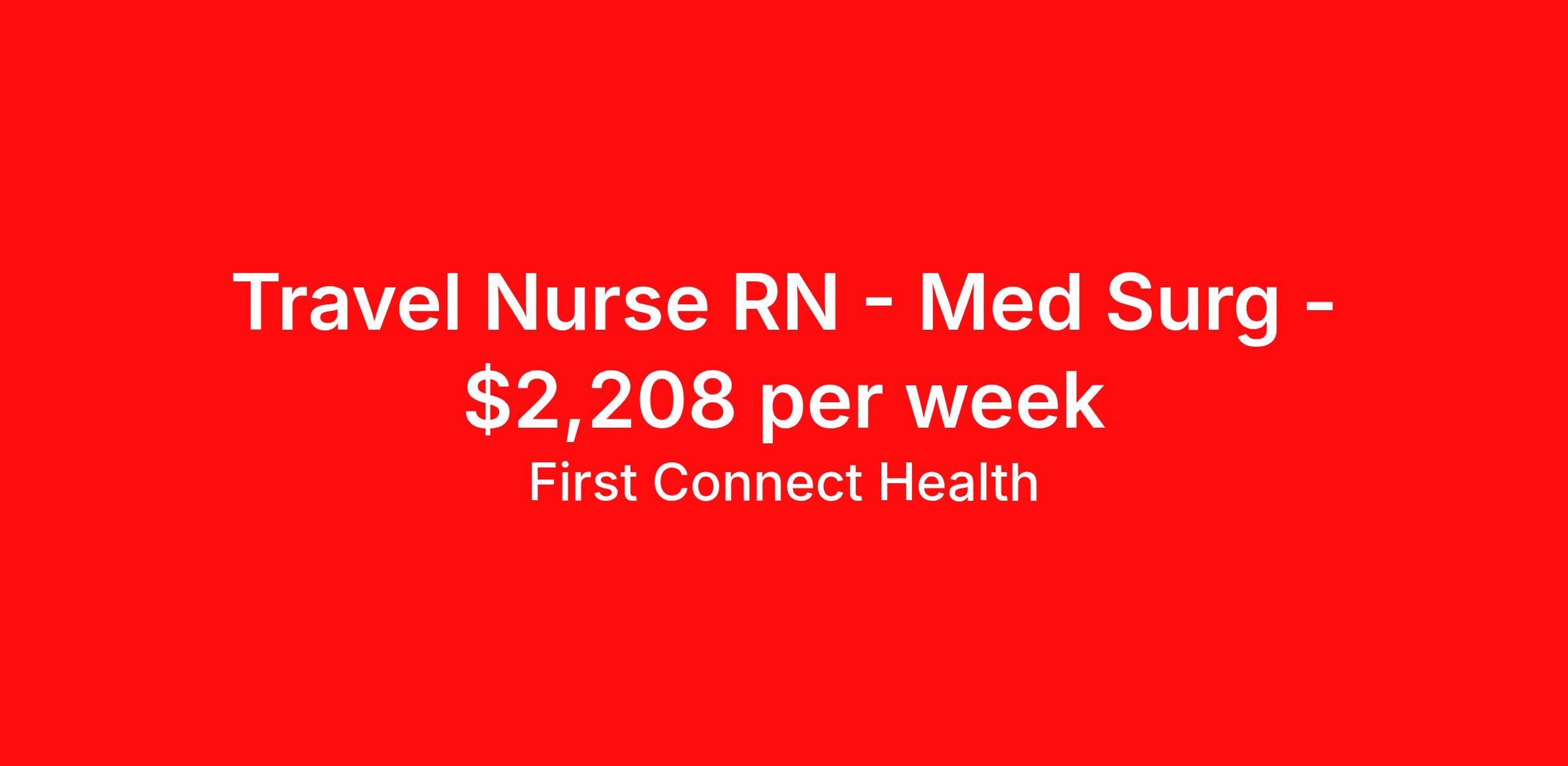 First Connect Health is seeking a travel nurse RN Med Surg for a travel nursing job in King City, California. Job Description & Requirements Specialty: Med Surg Discipline: RN Start Date: 04/13/2026 Duration: 13 weeks 36 hours per week Shift: 12 hours, nights Employment Type: Travel Med-Surg RN Opportunity Requirements: • Minimum 2 years of experience • BLS & ACLS certifications required • Active California State RN License About First Connect Health At First Connect Health , we take pride in being a Joint Commission–certified healthcare staffing agency , headquartered in Newark, New Jersey. This prestigious certification is more than just a seal — it's a reflection of our commitment to excellence, safety, and quality in everything we do. By meeting the rigorous standards set by The Joint Commission, one of the most respected accrediting bodies in healthcare, we've demonstrated that our processes, compliance, and patient care standards are aligned with the highest levels of quality in the industry. But our dedication goes beyond certifications. Nurses choose First Connect Health because: ✅ Trust and Transparency: We foster honest communication, timely updates, and full transparency throughout your placement journey. ✅ Best Pay & Benefits: We offer industry-leading compensation packages, along with benefits that support your career goals. ✅ Flexibility & Choice: Whether you're seeking short-term assignments, long-term contracts, or local opportunities, we provide the flexibility to suit your preferences. ✅ Personalized Support: Our recruiters take the time to understand your needs, guiding you with care, respect, and responsiveness at every step. When you work with First Connect Health, you're not just another number — you're a valued professional. Join a team that’s focused on your success, your well-being, and your future in healthcare. Benefits Medical benefits Sick pay 401k retirement plan Weekly pay Referral bonus
