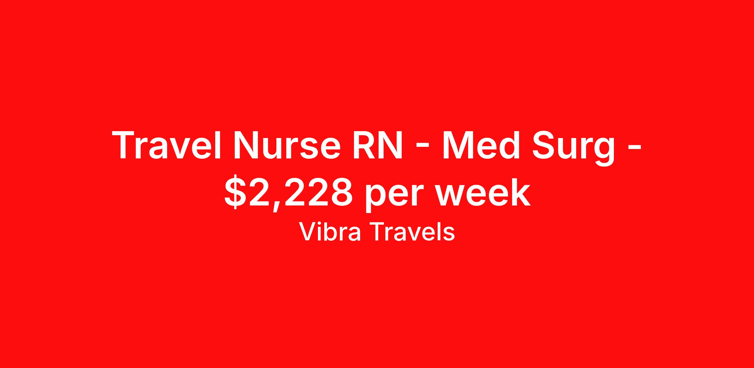Vibra Travels is seeking a travel nurse RN Med Surg for a travel nursing job in Bridgeton, Missouri. Job Description & Requirements Specialty: Med Surg Discipline: RN Duration: 13 weeks 36 hours per week Shift: 12 hours, nights Employment Type: Travel VIBRA TRAVELS is looking for a CORPORATE TRAVEL REGISTERED NURSE to join our team. We look for nurses with acute care experience in ICU, step down, med surg/tele, and acute rehab. Benefits/Perks of working with VIBRA TRAVELS: • Work with 1 recruiter from start to finish and assignment to assignment • Local and Non-local positions available • Competitive hourly rate in addition to tax-free stipend (if applicable) • No pay cuts mid-contract • Referral bonus (up to $1000 per referral!) • License reimbursement if traveling to new state where new license is required • Your pick of assignments at facilities we own and operate nationwide (70) or partner facilities Qualifications/Skills: • Current BLS certification from a Vibra-approved vendor required. • Additional certifications may be required by Vibra Travels (ex ACLS, PALS, NRP) • 1 full year of RN experience; Diploma or Associate of Science Degree in Nursing required. Current, valid, and active license to practice as a Registered Nurse in the state of employment required. Additional Qualifications/Skills: • Previous acute care experience is strongly preferred. • Ability to project a professional image. • Knowledge of regulatory standards and compliance requirements. • Strong organizational, prioritizing and analytical skills. • Ability to make independent decisions when circumstances warrant. • Working knowledge of computer and software applications used in job functions. • Freedom from illegal use of and effects of use of drugs and alcohol in the workplace Per Federal Health Care Worker Vaccine Requirements, all employees must be fully vaccinated against COVID-19 or be approved for a valid religious or medical exemption. Anyone hired by the company must provide proof of their COVID-19 vaccine before they can begin employment or request and be approved for a valid religious or medical exemption. Unvaccinated employees on an approved exemption must submit to weekly COVID-19 testing and wear a respirator at all times while in the facility. Some states and locations require increased frequency testing pursuant to state regulations. Vibra Travels Job ID 20251023-17. Pay package is based on 12 hour shifts and 36 hours per week (subject to confirmation) with tax-free stipend amount to be determined. About Vibra Travels Regardless of the placement you’re seeking, you’ll experience the same great benefits when choosing Vibra Travels for your next contract. White-glove service, every step of the way: At Vibra Travels, we believe in providing top-notch service to our travel nurses. From the moment you first contact us, you’ll experience a level of support and care that sets us apart from the rest. Your recruiter, your partner: Unlike other travel nursing agencies, we believe in building one-on-one relationships with our clinicians. Your dedicated recruiter will be your advocate, guiding you through the entire process and ensuring your needs are met. Clinical support at your fingertips: We understand that being a traveler can sometimes be challenging. That’s why we have a dedicated clinical support team available to answer any questions or concerns you may have during your assignments. Nationwide placements, endless opportunities: With Vibra Travels, you’ll have access to placements across the nation. Whether you’re looking for an acute care, rehabilitation, critical care, or behavioral health hospital, we have opportunities waiting for you in every corner of the country. Join us today and experience traveling done different! Benefits Holiday Pay License and certification reimbursement Medical benefits Referral bonus